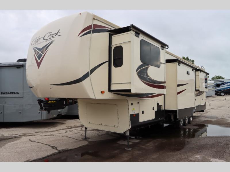 Are you ready for some time away from home where you can enjoy bringing an off-road toy to play outdoors with during the day, and then coming back to the comforts of your fifth wheel at night? Well then come check out this Cedar Creek Silverback 37RTH toy hauler fifth wheel by Forest River. You can store your dirt bikes in the garage, then lower the queen bed to get a good nigh'ts rest. You will enjoy fixing meals for your family in the large kitchen area plus there is an island with a double sink and a 18 cu. ft. stainless steel electric refrigerator for your perishables. In the evenings come relax in the comfortable front living area which features an electric fireplace and an entertainment center. One thing that this model is not lacking on is space, with five slide outs there is plenty of room for your family to camp comfortably!