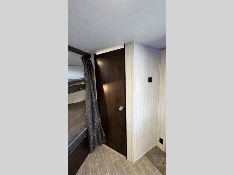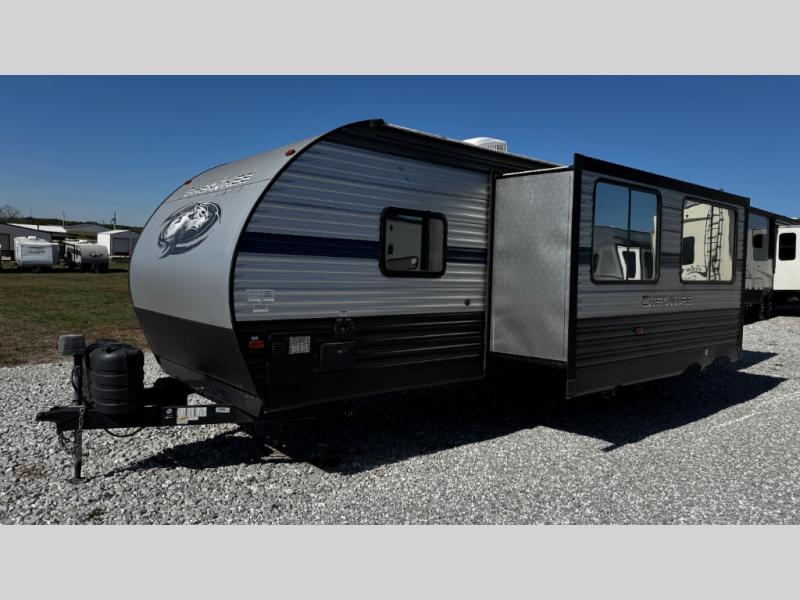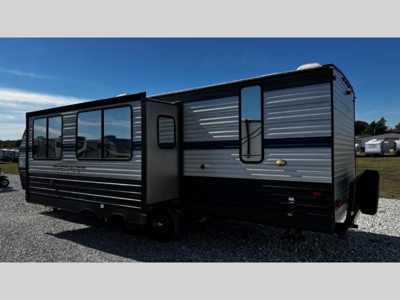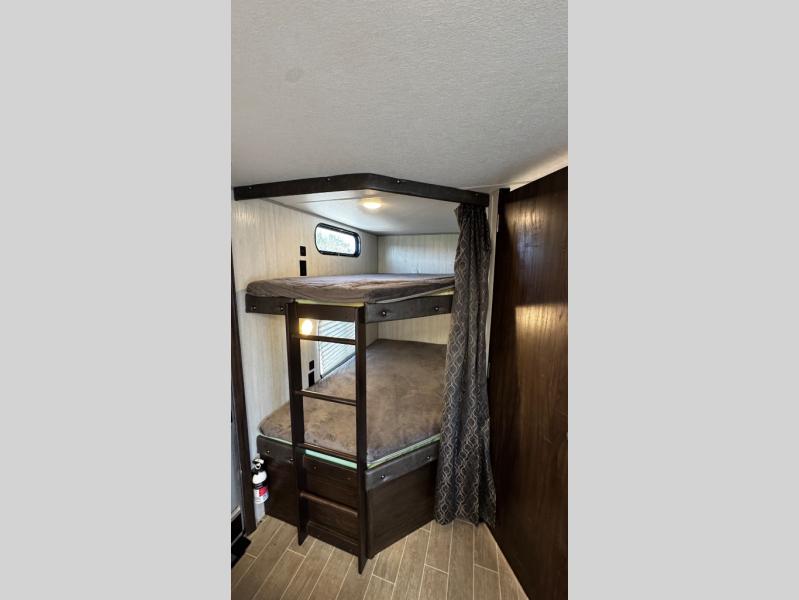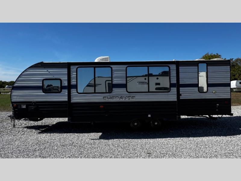 This Cherokee travel trailer can certainly house a bunch of campers looking for a fun weekend getaway! With double-size bunks, a queen-size bed, plus a sofa and a U-shaped dinette, you will have easy sleeping for ten! So gather the family and a few extra friends and head out for a great time to explore, relax, and just simply enjoy! You will find the large slide out provides a nice amount of space in the main living/dining area, and the private bedroom features its own exterior entrance door. You will also find that this unit provides loads of storage for your gear and necessities both inside and out!