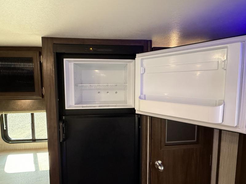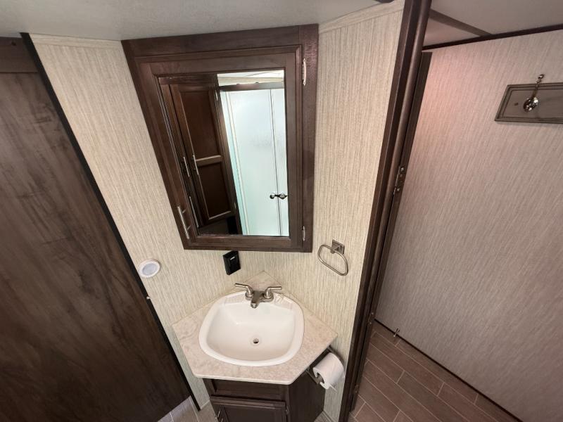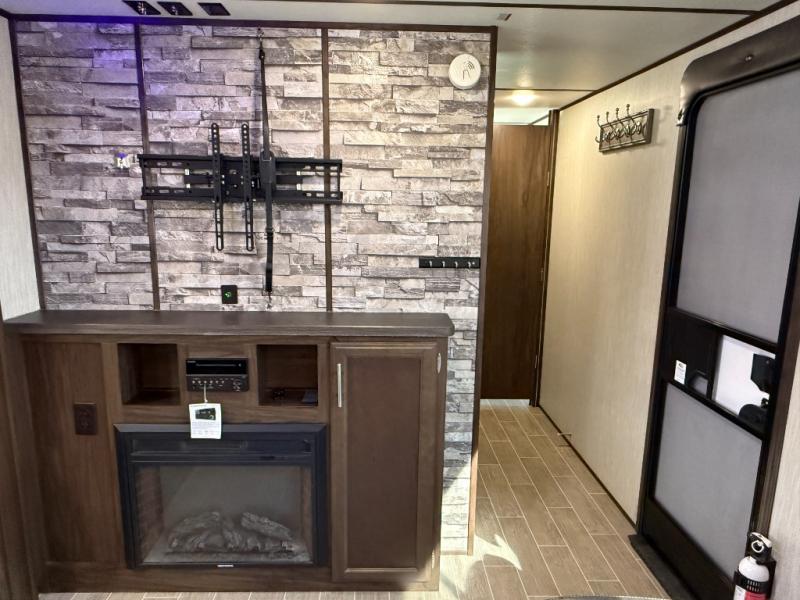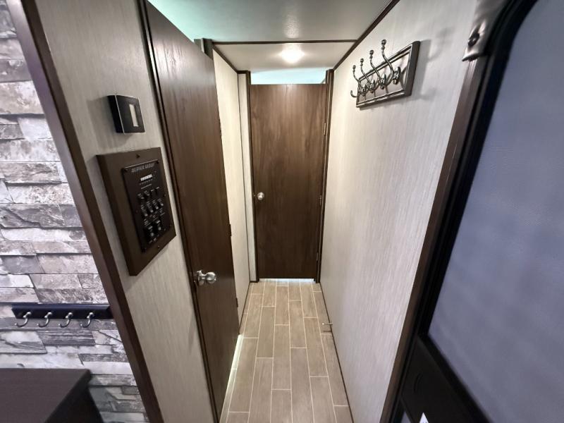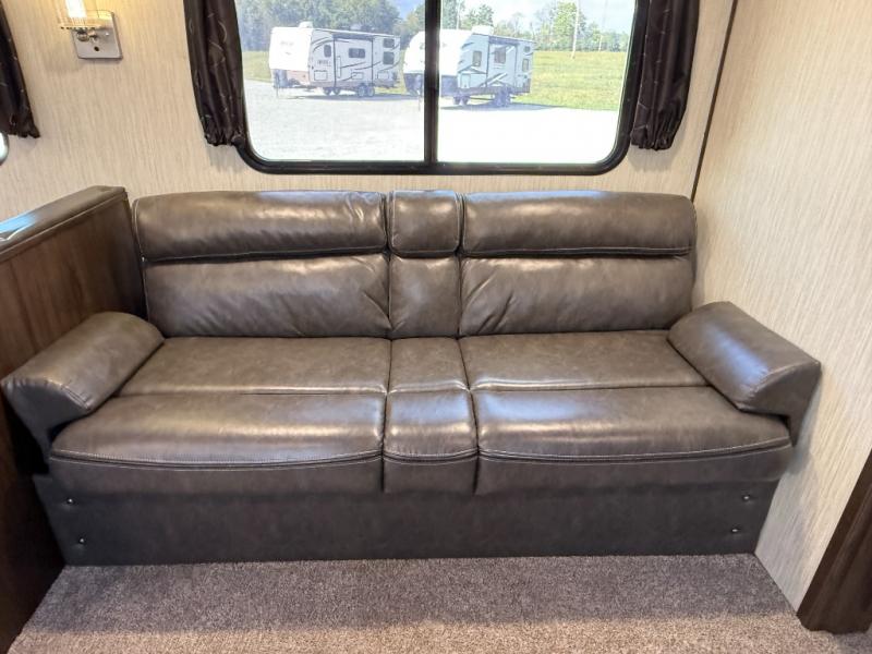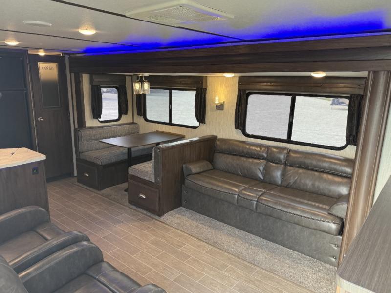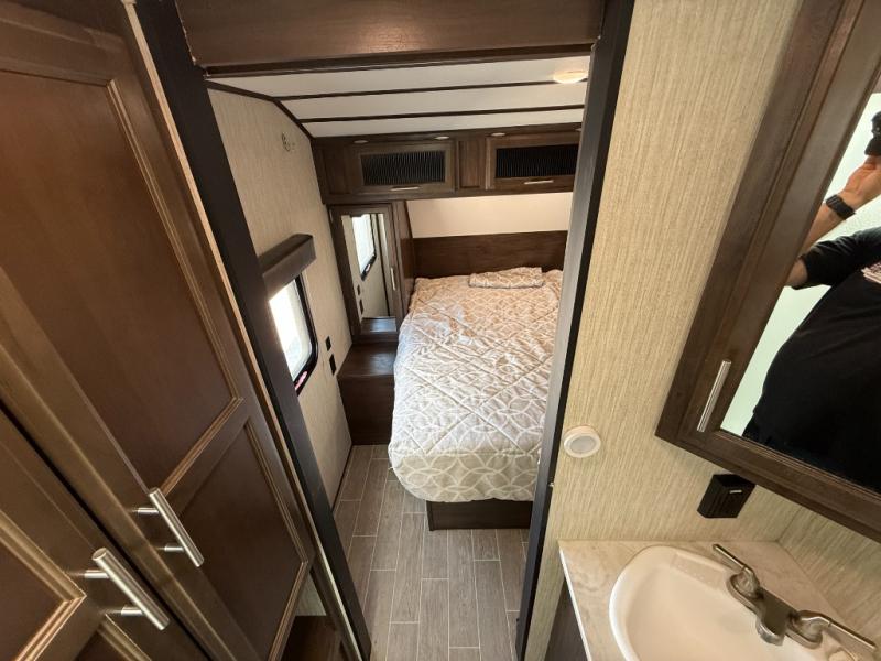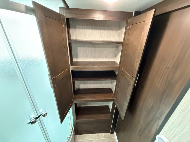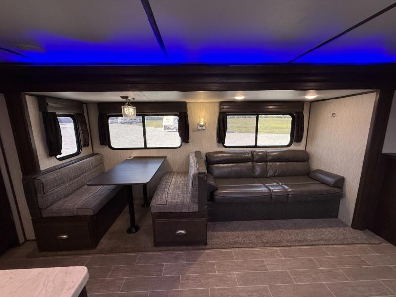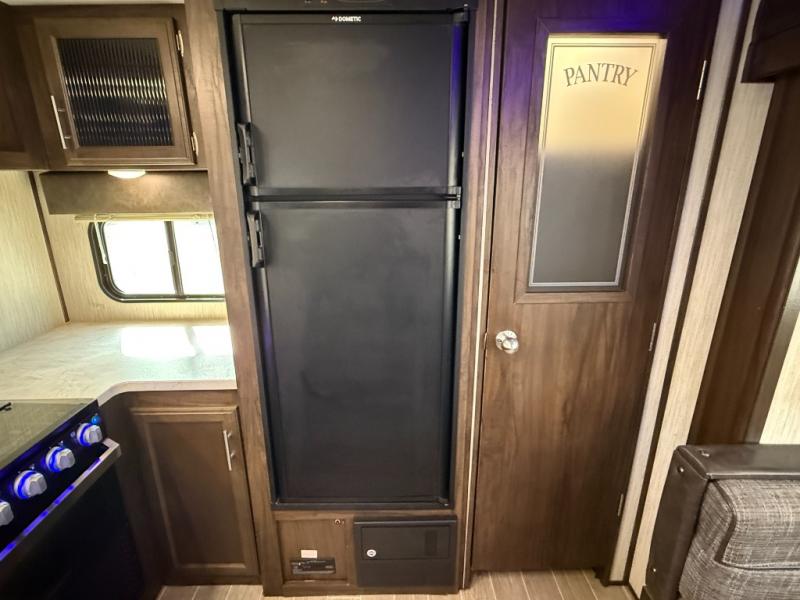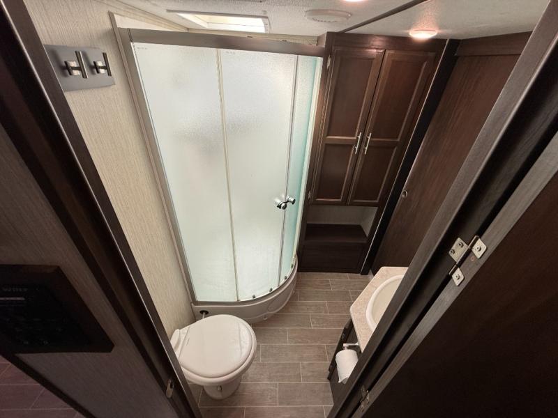 This Cherokee Alpha Wolf travel trailer is excellent for a smaller family or group of individuals who are looking to explore the country without losing the comforts of home. With a full kitchen and large pantry, you will find it easy to prepare dinner each evening, and the single slide that houses the booth dinette and sofa give you extra space to sit and chat with the chef. You will achieve complete relaxation on the queen-size bed in the front master suite, and the private bathroom entrance will allow you to quickly and conveniently get ready each morning.