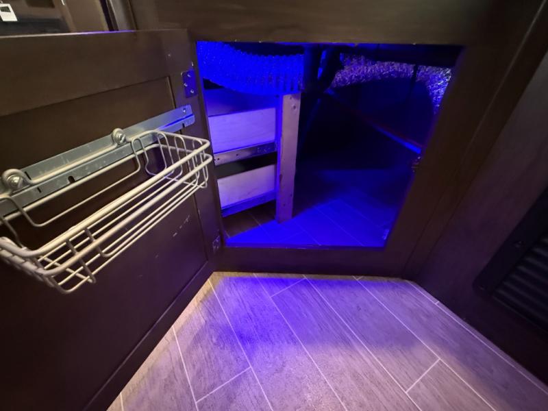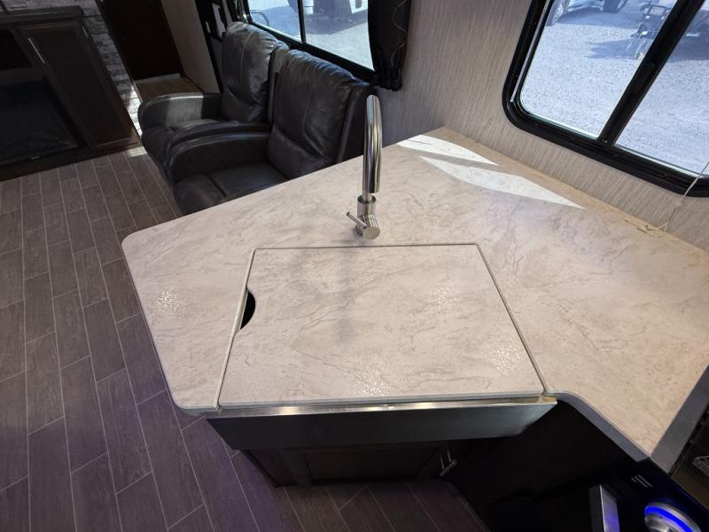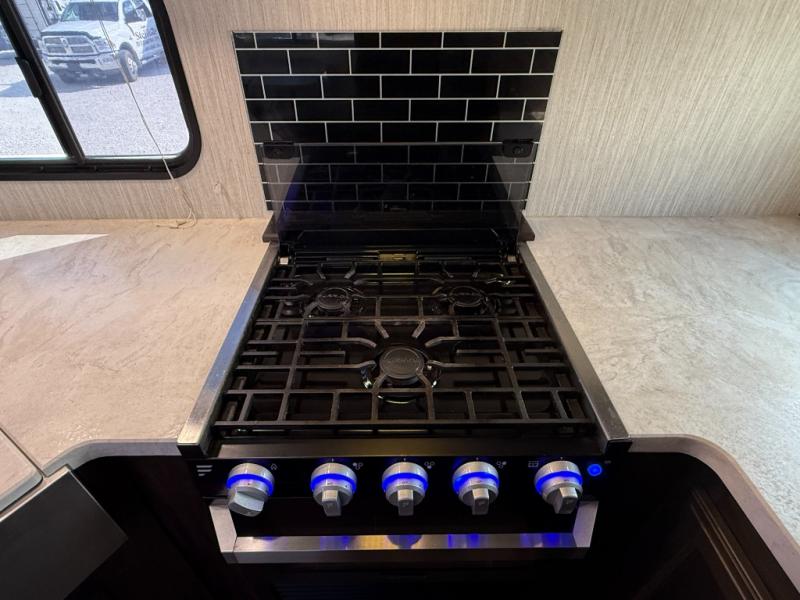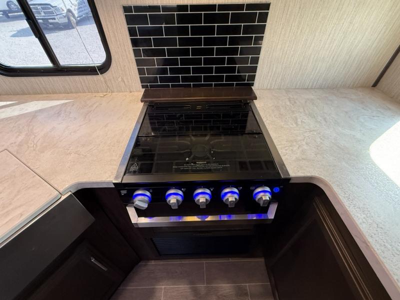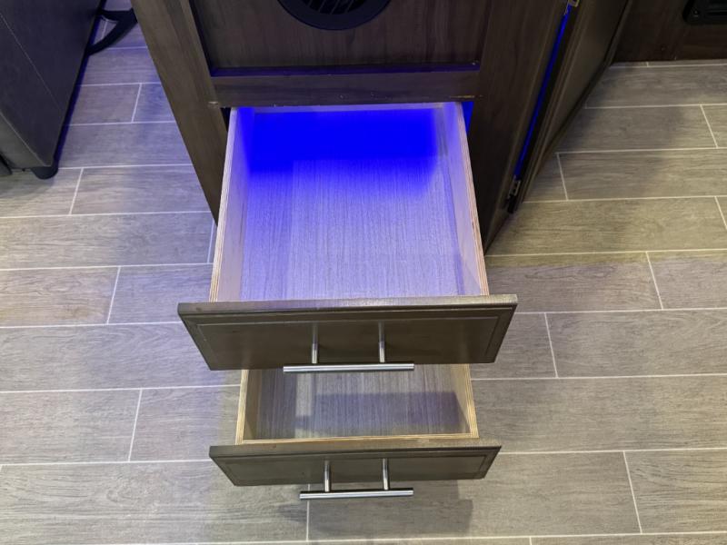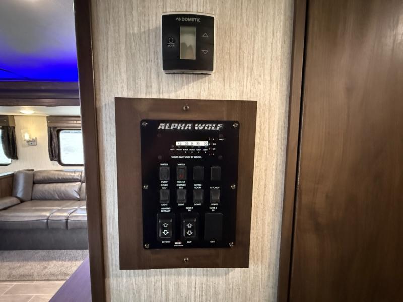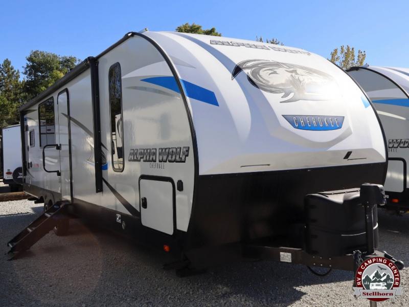 The Cherokee Alpha Wolf travel trailer is the first of Cherokee's line up to be fully laminated, which makes it lightweight, well insulated, and able to provide a sleek and modern exterior. The tire pressure monitoring system and exterior shower with hot and cold water add to the usefulness and value of the Alpha Wolf, and the LED lighting on both the exterior and interior delivers a bright and cheerful atmosphere no matter what time of day it is. Inside of the Alpha Wolf you will find blackout kitchen appliances in the kitchen and plenty of storage for your pots and pans underneath the sink.