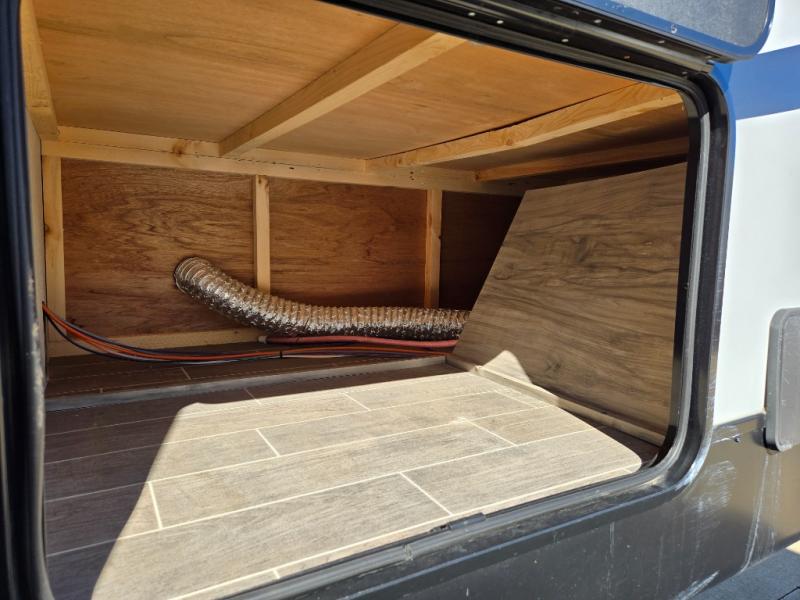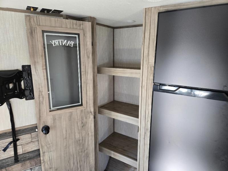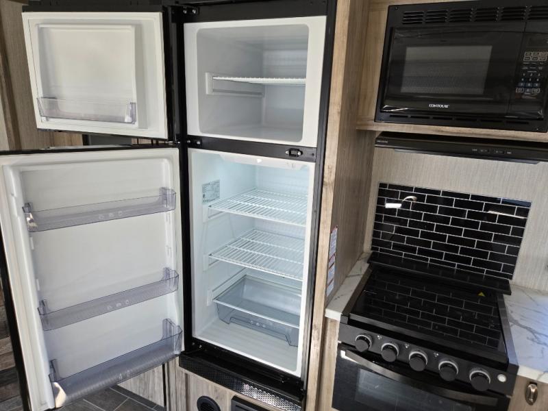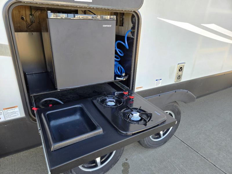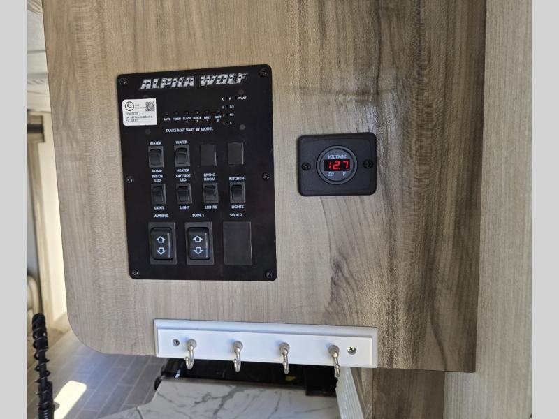 The Cherokee Alpha Wolf travel trailer is the first of Cherokee's line up to be fully laminated, which makes them lightweight, well insulated, and able to provide a sleek and modern exterior. The tire pressure monitoring system and exterior shower with hot and cold water add to the usefulness and value of the Alpha Wolf, and the LED lighting on both the exterior and interior delivers a bright and cheerful atmosphere no matter what time of day it is. Inside of the Alpha Wolf you will find blackout kitchen appliances in the kitchen and plenty of storage for your pots and pans underneath the sink.