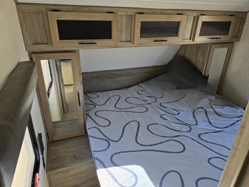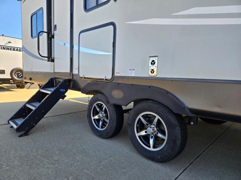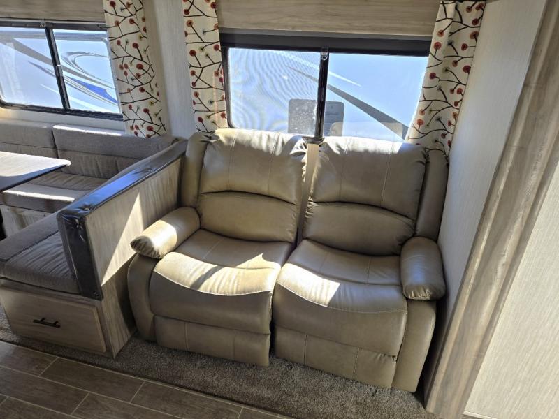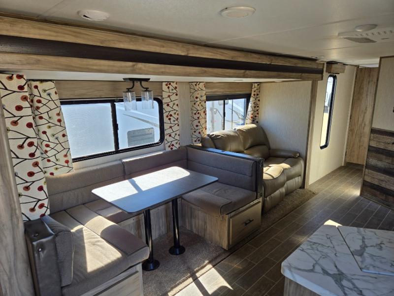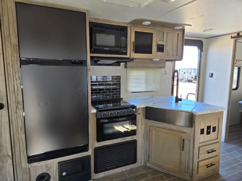 This Cherokee Alpha Wolf travel trailer is an amazing unit that delivers all of the things you love about your own home without making it feel as if you are towing a house. From the rear private bedroom with its queen-size bed and farm-style door, to the front master suite with its queen-size bed and private bathroom entrance, this unit delivers the privacy you need as you sleep each night and get ready each morning. Because this unit can sleep eight people, you will thoroughly appreciate all of the tools that come included in the full kitchen when it comes time to prepare enough food to feed everyone.