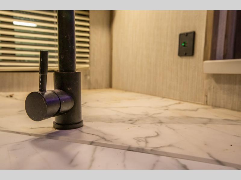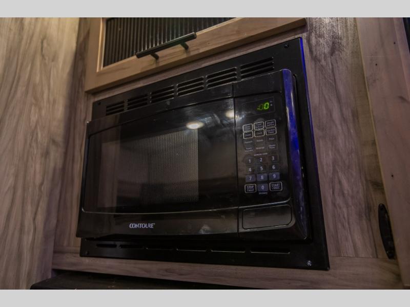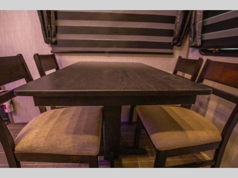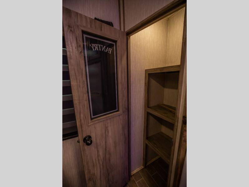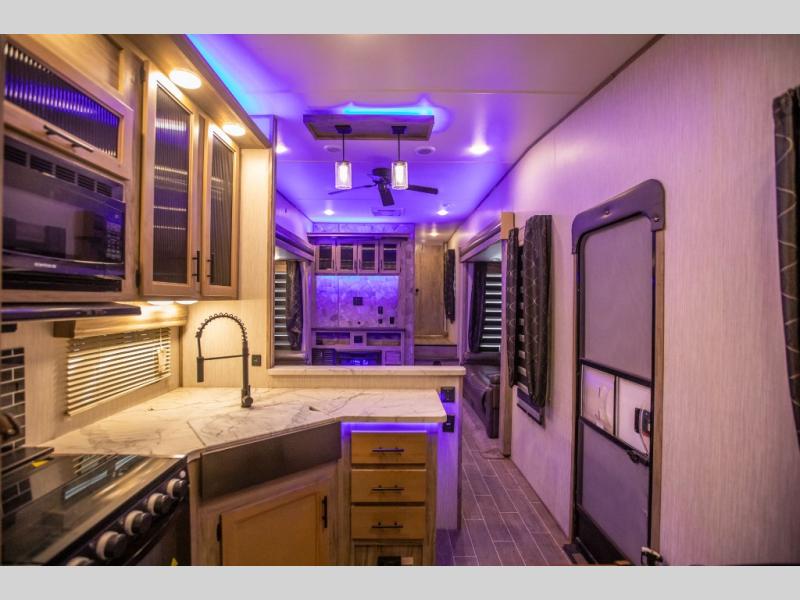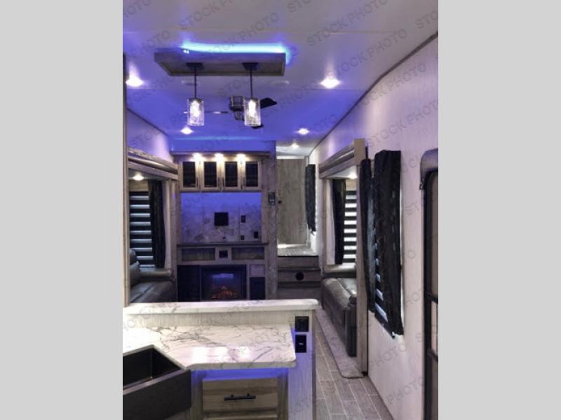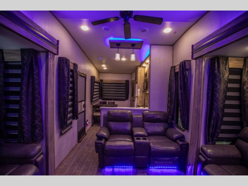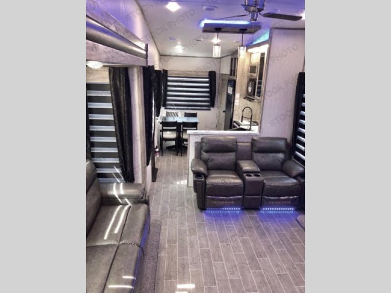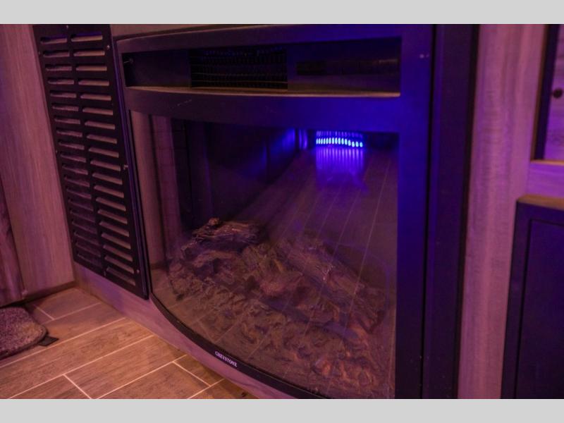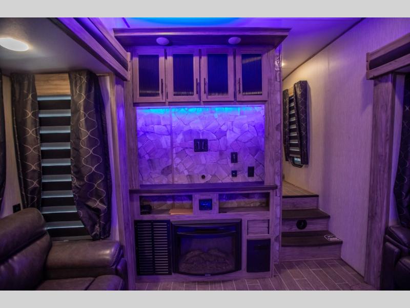 You will experience ultimate relaxation in this Arctic Wolf fifth wheel! The living area not only features one tri-fold sofa, but two tri-fold sofas and home theatre seating with cupholders across from the fireplace that has an area prepped for the optional TV to be added, plus there is a ceiling fan to keep you cool. It will be easy whipping up your best meals in the rear kitchen area with extra counter space to make it easier to serve it as well. The table and chairs are not only a good place to eat your meals at, but also a good place to play some card games, just grab your favorite snack from the large pantry and you're all set!