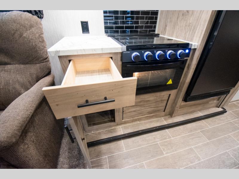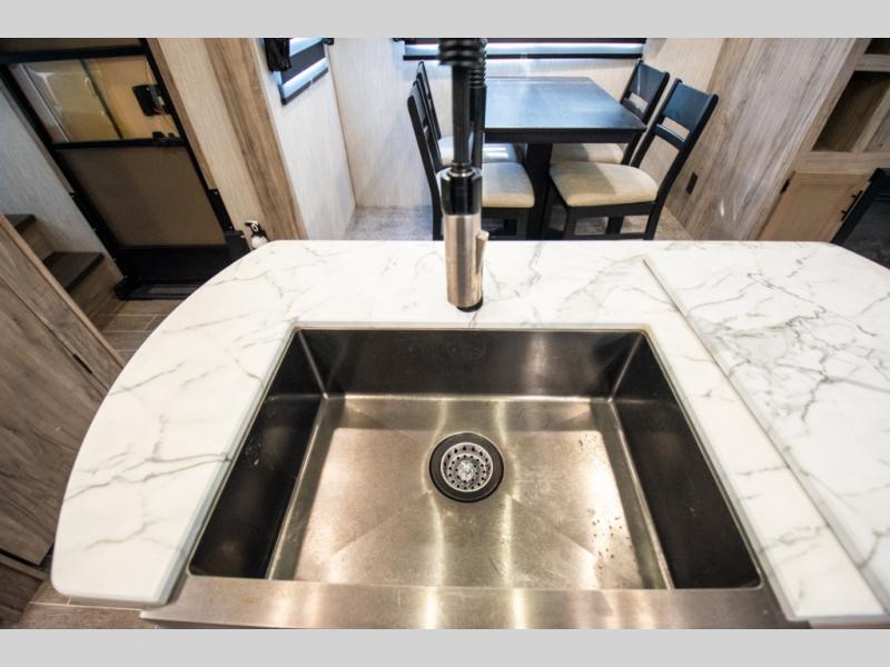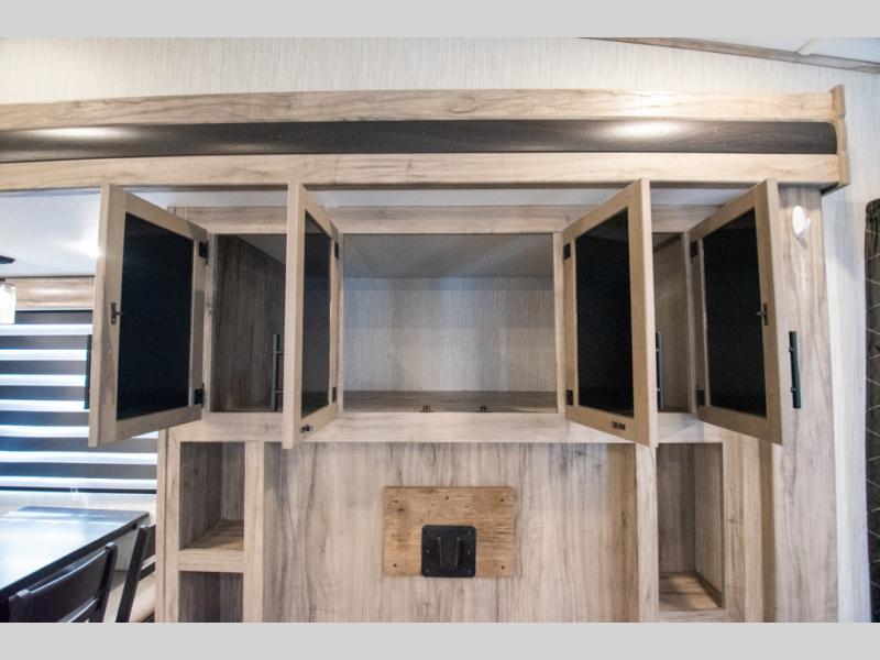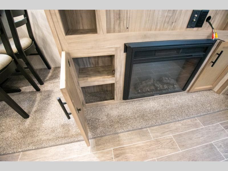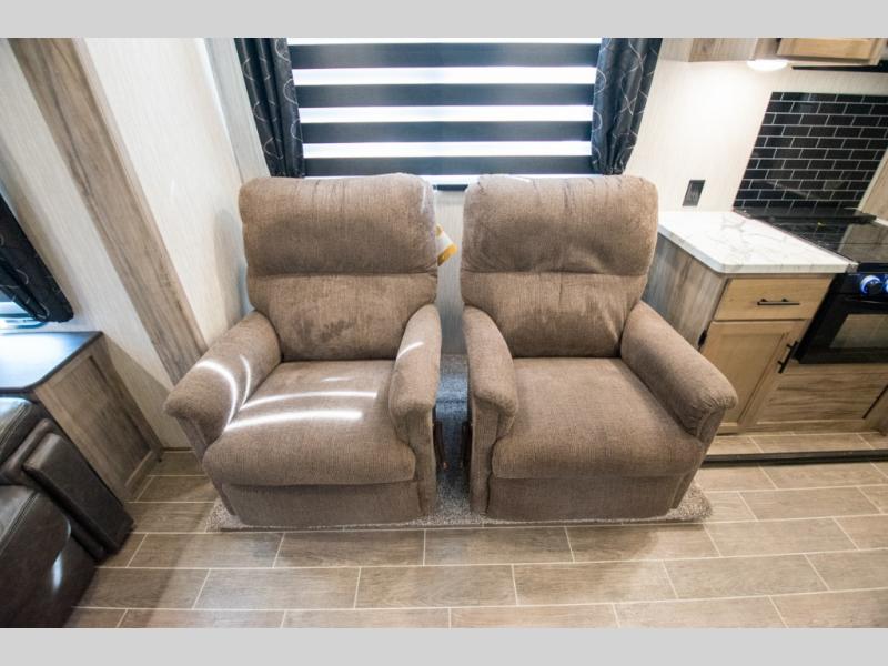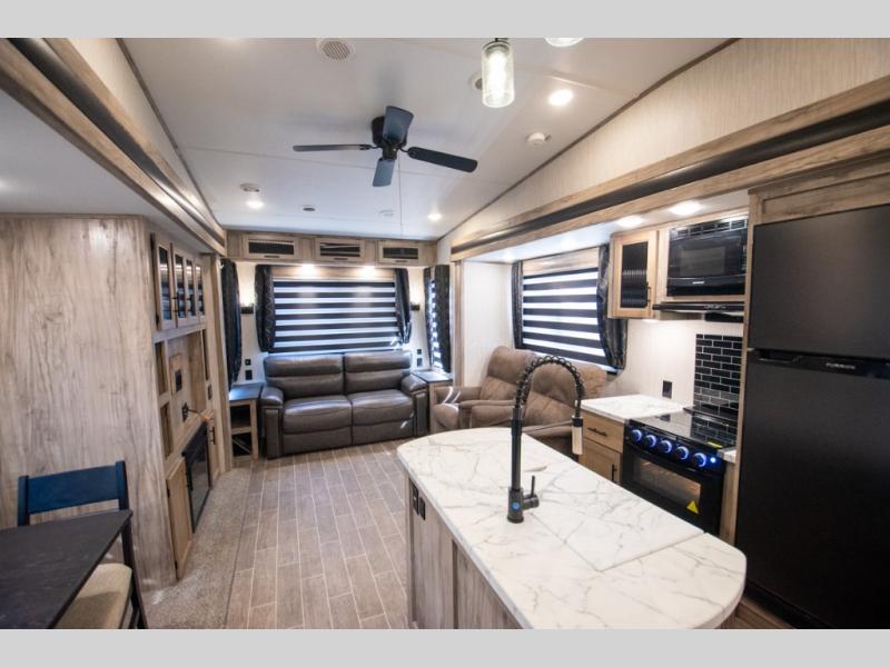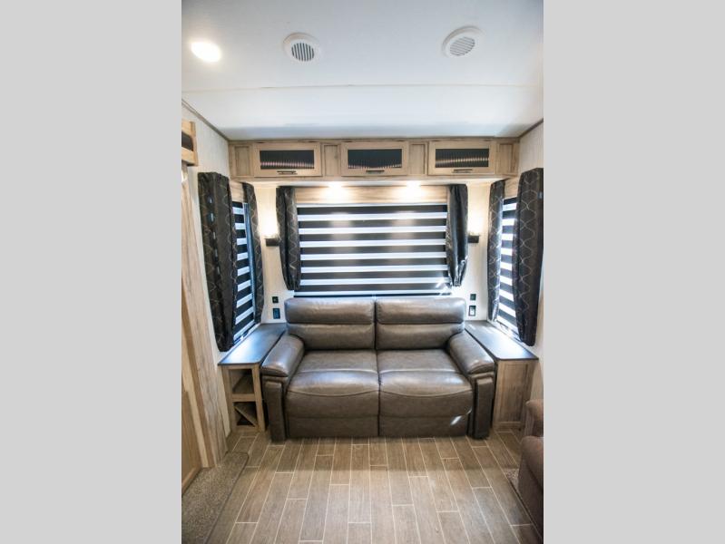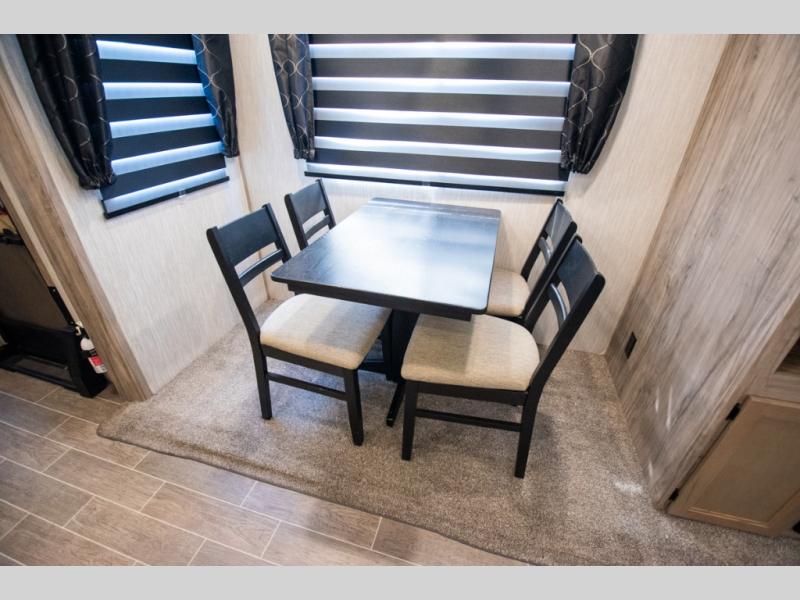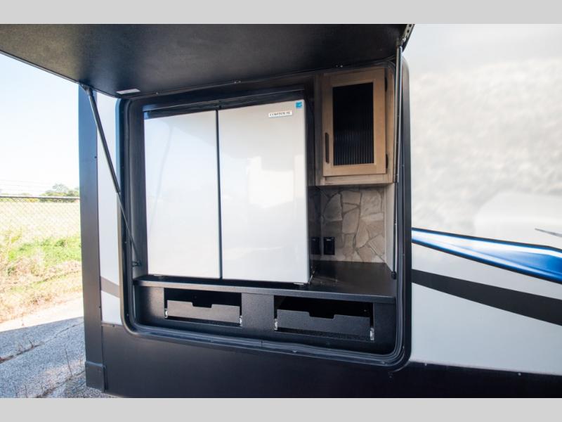 If you're looking to upgrade to an RV with more comfort, style, and convenience, look no further than this fifth wheel! You'll enjoy triple slides in this unit; dual opposing slides in the rear living area opens up the whole space, and a king bed slide out in the front bedroom provides even more space. The chef of the family can prepare dinner on the three burner range or use the convenient outside kitchen if the weather is nice. After dinner, relax on the home theater seating that includes heat, massage, and ambient lighting. The kids can enjoy their breakfast at the table with chairs before heading outside for the day and the full bath will be waiting for them after a day of hiking through the woods!