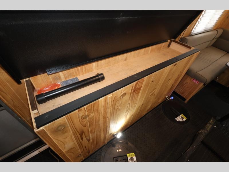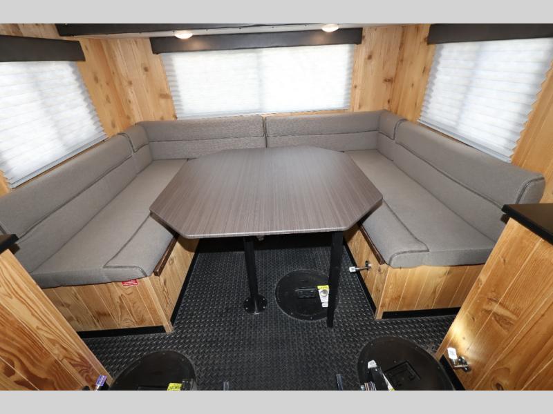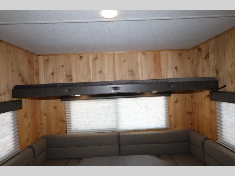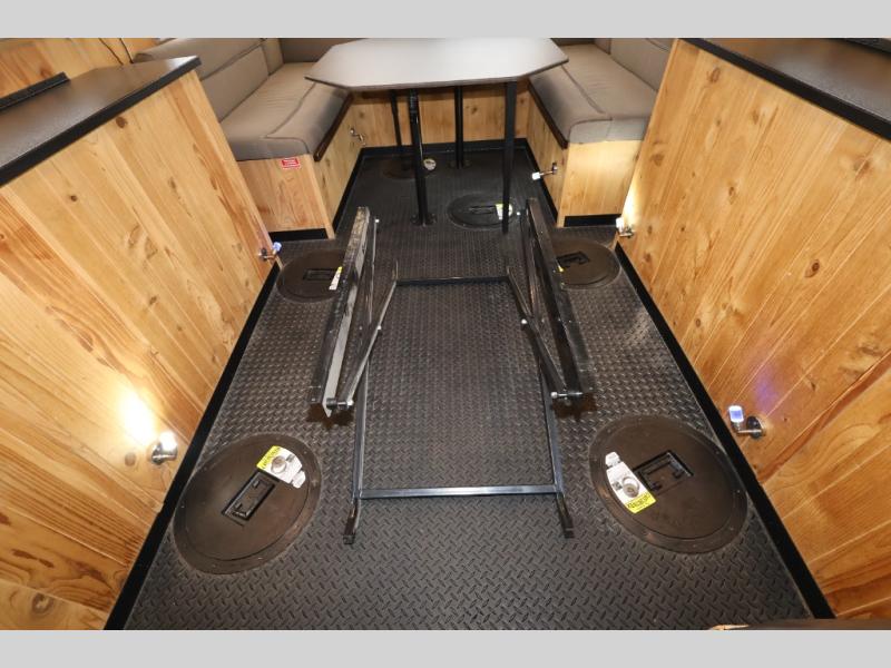 If you are wanting a weekend away from the hustle and bustle of life, then choose this Cherokee Grey Wolf fish house. You will enjoy relaxing indoors while fishing at the same time. There are eight fishing holes throughout this model, and when you are not fishing you can visit with your family and friends at the jackknife sofa or at the booth dinette. Above the dinette there is a flip-up bunk for additional sleeping space. Your fishing rods can easily be stored at the two rod storage compartments along either side of this model, and you will also enjoy the convenience of your own front private bathroom!