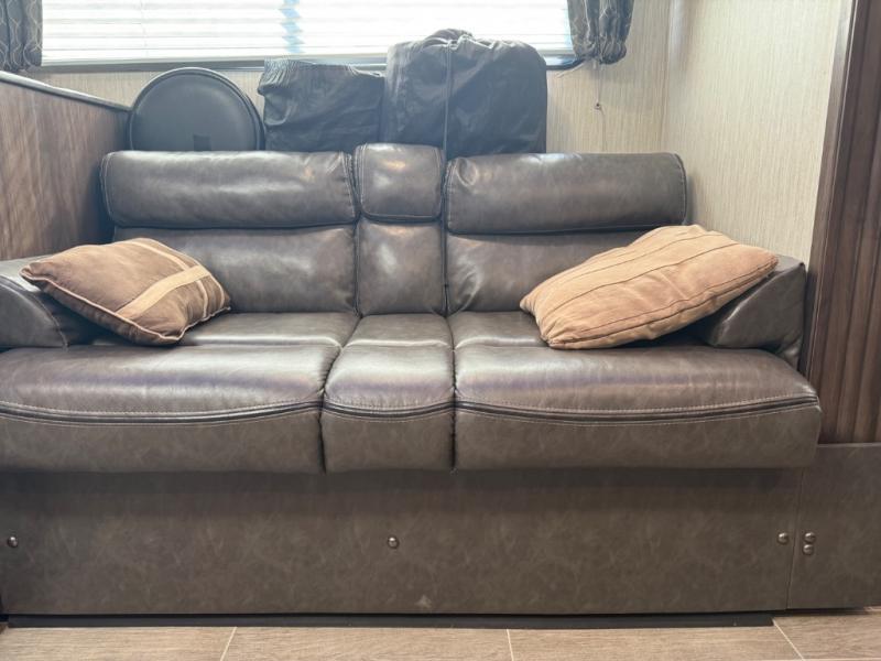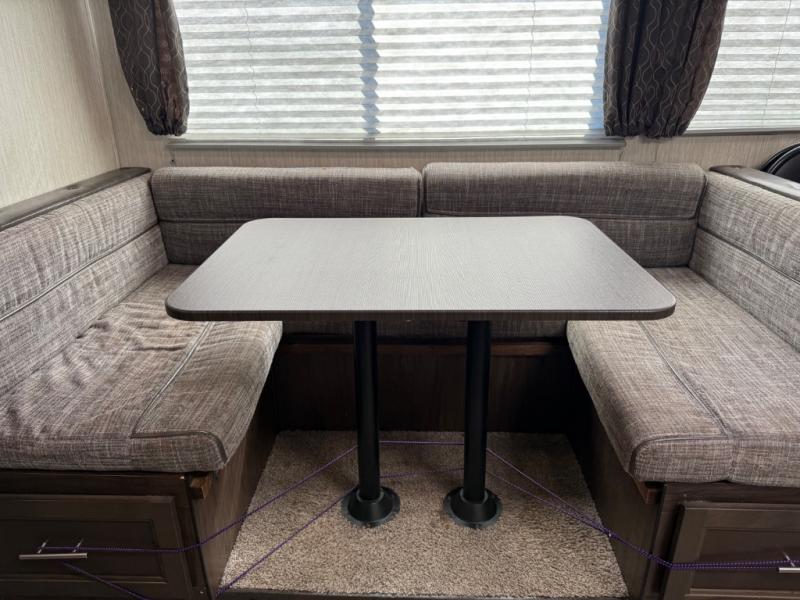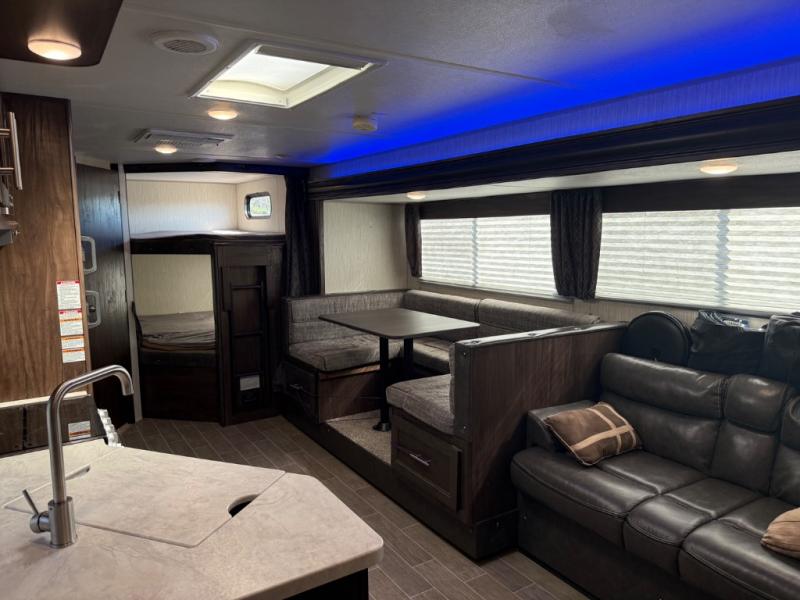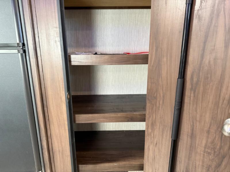 Come on inside this Cherokee Grey Wolf travel trailer and experience the convenience of a smooth flow of traffic in and out with two entry doors. The rear door leads into a full bath which is great for accessibility when outside and when you need to use the bathroom. Once inside, you will notice the large U-shaped dinette and the sofa which sit on the slide and create a spacious footprint for moving about, as well as great places to play games and socialize with your friends and family. A walk-in pantry provides plenty of storage allowing you to stock up on your favorite snacks and dry goods for your family adventure. At night, there is sleeping space for ten between the double-size bunks and the queen-size bed.