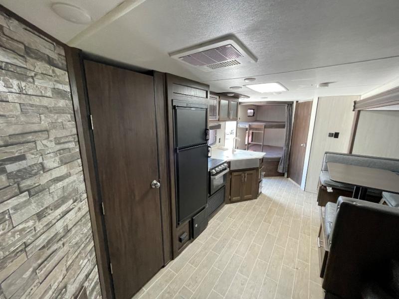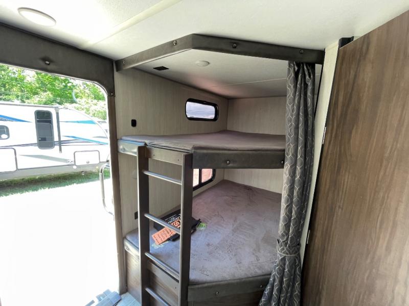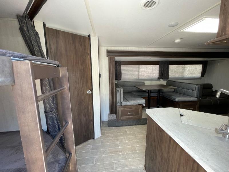 It's time you go camping the right way with this Forest River Cherokee Grey Wolf travel trailer! It features a front private bedroom with a queen bed for you to escape and recharge after a fun-filled day. Your kiddos are sure to love having their own set of rear double-size bunks with a ladder for safety, and you are sure to love that the rear corner bath is located right next to them. Inside the kitchen, there is a pantry big enough to hold your group's favorite snacks and a residential farm-style stainless steel sink to make your cleanups a breeze. There is also a U-shaped dinette for you to enjoy your meals at or play a card game or two!