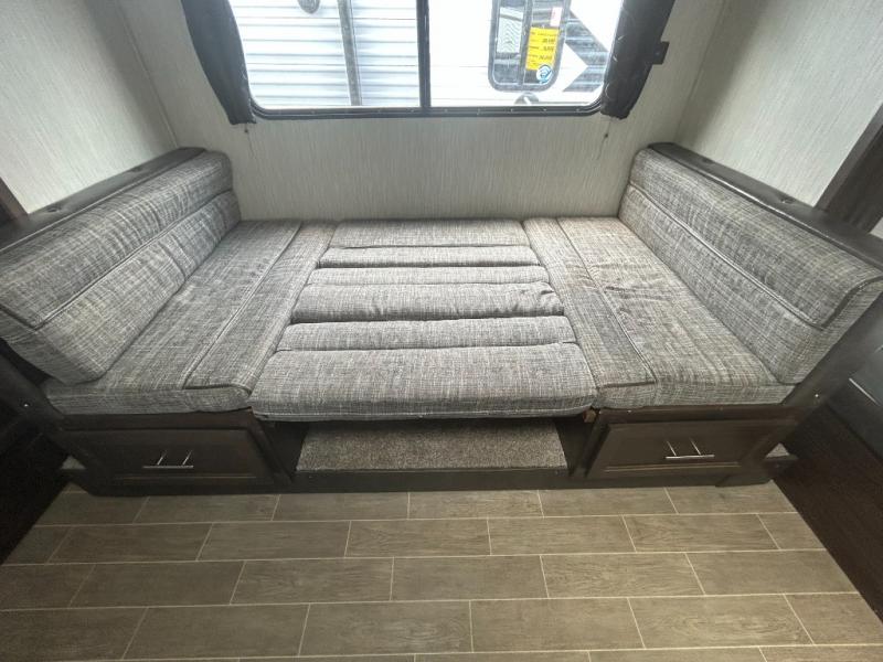 This Cherokee Grey Wolf toy hauler is perfect for those who are concerned about keeping the fuel smells and grime from entering the main living area. In this unit you can enjoy the separation with a door and the walk-though bath. In the cargo area, you will have plenty of space for hauling all of your favorite toys. This area also features dual fold-down sofas with a dinette table that is great for your thrill seekers to come in for a break from riding. It also allows quick access into the bathroom without having to wander through the entire main living area where you are likely to leave a trail behind. After a full day of playing hard, you can get cleaned up and head into the main kitchen area where you will enjoy a U-shaped dinette. A full kitchen allows you to refuel your body, and there is also a queen bed up front for a great night's sleep.