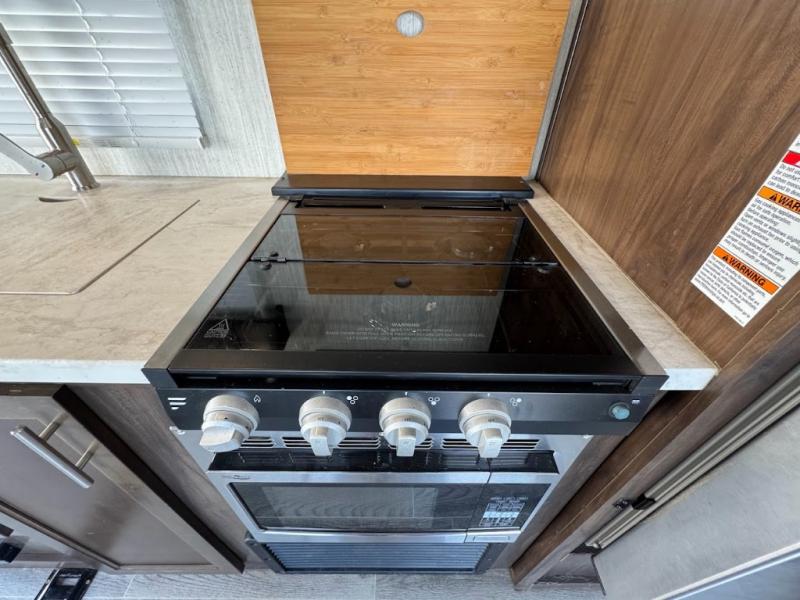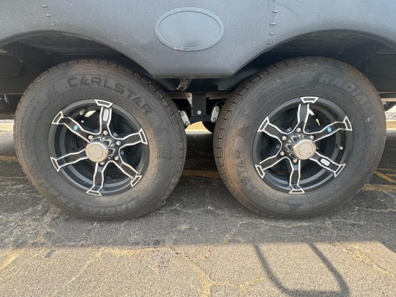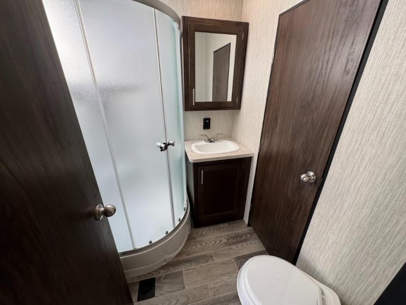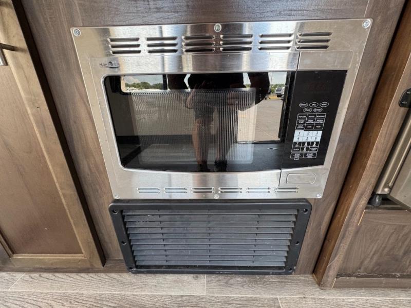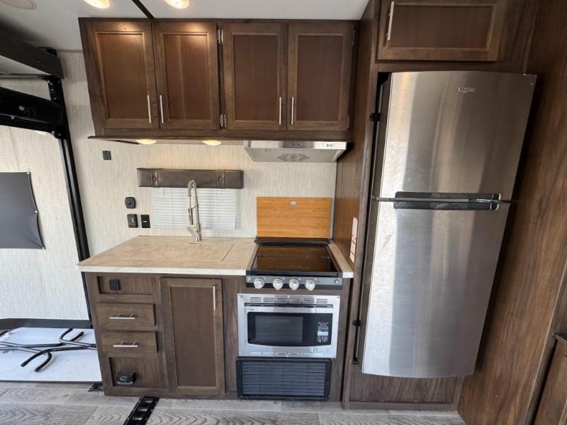 With any Cherokee Wolf Pack toy hauler, it is easy to keep the outdoor fun going all weekend long! There is plenty of room for a few dirk bikes, a four wheeler, or an ATV, and you can clean up from your excursions before coming inside with the outside shower. Inside you will find comfortable conveniences like the real wood cabinet doors and drawers, a large 10.8 cu.ft. 12V refrigerator, a shower skylight, and a drop in cooktop with a glass cover and oven. You will also appreciate having a 35,000 BTU furnace to keep the interior warm.