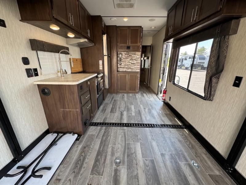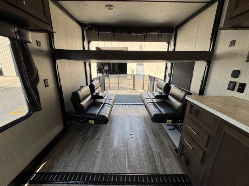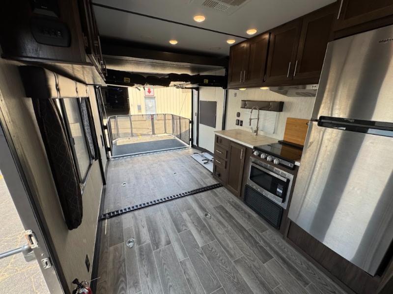 Let this Cherokee Wolf Pack toy hauler take you, your family, and your off-road toys to the outdoor playground of your choice! You can easily load and unload your riding toys with the rear ramp door. After your gear is unloaded from the 14' of cargo space, then set up the two sofa beds and the removable dinette table for a nice eating/visiting area. Above, there is a Happijac power bunk which you can lower at night. The open kitchen features a large sink, three burner range, and a microwave oven. In the master suite you will find a Wolf Pack king bed, as well as two nightstands and two wardrobes. Enjoy spending more time outside enjoying the shade of the 15' power awning.