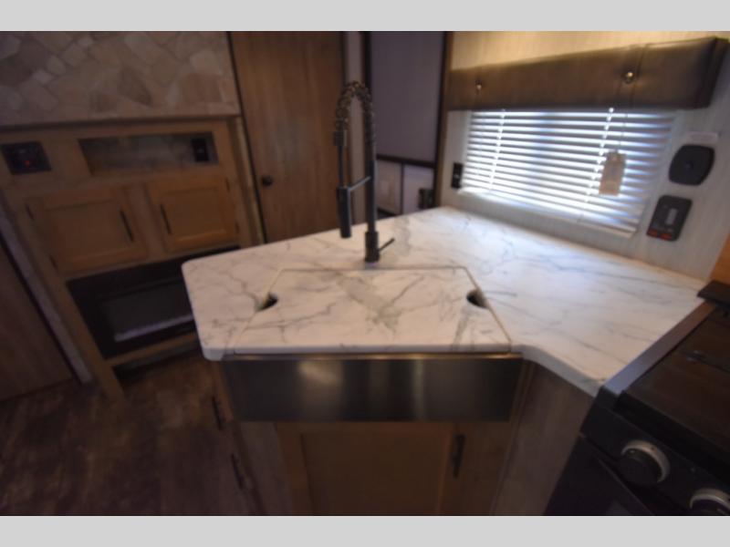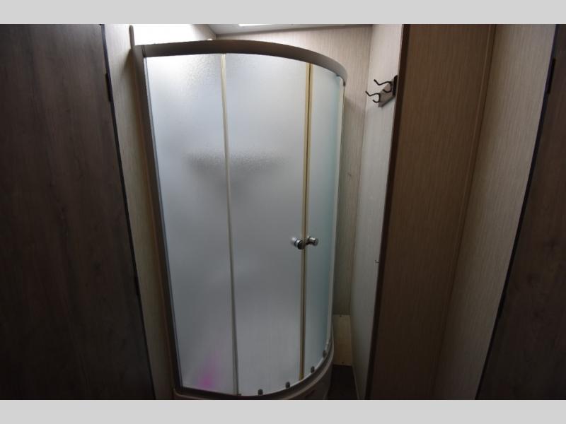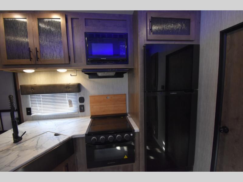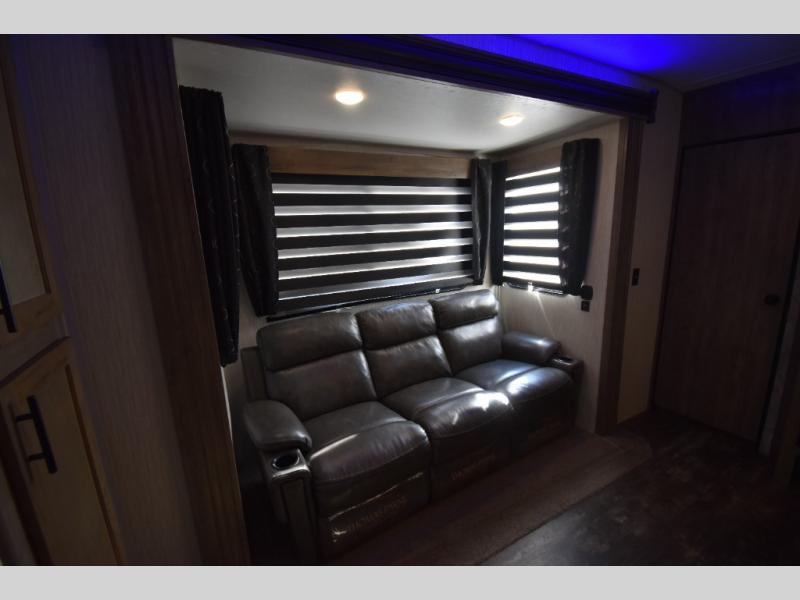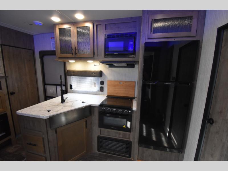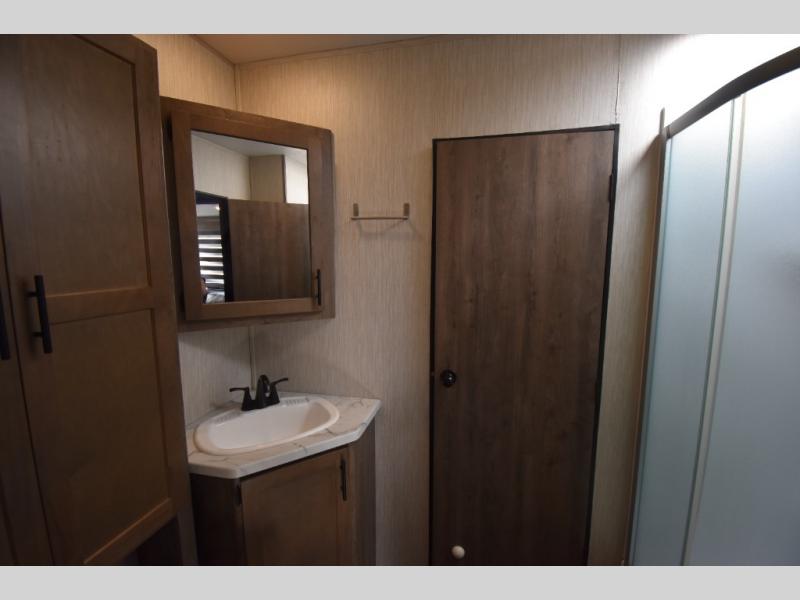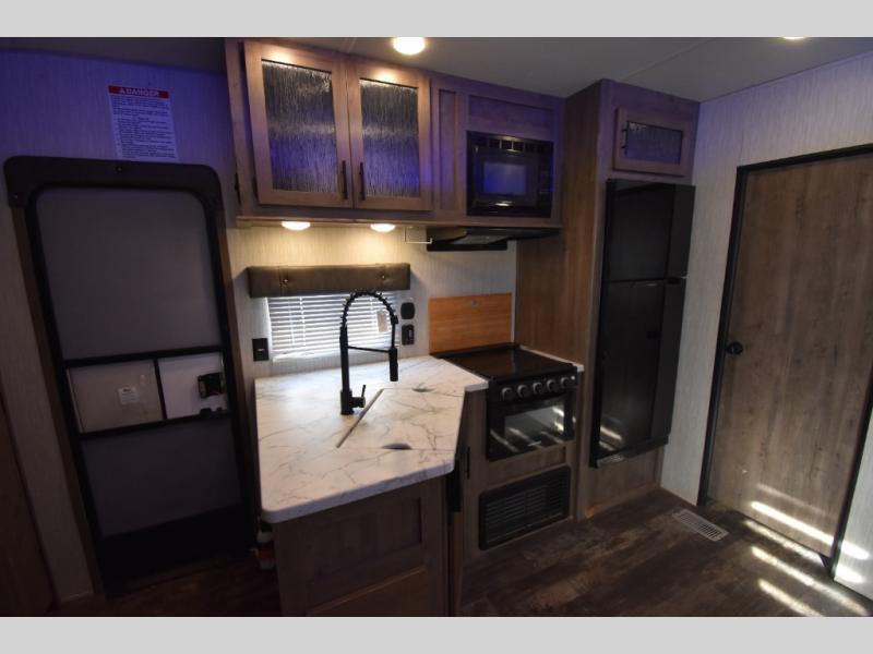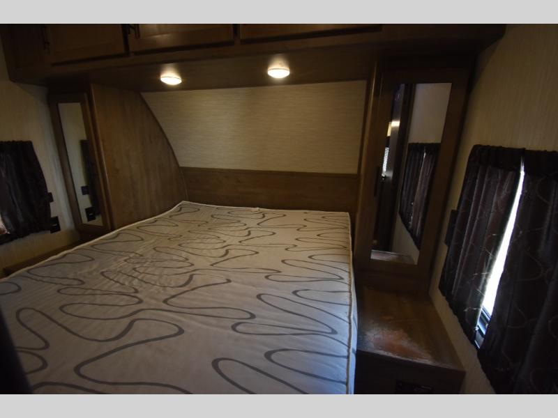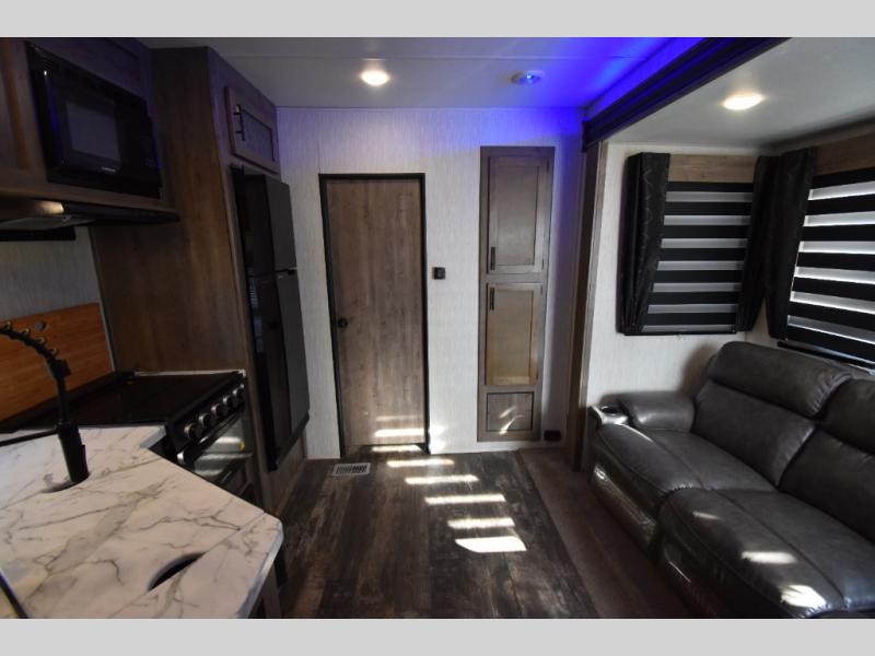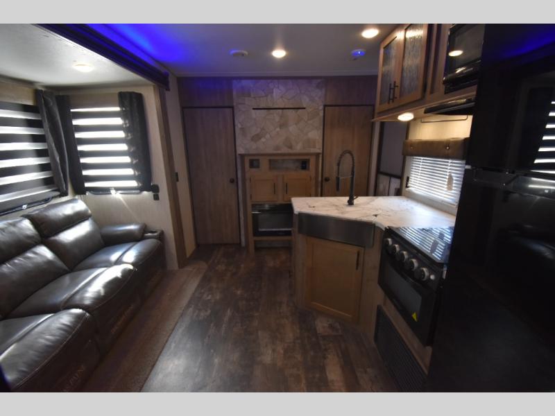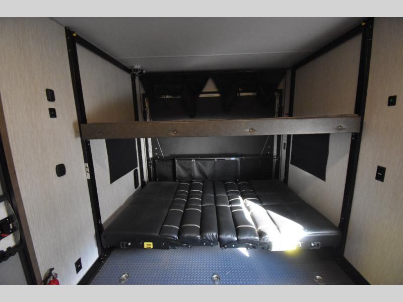 For any camping excursion, you will want this Cherokee Wolf Pack single slide toy hauler. The 12' separate garage features plenty of room for your favorite toys, plus there is the second entry door, two sofa beds, a removable dinette table, and a Happijac power bunk. The walk-through bath has two doors along either side for complete privacy. In the combined kitchen/living area you can enjoy your meals around the U-shaped dinette, and at night head to the private bedroom where you will find a king bed for a comfortable night's rest.
