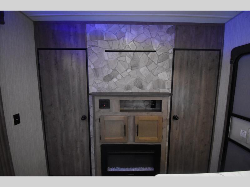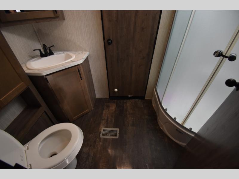 With any Cherokee Wolf Pack toy hauler, it is easy to keep the outdoor fun going all weekend long! There is plenty of room for a few dirk bikes, a four wheeler, or an ATV, and you can clean up from your excursions before coming inside with the outside shower. Inside you will find comfortable conveniences like the real wood cabinet doors and drawers, a large 10.8 cu.ft. 12V refrigerator, a shower skylight, and a drop in cooktop with a glass cover and oven. You will also appreciate having a 35,000 BTU furnace to keep the interior warm.