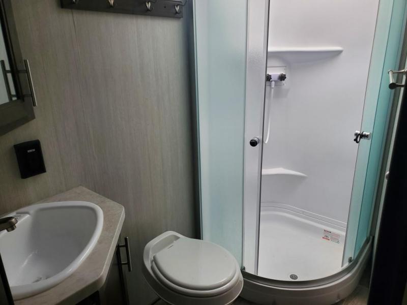 With any Cherokee Wolf Pack toy hauler, it is easy to keep the outdoor fun going all weekend long! There is plenty of room for a few dirk bikes, a four wheeler, or an ATV, and you can clean up from your excursions before coming inside with the outside shower. Inside you will find comfortable conveniences like the real wood cabinet doors and drawers, a large 10.8 cu.ft. 12V refrigerator, a shower skylight, and a drop in cooktop with a glass cover and oven. You will also appreciate having a 35,000 BTU furnace to keep the interior warm.