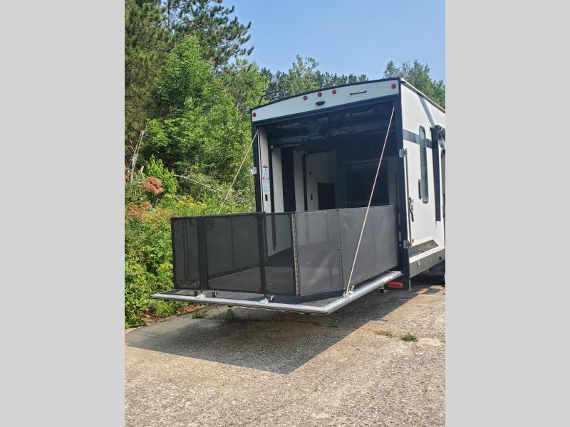 Load up your family, your off-road toys, and head out for a weekend camping trip that includes plenty of relaxing and playing outside with this Cherokee Wolf Pack toy hauler. The cargo area has 12' of storage space with a Happijac power bunk, two sofa beds, and the second entry door. A patio door separates the cargo space from the main living area, and the front master suite features a Wolf pack king bed with easy access into the bathroom. Outside there is a 21' power awning that offers plenty of shade and a pass-through storage area for your extra camping gear.