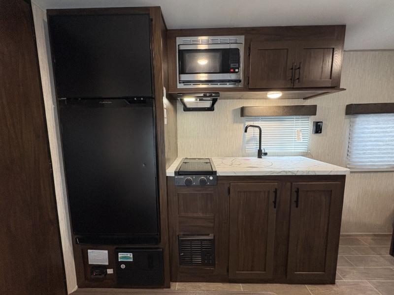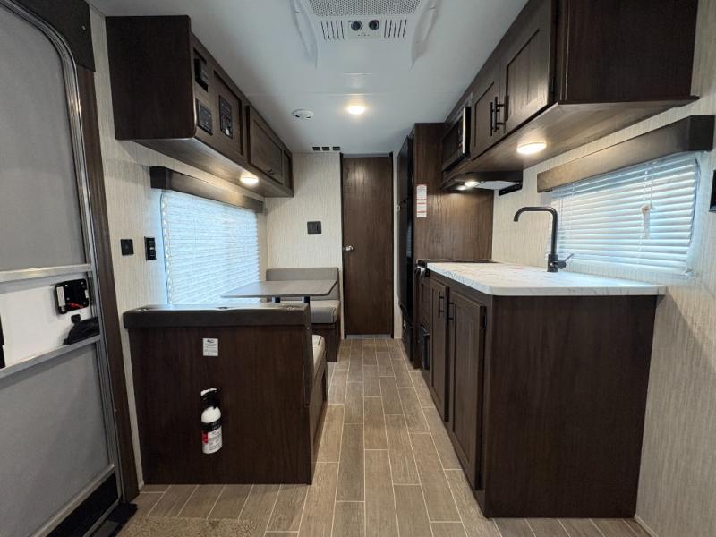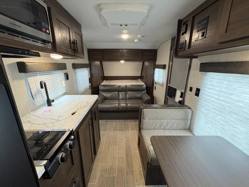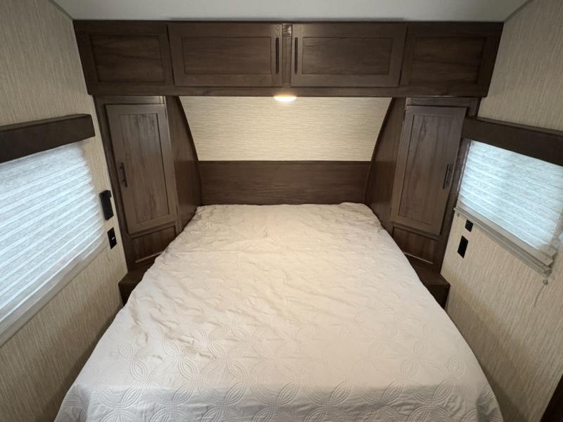 Whether you are a couple or a family that enjoys camping with your own accommodations, you will enjoy this trailer. From the Cherokee Sleep System with storage on each side and above, and the dinette that doubles as sleeping space for the kiddo, you can sleep on your own sheets each night. The full bathroom allows you to skip the public facilities, and the kitchen amenities will allow you to cook inside whenever you like. You will also find storage throughout the inside as well as along the exterior for your outdoor gear.