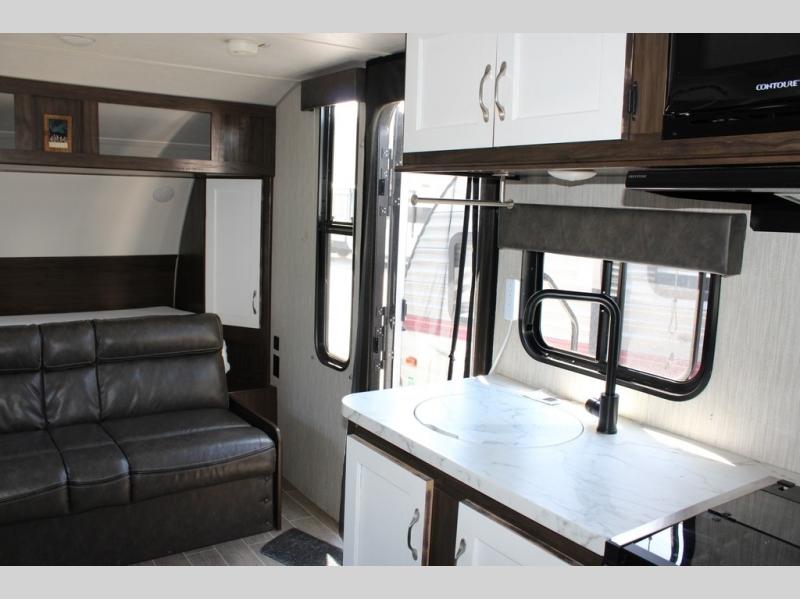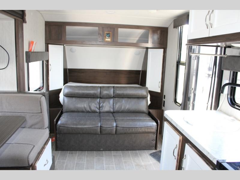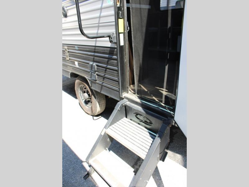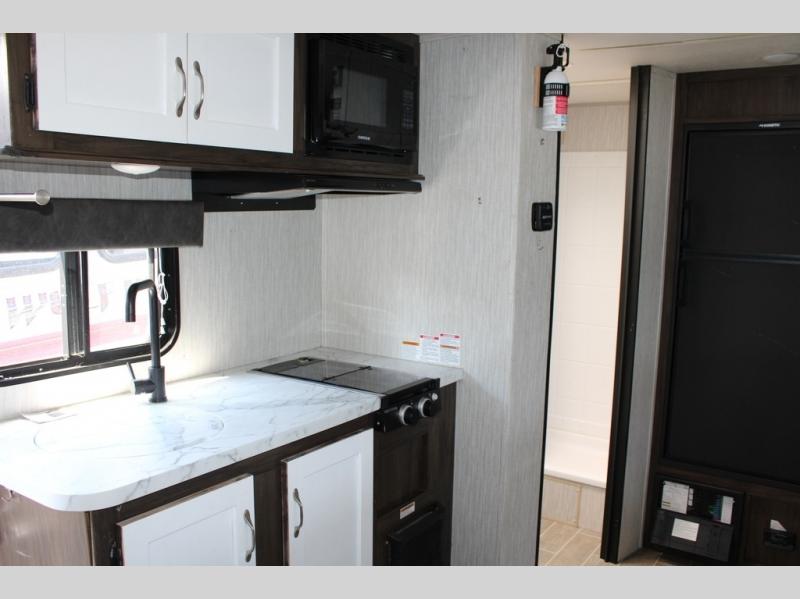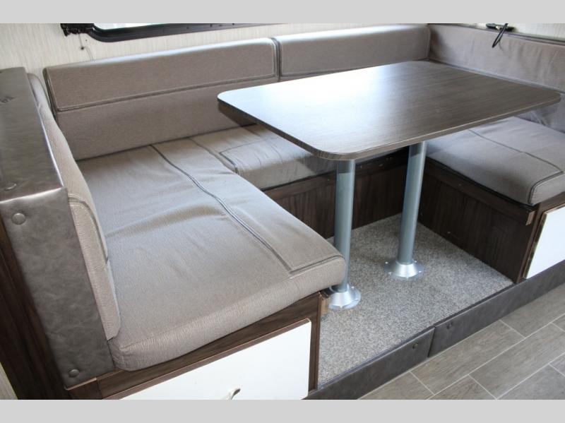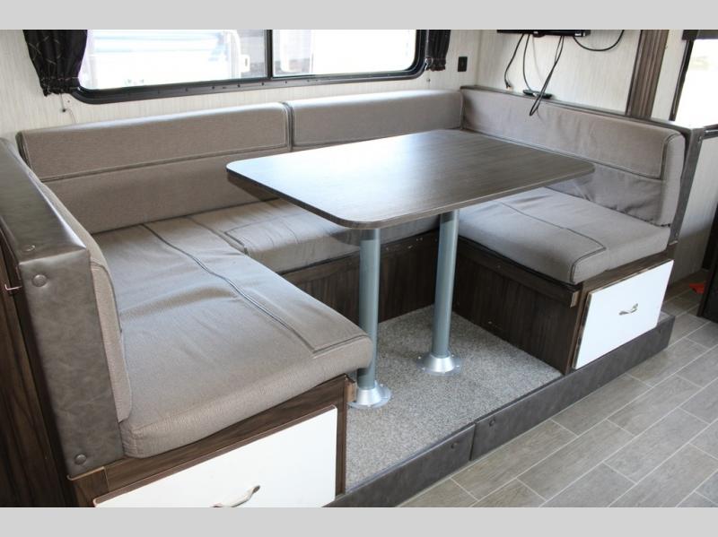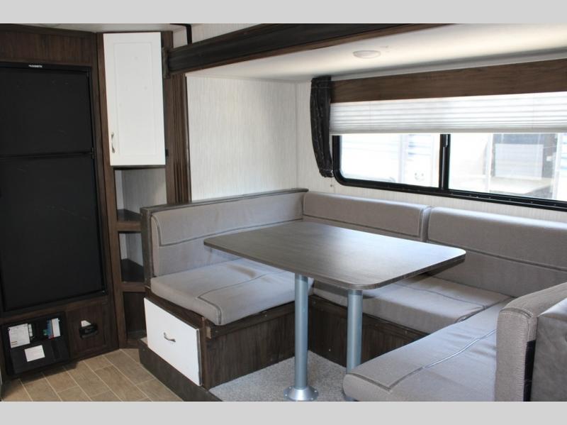Pack up your family of four, and easily hook up this travel trailer for a camping trip you won't forget. After a day of hiking, relax on the front queen bed, and fold down the U-shaped dinette for the little ones to sleep on. This unit includes a two burner cooktop, a refrigerator, and a pantry for snacks. You'll enjoy the rear corner bath that includes a tub for the kids' bath time. Leave nothing behind with overhead storage in this model, and outside storage for the lawn chairs. This travel trailer also features a slide out for added interior space!