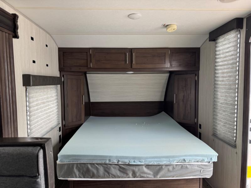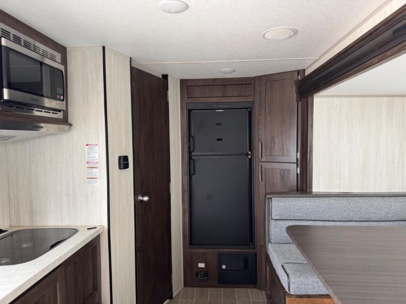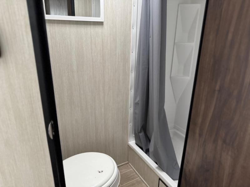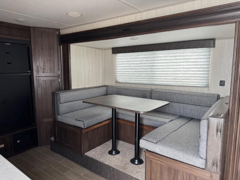 Leave nothing behind when you have plenty of storage inside as well as in the outside storage! You will also find lots of walking around space with the slide out U-shaped dinette fully extended to move from the Murphy bed/sofa to the rear corner toilet and tub/shower room. You will surely enjoy your privacy to change clothes or get cleaned up before starting your outdoor day. Be sure to grab a snack from the refrigerator or the pantry before beginning your hike. And when you return, grab your camp chairs from the outside storage to relax under the power awning providing you an outdoor living space.