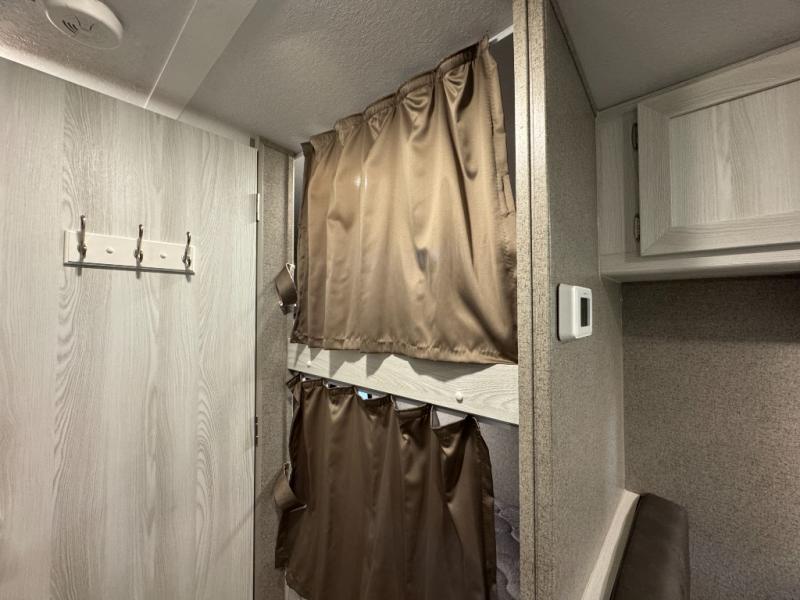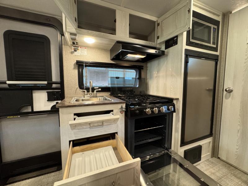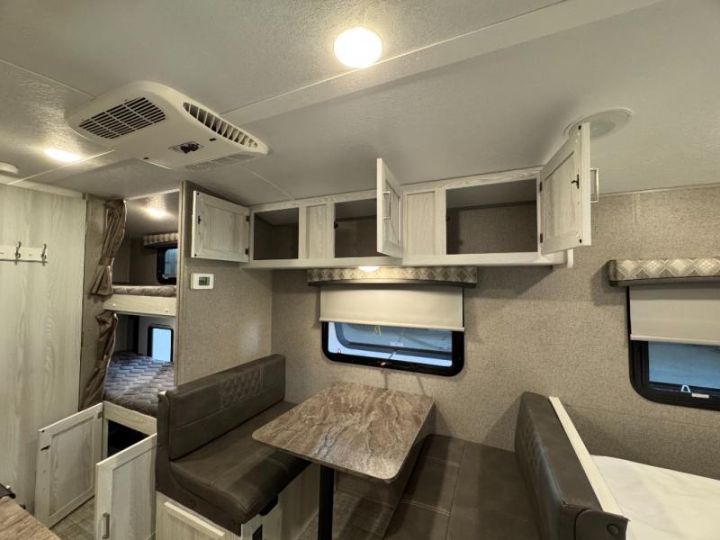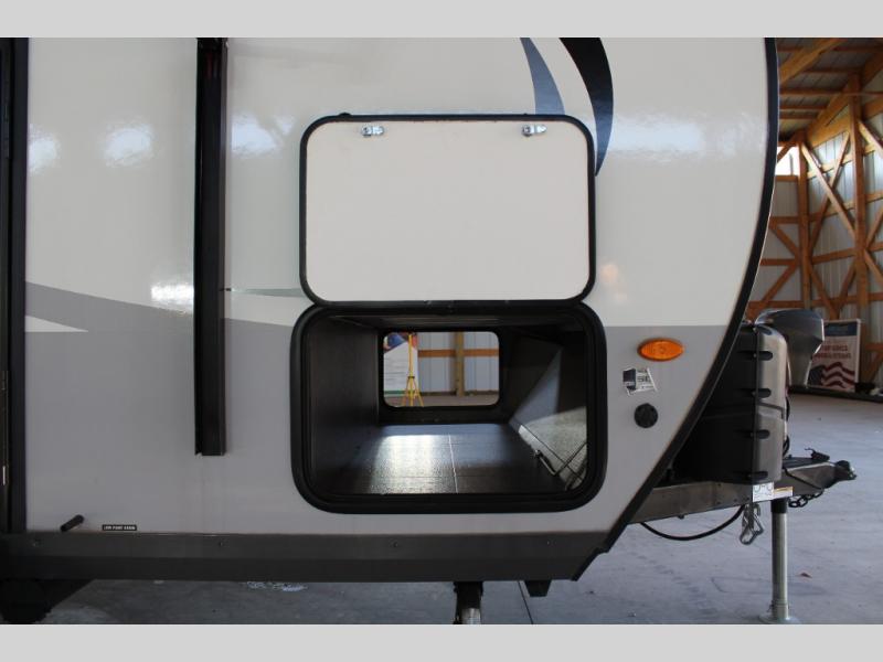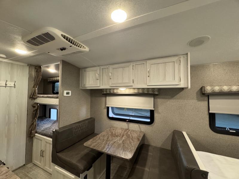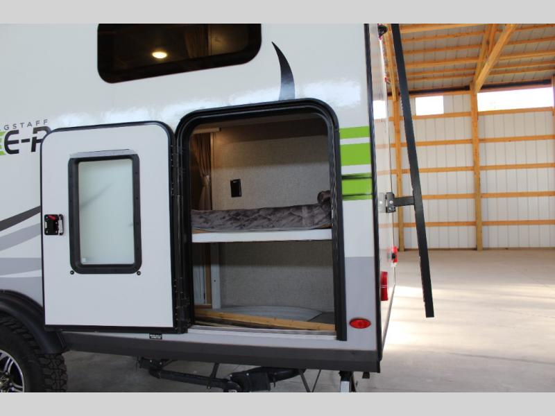 If you are looking for a compact unit that will allow you to bring along your friends or family, then this Flagstaff E-Pro travel trailer is the one! You will appreciate the set of bunk beds in the rear, the booth dinette, and the full-size bed up front which allow you to sleep five people each night. You will have a full kitchen inside to make warm meals and an outdoor gas griddle, so you can choose where you want to spend your meal prep. Because of the exterior bike door, you can bring along your bikes safely indoors allowing you to take a ride through the trails each afternoon, and there is exterior storage as well.