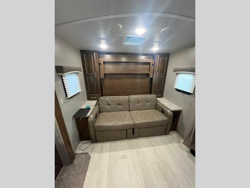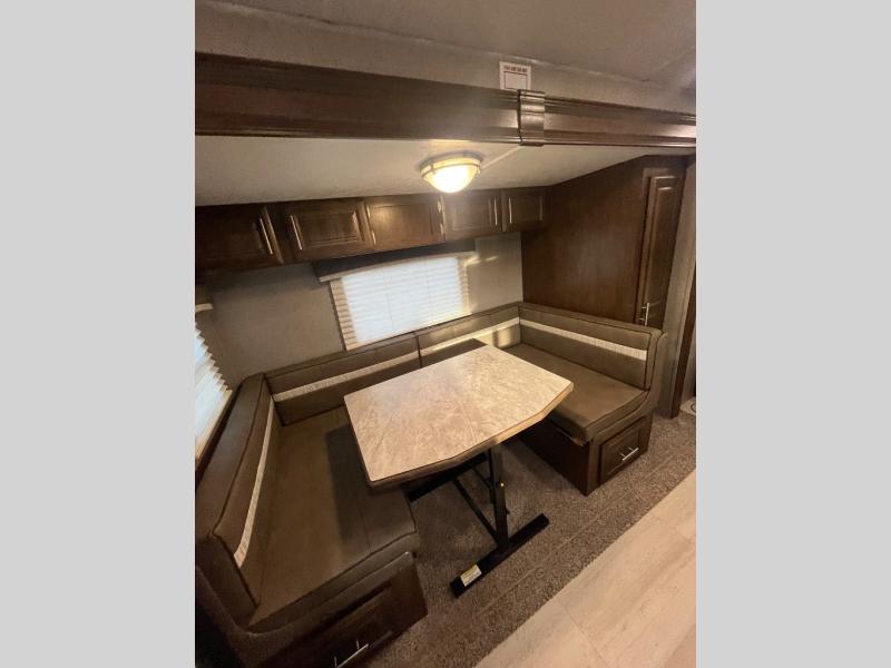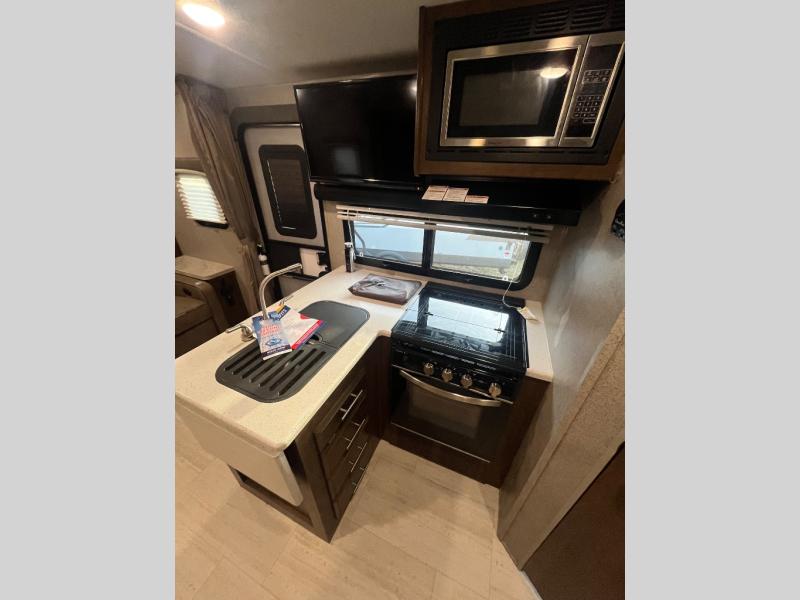 Pack your bags and get ready for your next camping trip with this Flagstaff Micro Lite travel trailer. You will enjoy the space the single slide provides, and within the slide is a U-shaped dinette where you can enjoy your meals. Fold out the Murphy bed each night for a good night's rest, and in the morning you can fold it away and enjoy a cup of coffee on the sofa. This unit features a kitchen with a three-burner cooktop and microwave, and you'll appreciate a pantry for snacks. Bring along the extra lawn chairs in the pass-through storage, and there is also an exterior storage for your luggage or tackle boxes