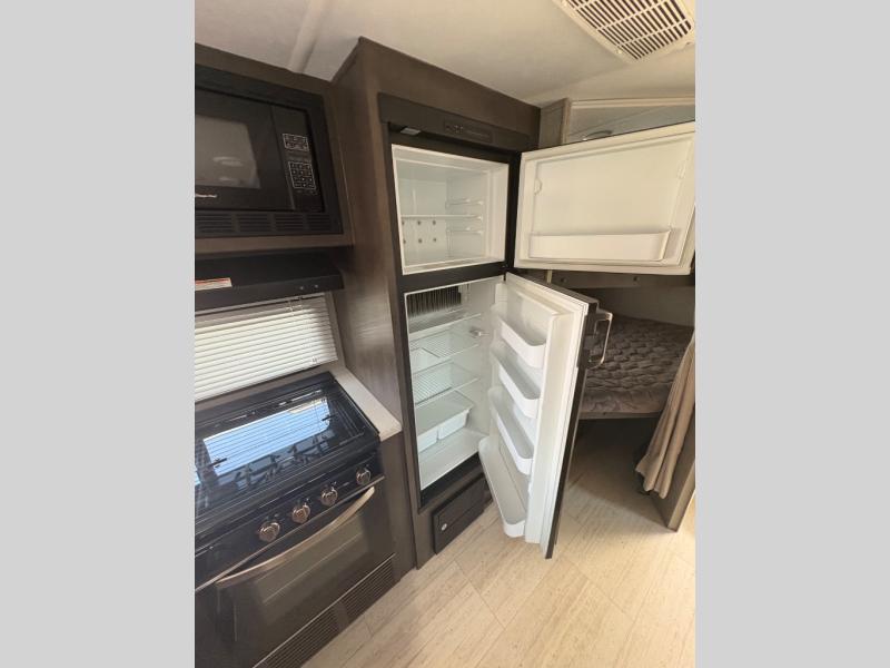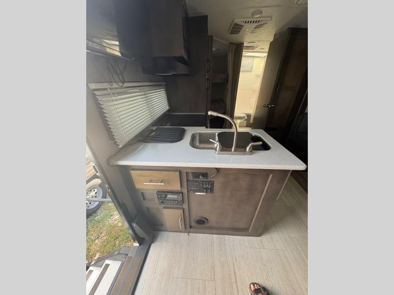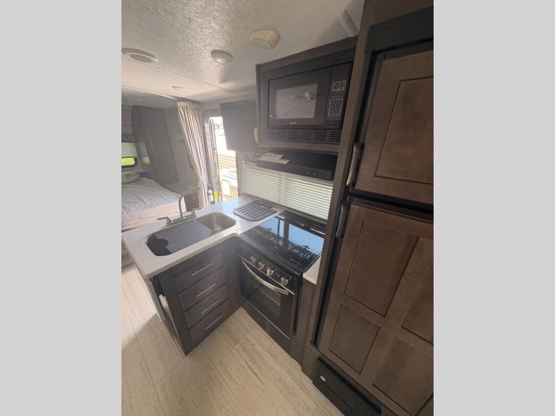 For any camping trip, you will want a Flagstaff Micro Lite travel trailer! These models have a beautiful Slatewood interior with hardwood cabinet doors and drawer fronts. Each unit features a WIFI Ranger Booster Sky 4 so that you can stay connected while you camp. Along the exterior there is a fully aluminium frame, an enclosed underbelly, and a radius roof with interior vaulted ceilings which provides you with the most headroom. Plus, an outside shower, outside speakers, and power awning with LED lights give added convenience to the exterior.