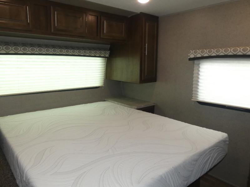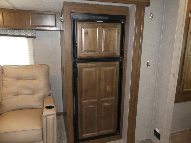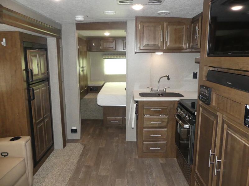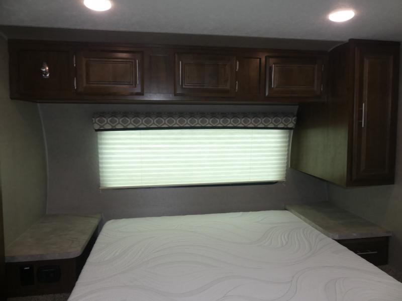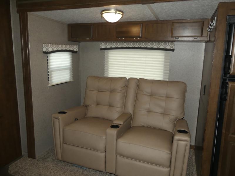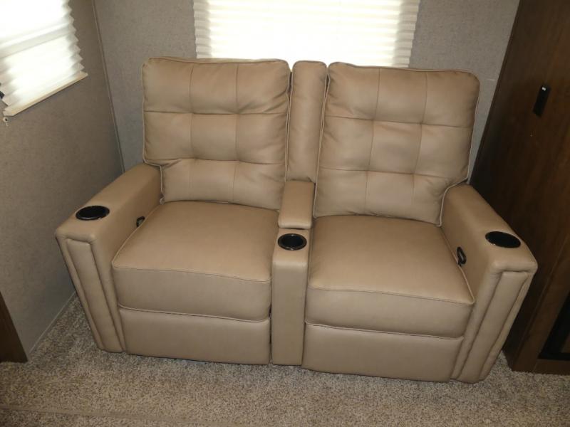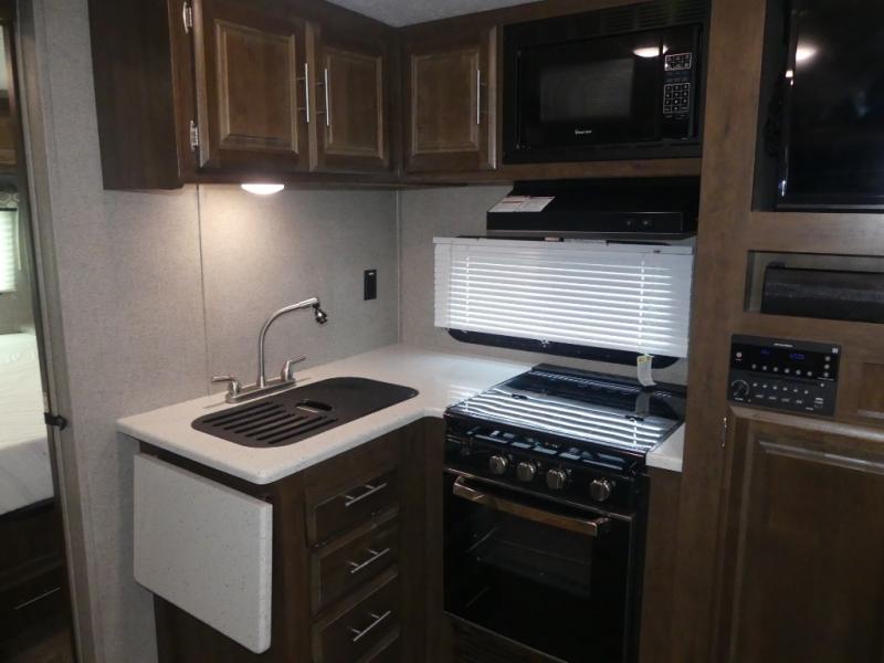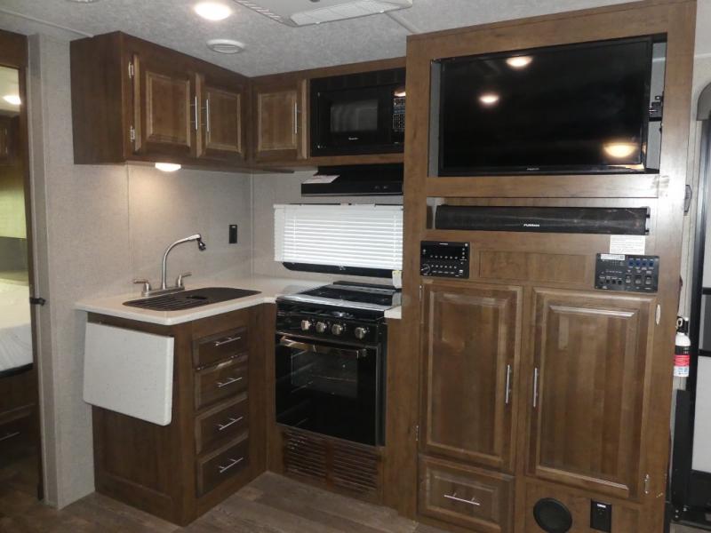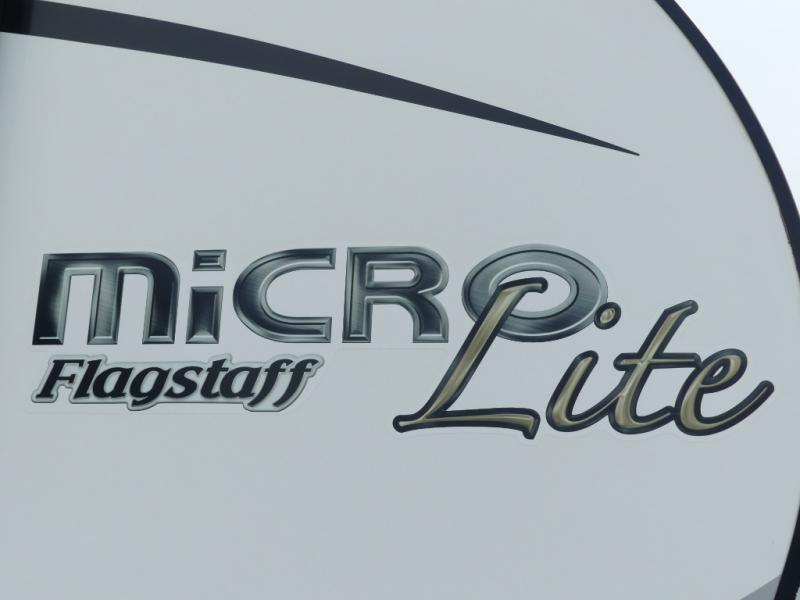 For the couple who enjoys a weekend camping trip, come choose this Flagstaff Micro Lite travel trailer. This unit features a slide that holds the theater seats with cupholders for your favorite beverage. You'll love relaxing on these in the evening while you enjoy your entertainment center with a 32" LCD TV. The private front bedroom includes an RV queen bed and a wardrobe slide. You'll love the cute kitchen with a countertop extension for meal prep and a large pantry to hold your favorite snacks.