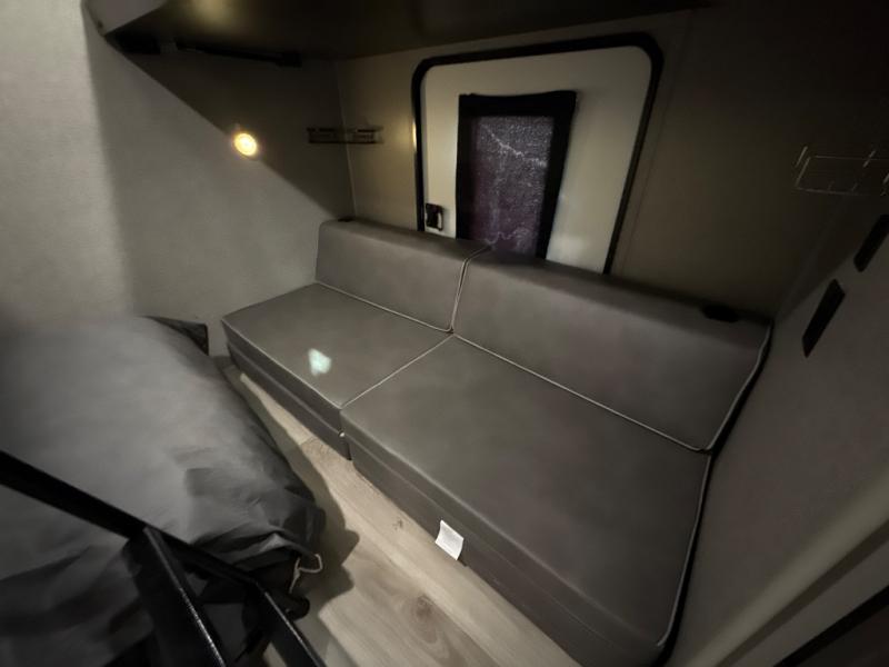 Been thinking about upgrading your travel trailer to a bunkhouse model? Just imagine your kids sleeping in their own private room which includes two bunks and a Play-Cube sofa for those rainy days inside. This Flagstaff Super Lite also provides a master bedroom with a slide out queen Serta mattress, storage and an optional TV. You can even choose to add carpet in your room. The main living and kitchen area includes a slide out with a U-shaped dinette and hide-a-bed sofa offering more floor space to do yoga, play Twister, or even stretch your legs out from the furniture. The cook will love the L-shaped counter space, and countertop extension when washing the dishes. The outside kitchen and gas griddle will come in handy for outdoor cooking while visiting everyone hanging out around the campfire. Load up and head out!