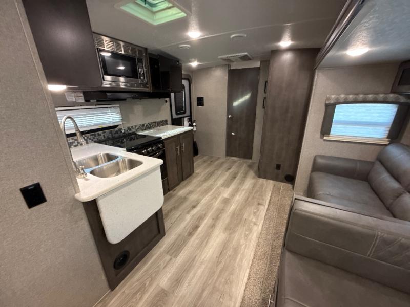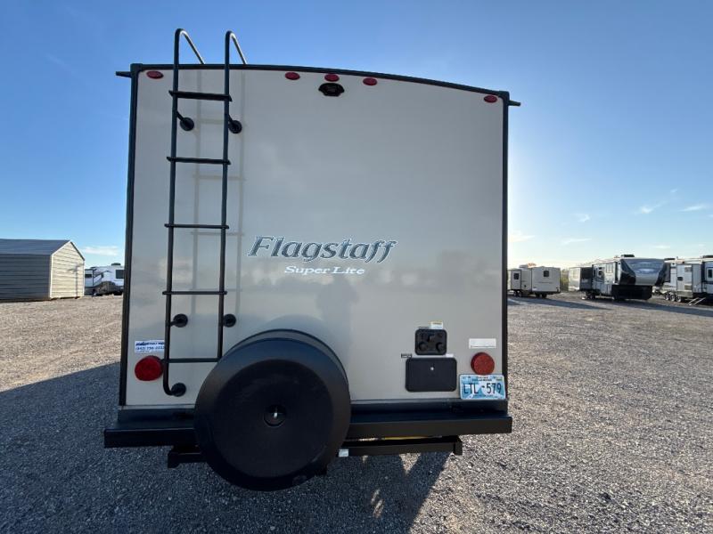 It will be easy to make plenty of memories with your family when you choose to camp with a Flagstaff Super Lite travel trailer by Forest River. These models have beautiful slatewood cabinetry with hardwood cabinet doors and drawer fronts, solid surface kitchen countertops, and ceiling LED 12 volt interior lighting. The 6 sided aluminum cage construction offers lightweight towing, the radius roof with interior vaulted ceilings give you more headroom, the WiFi ranger Wifi booster Sky 4, the enclosed underbelly, and the power awning with adjustable rain dump and LED light strip, will give you years of enjoyment!