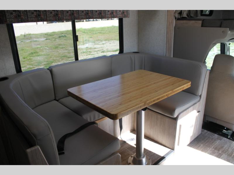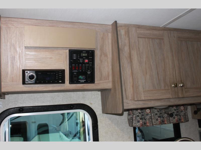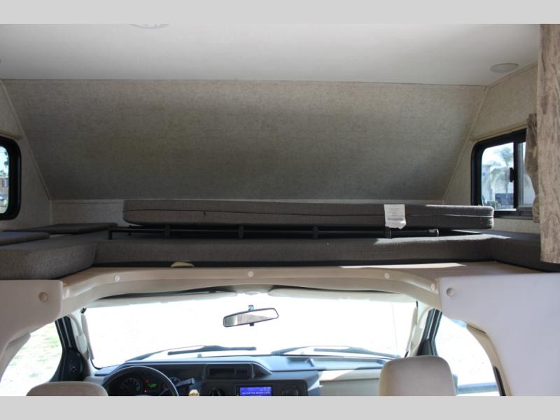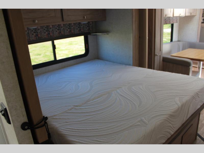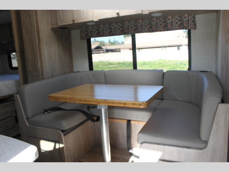 Easily take this Class C motorhome on your next tailgate or camping adventure. You have a full rear bath with a dresser linen and wardrobe to keep your towels close by. The U-shaped dinette has seatbelts for keeping your guests safe while you are on the road and it folds down into a place for sleeping at night if needed. You can sleep up to five or six individuals using the bunk over the cab, the queen bed, and the dinette. You even have the option to add an optional 28" TV outside if you wish.
