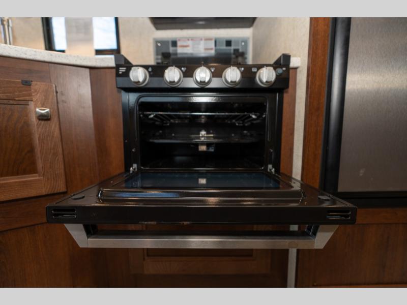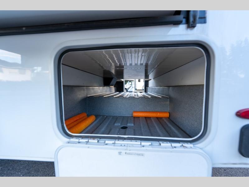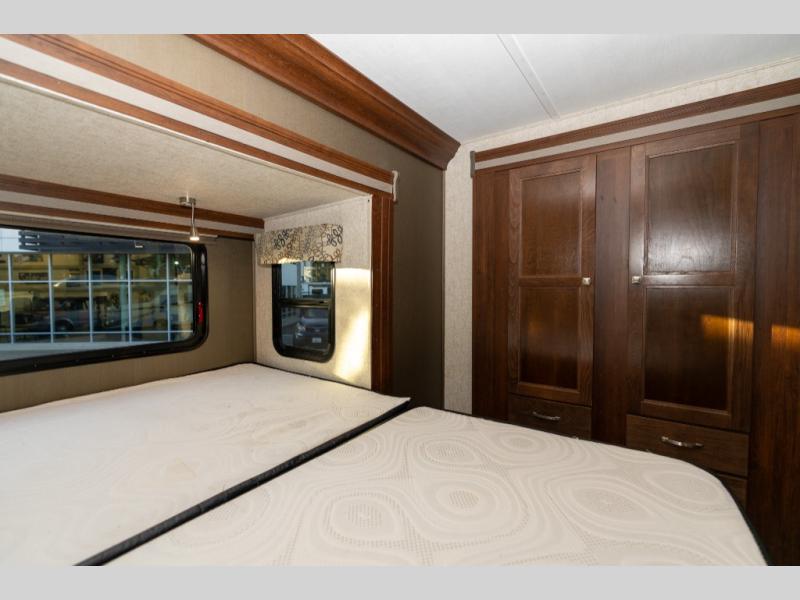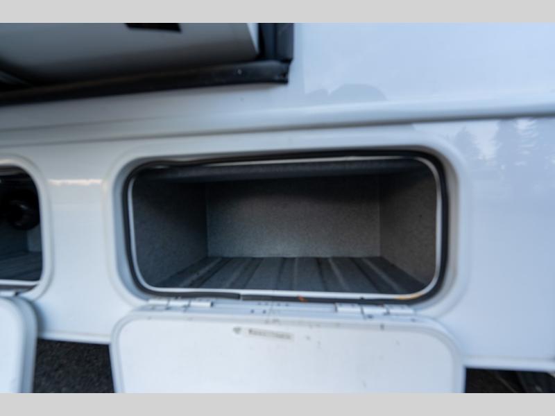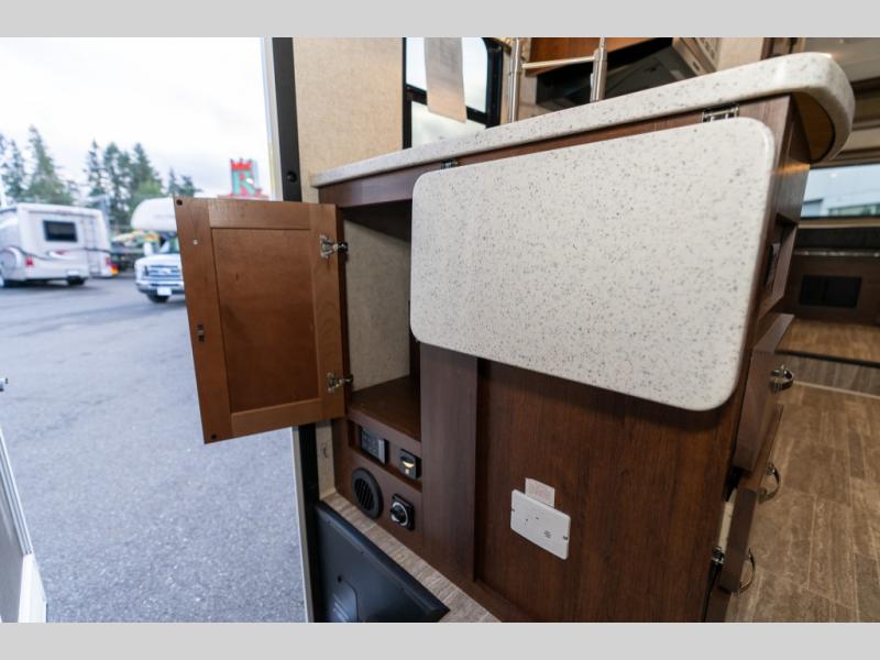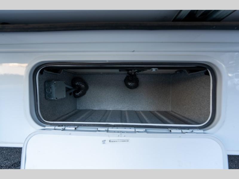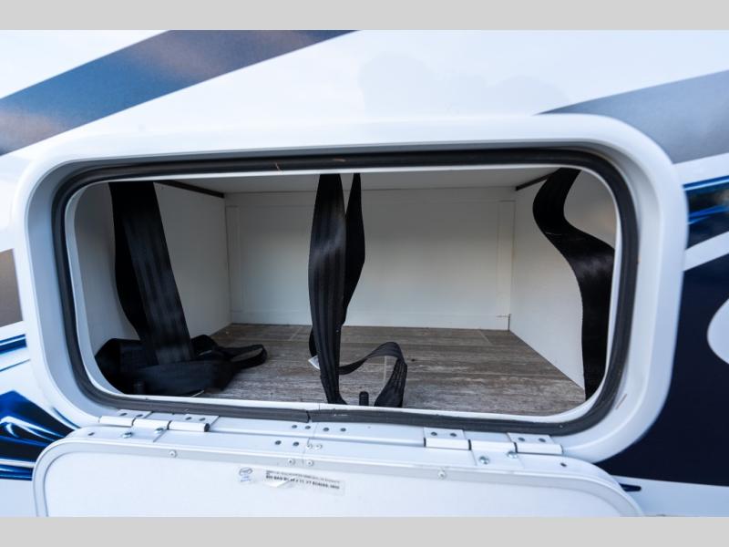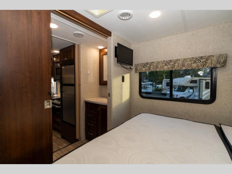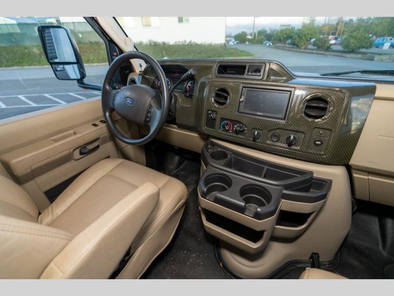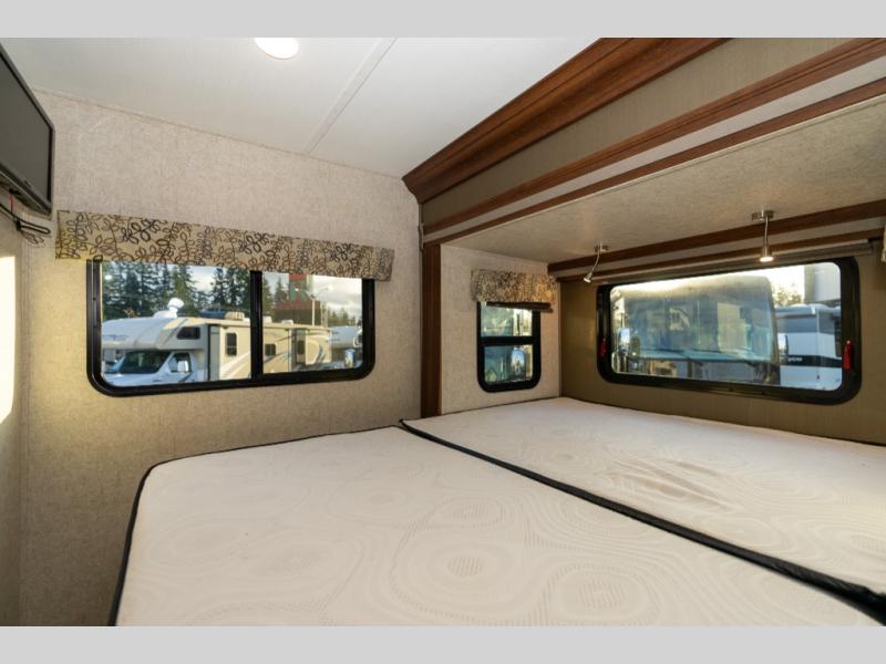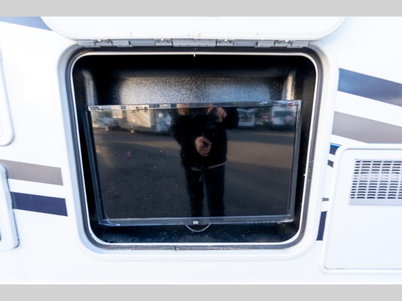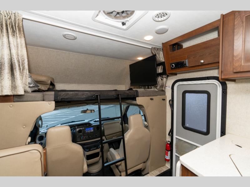 A Ford chassis carries this Forester 2501TS offering ample space thanks to three slide outs. There is a 60" x 80" bed over the cab that can sleep two individuals, the U-shaped dinette can sleep two smaller individuals, and the queen bed can sleep two as well. So you can take this motorhome on a weekend trip and have plenty of space for your friends and their things. There is a slide out wardrobe in the bedroom and overhead storage throughout this unit. If it is a cooler day, there is an LED TV in the front for watching movies, and you also have the option to add a 28" TV outside if you would like.