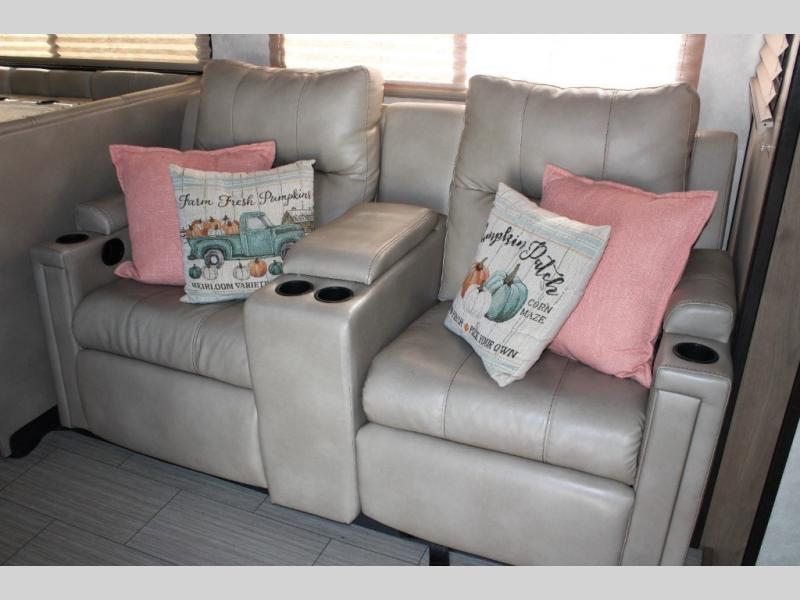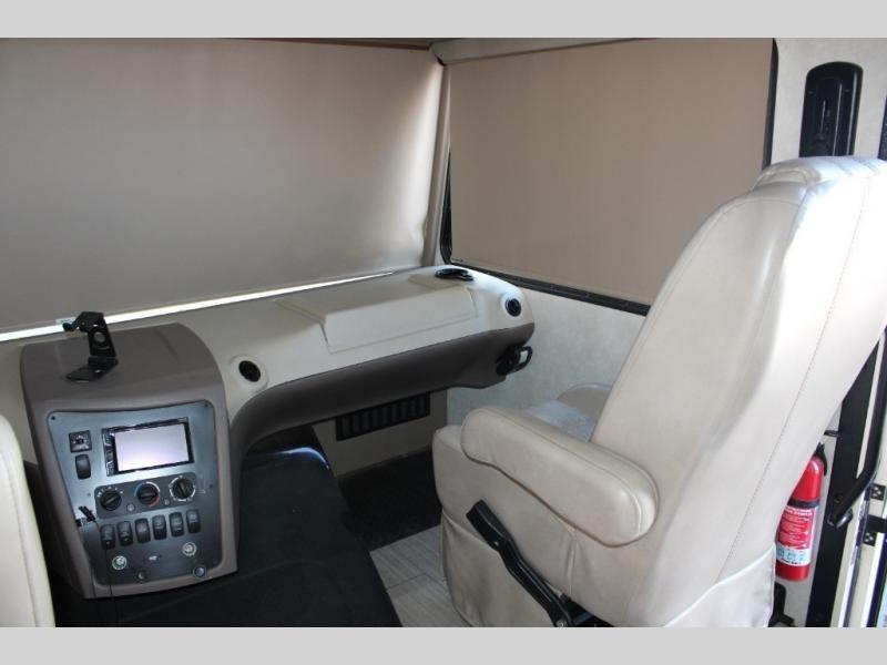 Ultraleather captain's chairs in the cab swivel around to join the living space at the push of a button