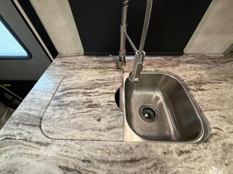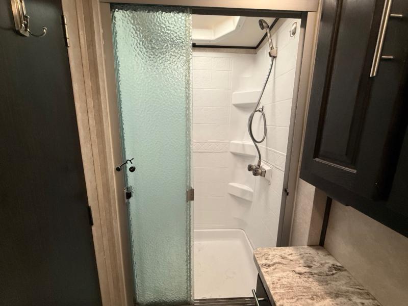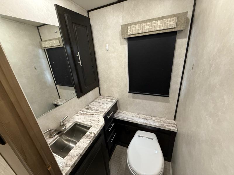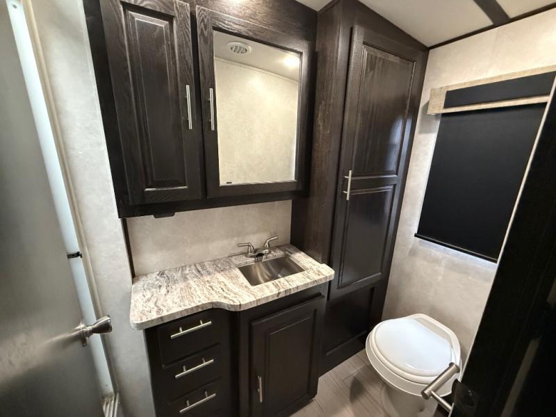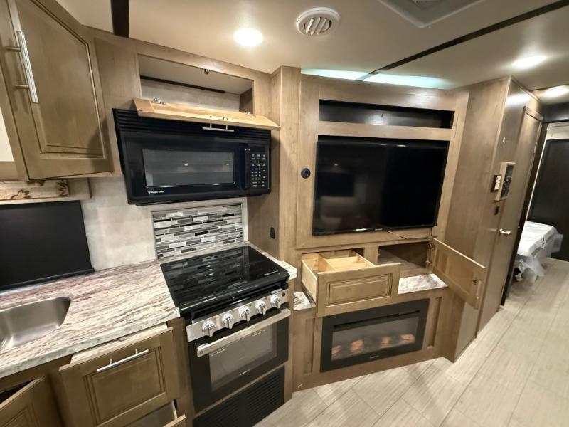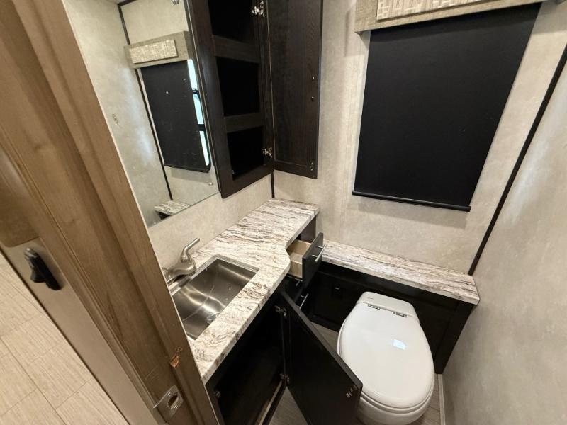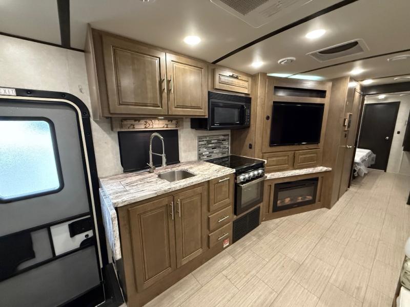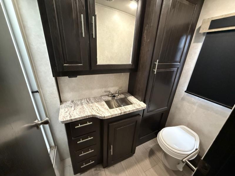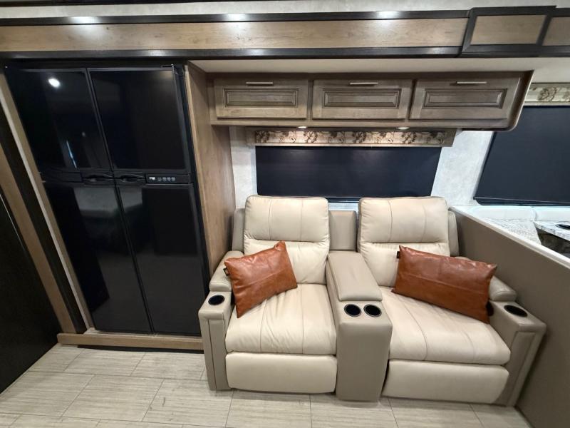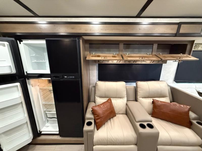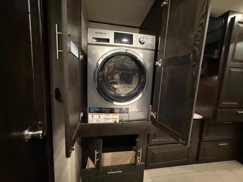 Whether you are driving down the road in comfort or sleeping in your own king-size bed, you will enjoy every minute you get to travel in this coach. You even get to skip the public stops when you have a full bath and a half bath on board. You can quickly set up the power awning to relax outside while watching the outdoor TV or you can take a walk around the campground to start planning your activities. You might have decided to add the washer and dryer option so a load of laundry might even get done. Once you are ready to fill your tummy, the full kitchen offers everything you need, plus a residential microwave. You might even decide to relax on one of the theater seats after dinner as you watch the big game on the LED TV.