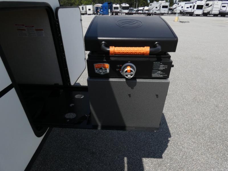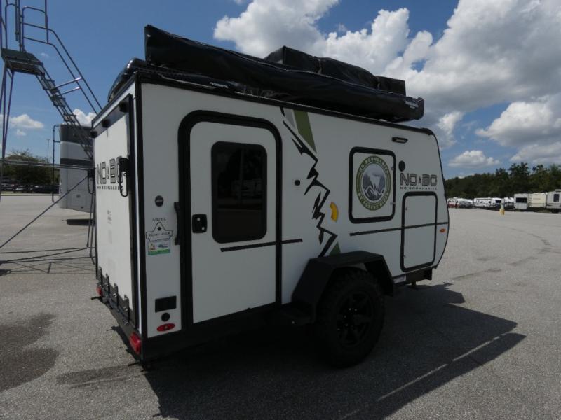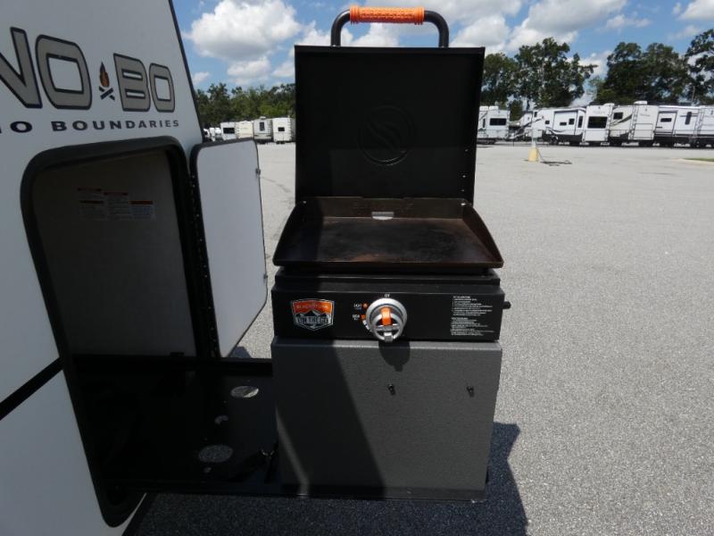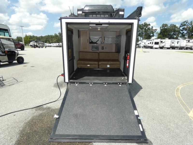 When versatility is what you need, choose this travel trailer toy hauler for your new base camp when out exploring on your ATV or dirt bikes. Model NB10.6 provides a rear ramp door so you can easily load and unload all of your gear and toys. Coming in just under 2,000 lbs., you will easily be able to tow it with your mid-sized SUV or small truck. There is plenty of storage space throughout, plus an outdoor slide out cook-top and cooler so you can enjoy a warm meal. There is also a 60" x 82" lounger in back for two to sleep comfortable inside. LED lighting, both inside and out, makes any task easy to accomplish even after dark.