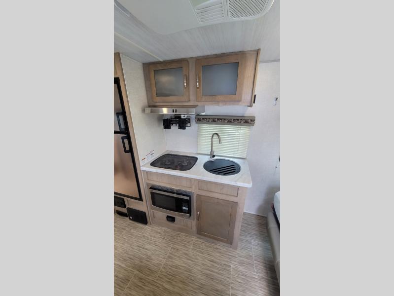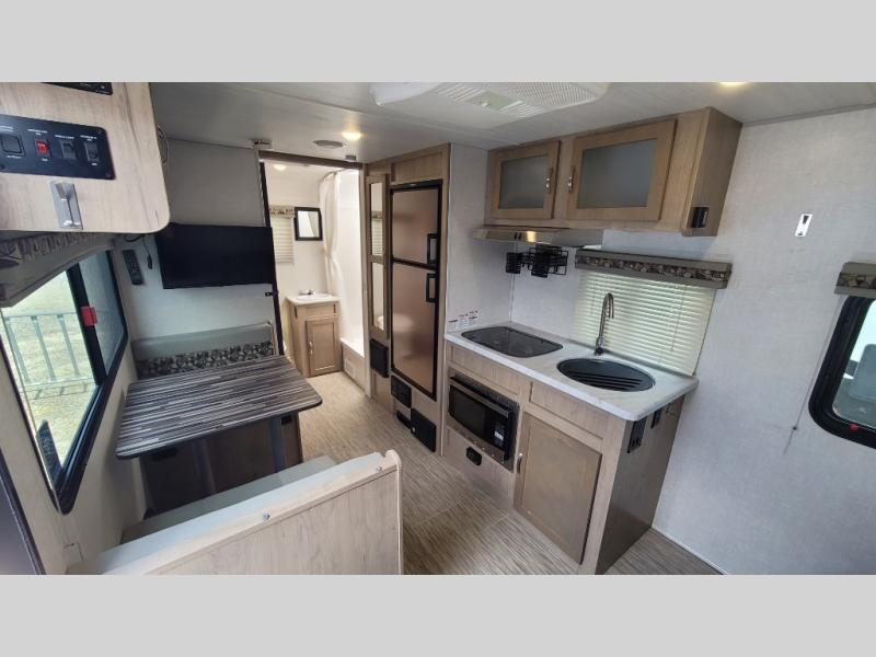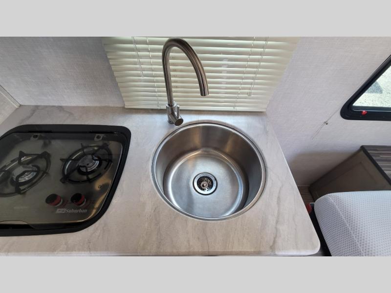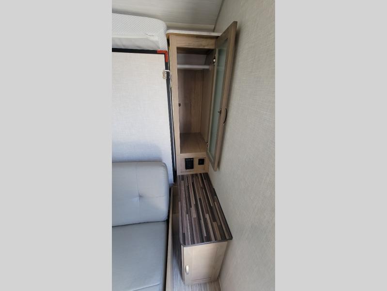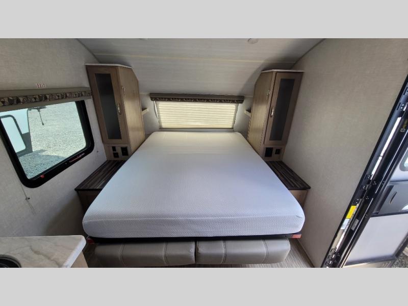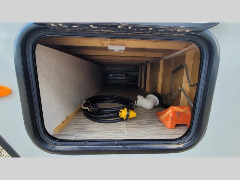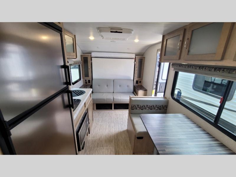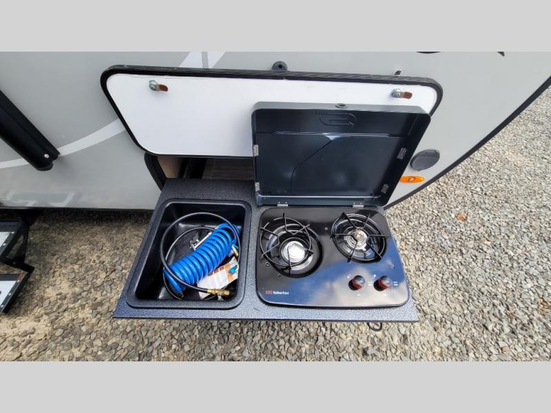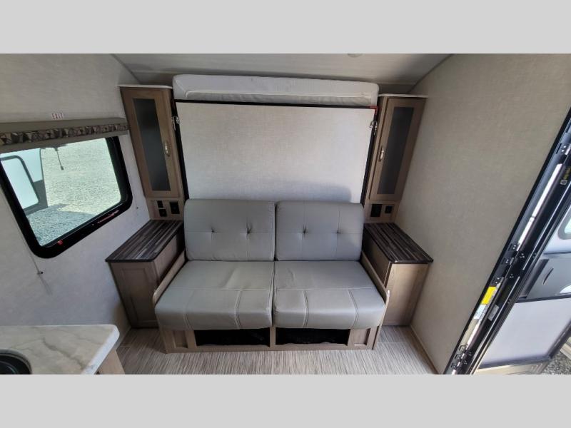 You're going to love all of the conveniences and versatility of this R-Pod travel trailer! The front Murphy bed folds away to reveal the sofa which gives you a comfortable place to sit during the day and to sleep at night too. The rear full bath features everything you will need to get squeaky clean each morning as well as a large wardrobe for you to store your linens. After you have whipped up your best meal with the two-burner cooktop, you can head to the 30" x 75" booth dinette and enjoy eating it there comfortably. There is plenty of storage space inside, but if you need more space, then you can use the exterior pass-through storage!