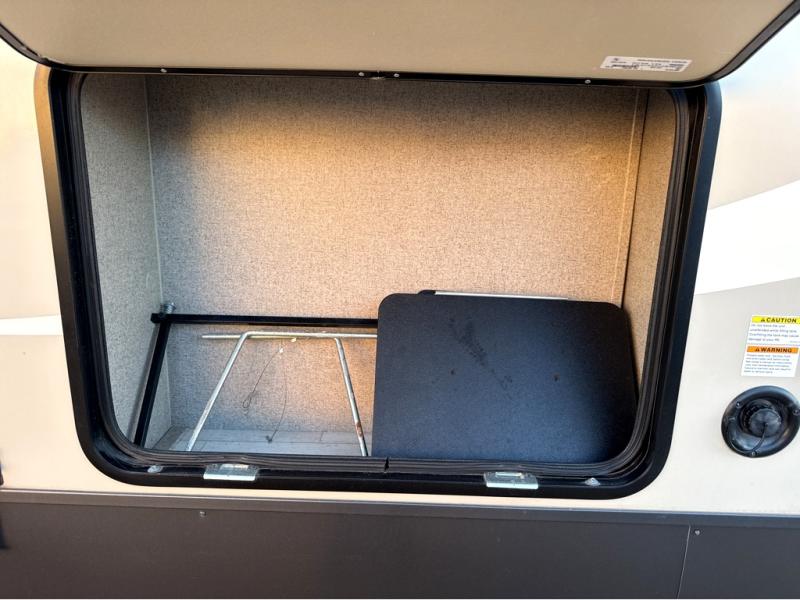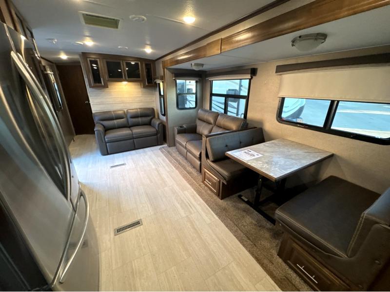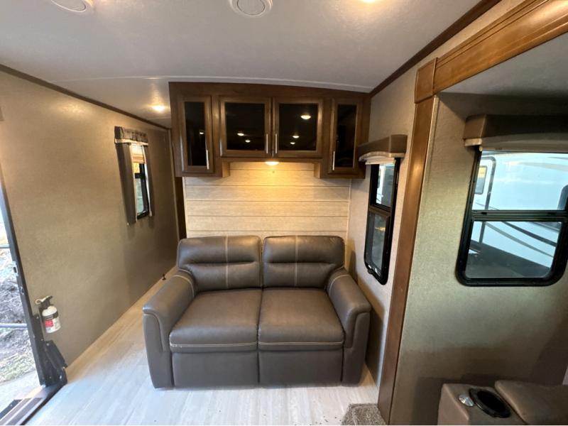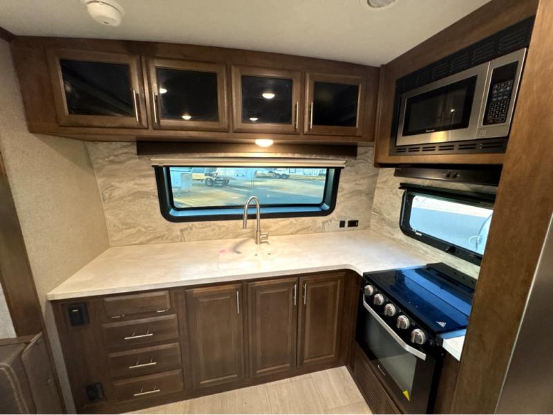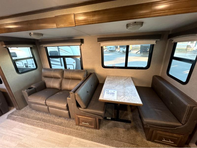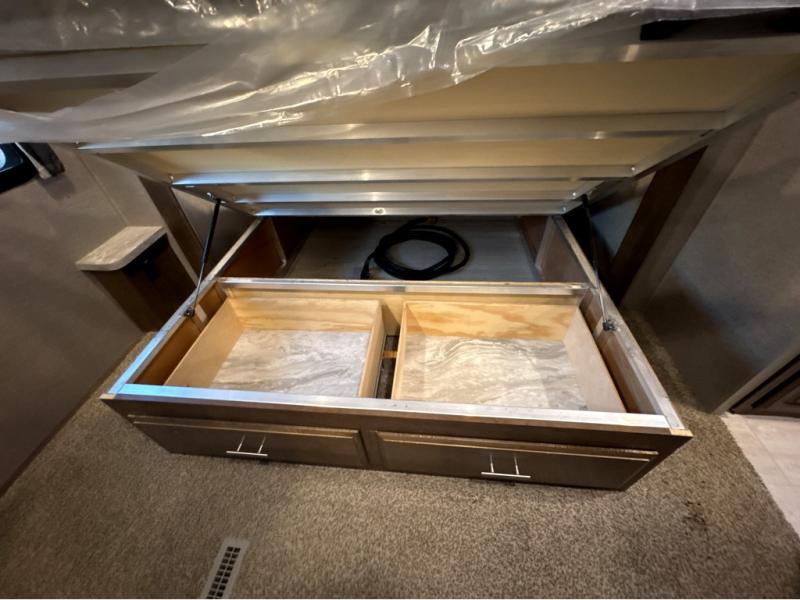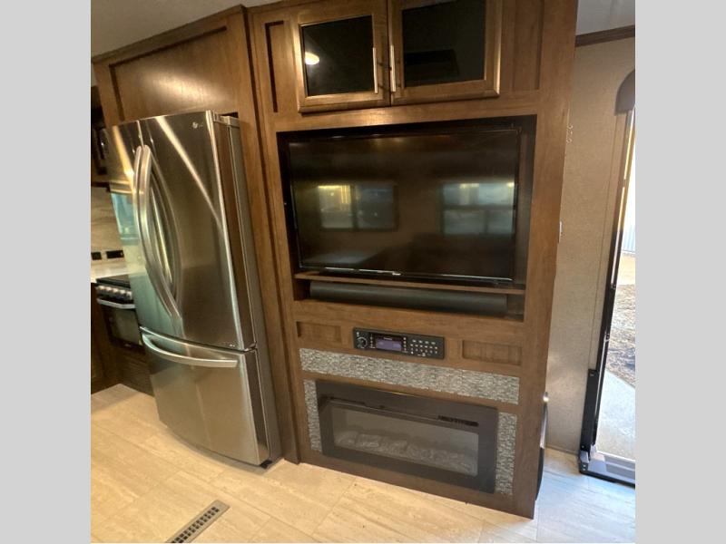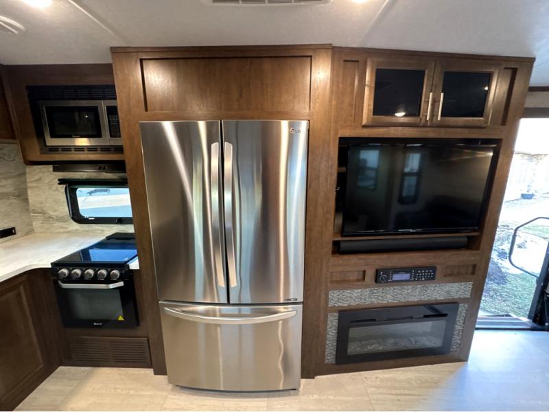This travel trailer includes many at-home comforts and all the conveniences you need while camping with family. The front kitchen includes ample counter space and the pantry will come in handy for paper goods and snacks. You'll find comfortable seating space on the dinette booth, hide-a-bed sofa, and theater seat and the LCD TV with a fireplace will provide all your entertainment needs. This model features a rear private suite with its own exterior entry door, access into the dual entry bath, and a space that has been prepped to add a washer dryer if you choose.