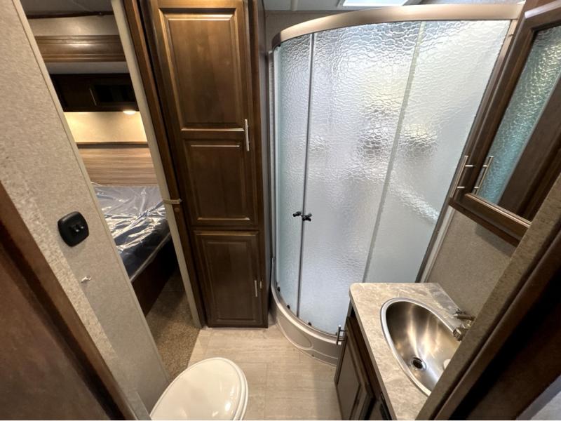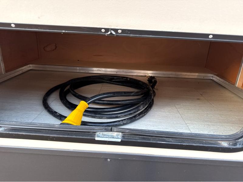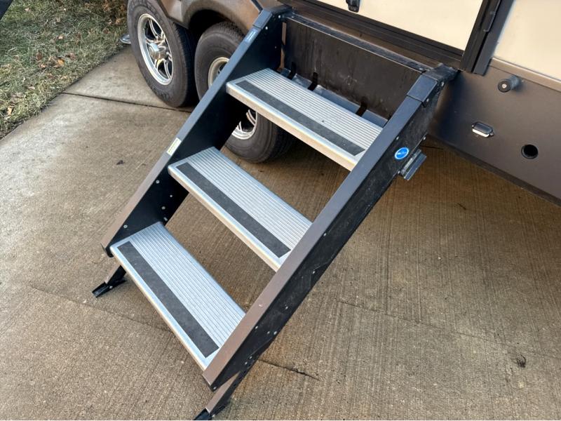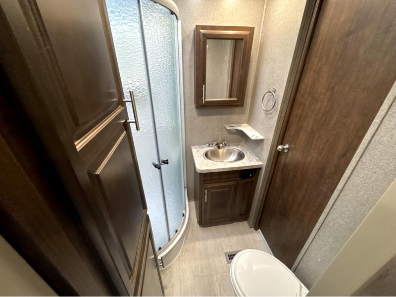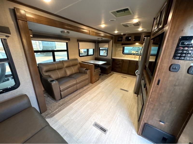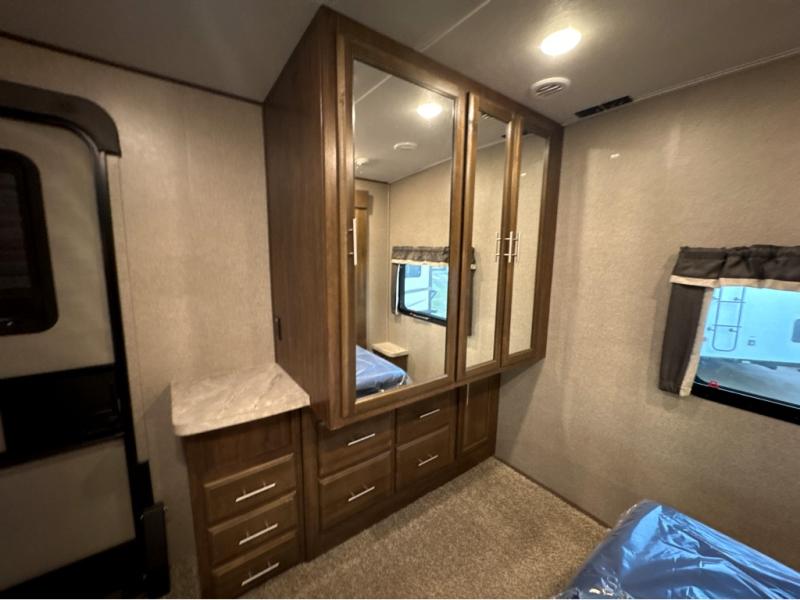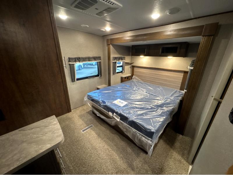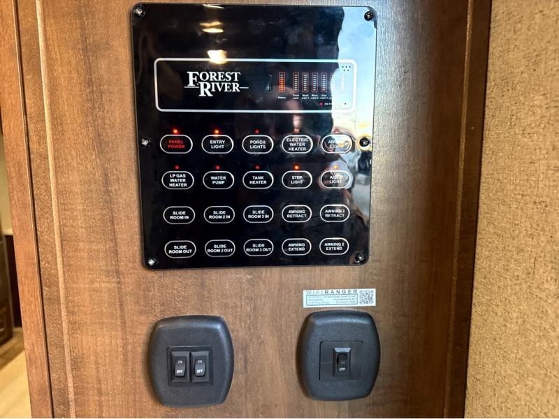 This travel trailer includes many at-home comforts and all the conveniences you need while camping with family. The front kitchen includes ample counter space and the pantry will come in handy for paper goods and snacks. You'll find comfortable seating space on the dinette booth, hide-a-bed sofa, and theater seat and the LCD TV with a fireplace will provide all your entertainment needs. This model features a rear private suite with its own exterior entry door, access into the dual entry bath, and a space that has been prepped to add a washer dryer if you choose.