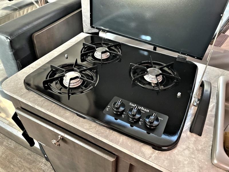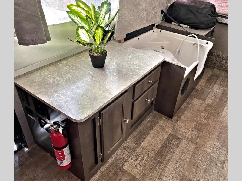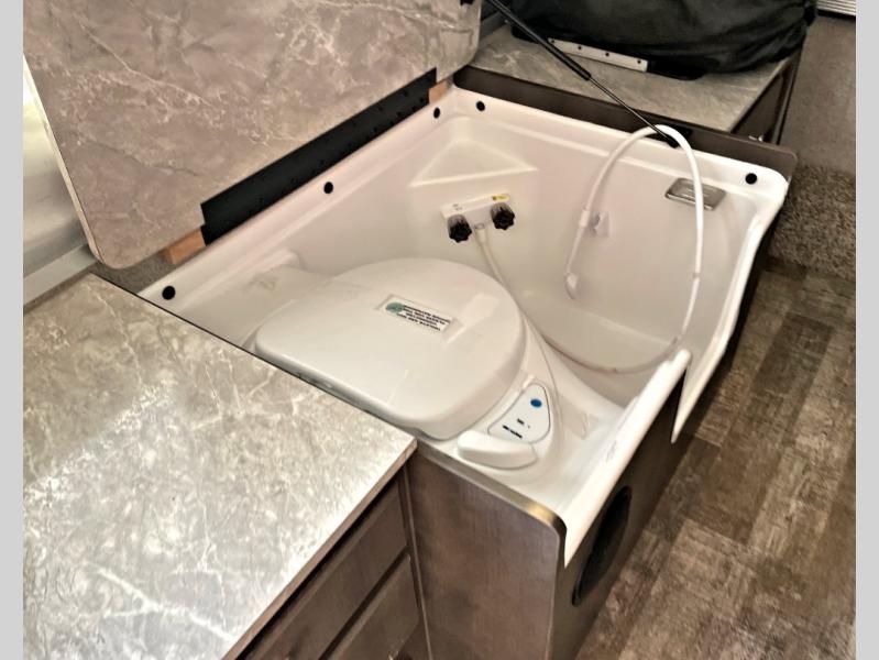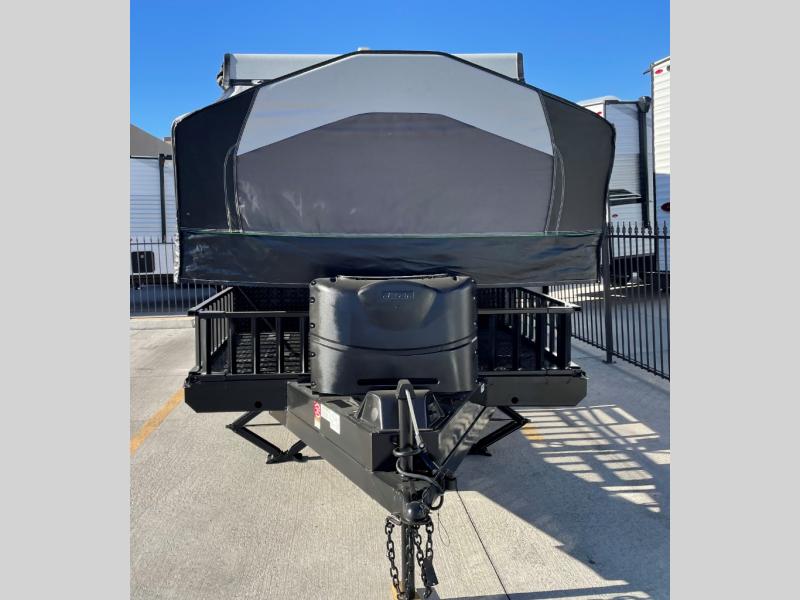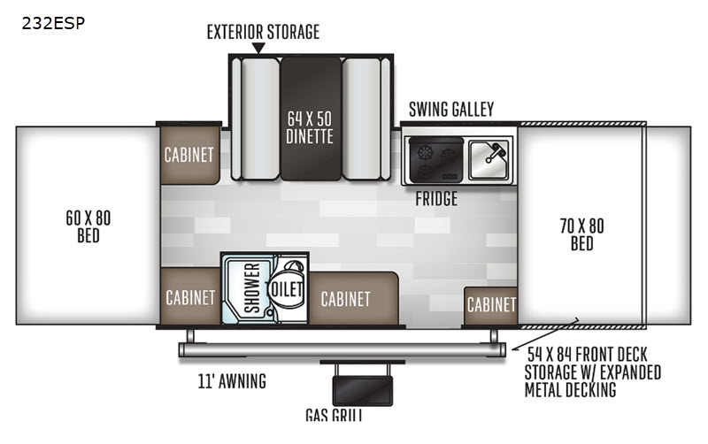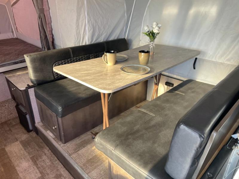 The single slide on this folding pop-up camper helps to open up the floor space. As you enter this Rockwood Extreme Sports 232ESP by Forest River you will find a shower cassette toilet, a rear queen tent bed and a front king tent bed. Plus there is an exterior front deck for storing your toys and outside gear, as well as an additional exterior storage with the booth dinette slide out. You can not only enjoy your meals at the booth dinette, but also transform it into an extra sleeping space at night. Don't leave behind any of your favorite camping goodies because you have four, yes four cabinets to store them all in! So, grab a snack and a chair and head outside underneath the 11' awning and enjoy some fresh air without getting a sun burn.