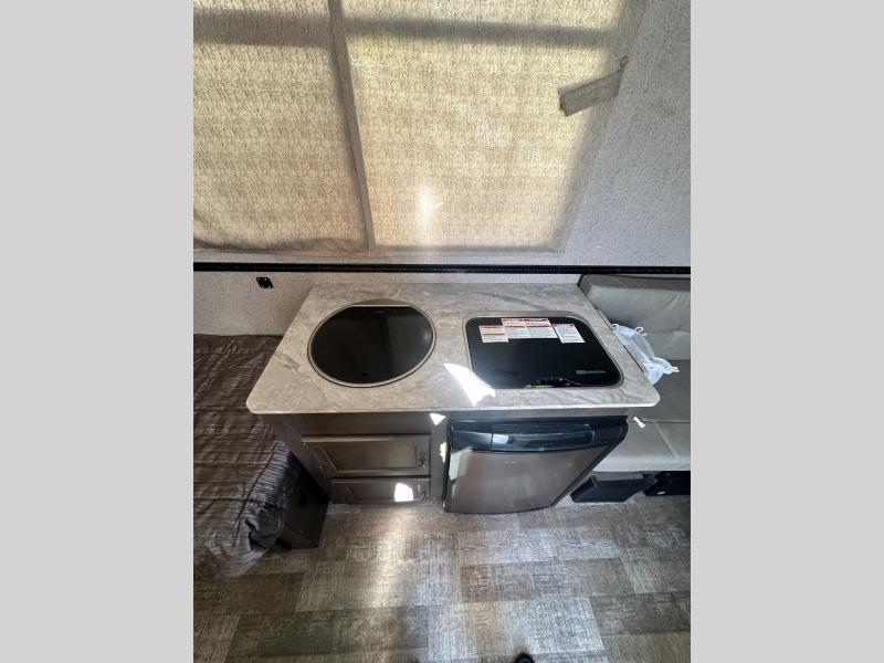 This Rockwood Extreme Sports Package Hard Side A-frame model A213HWESP by Forest River offers an outdoor gas grill with a worktable allowing you to be outside with your family and friends while grilling outdoors. You even have the option of cooking inside on the three burner range and with the microwave with a cabinet for your snacks, plus there is a sink for clean up. When it's time to retire for the night, the 2 twin beds and dinette provide a comfortable inside spot for 3 people. The exterior front storage allows a space for your outdoor gear, and the EZ reach storage trunks provide quick access to your items, plus there is storage inside as well.