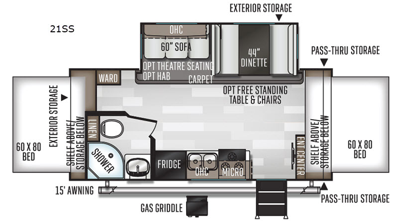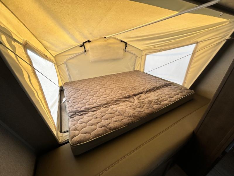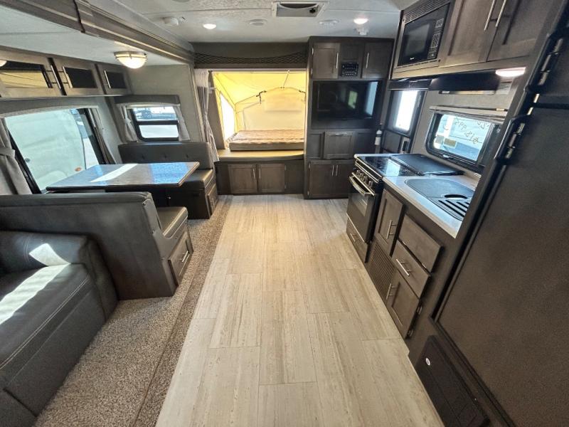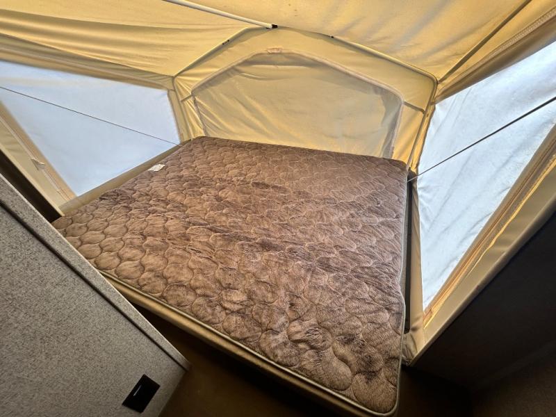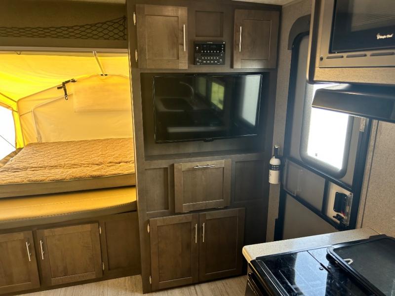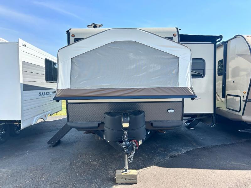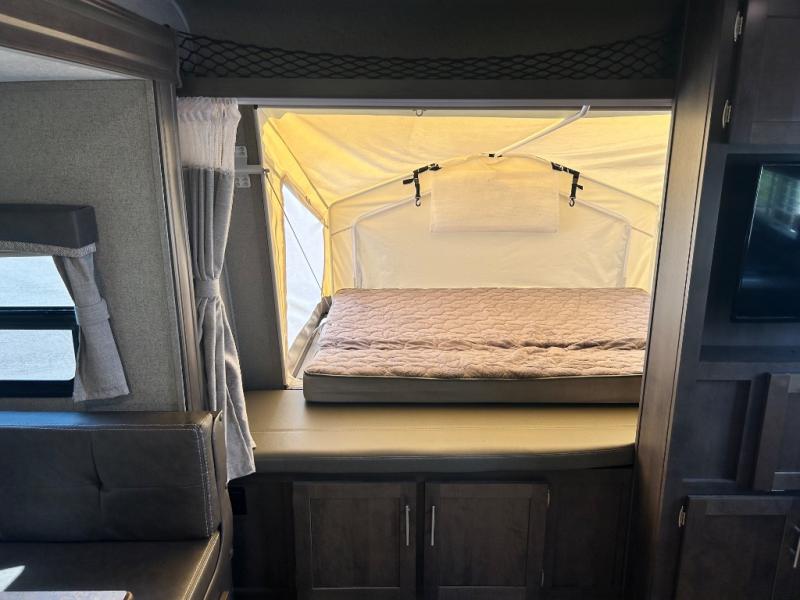 The single slide out on this expandable really opens up the interior for more walking around room along with the two tent end beds including an overhead shelf for storage and sleeping space for four. The dinette and sofa within the slide out offer a place to dine, relax, and even sleep when folded down. Outside you will find even more storage in the pass-through compartment for your outdoor gear, and a gas griddle. You even have options to change up the furniture. Take a look!