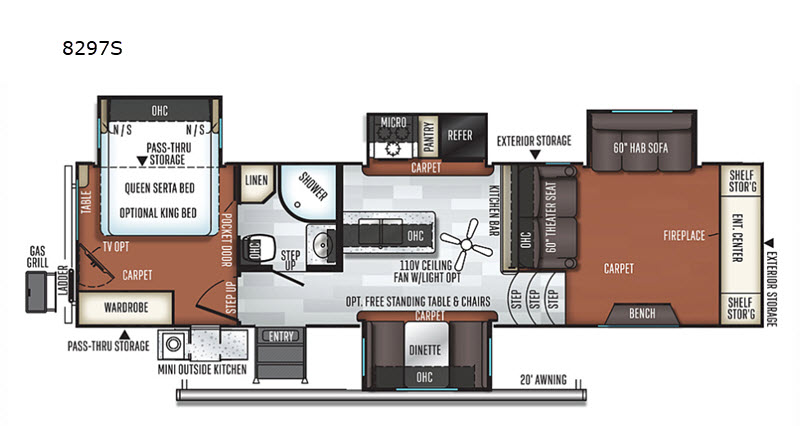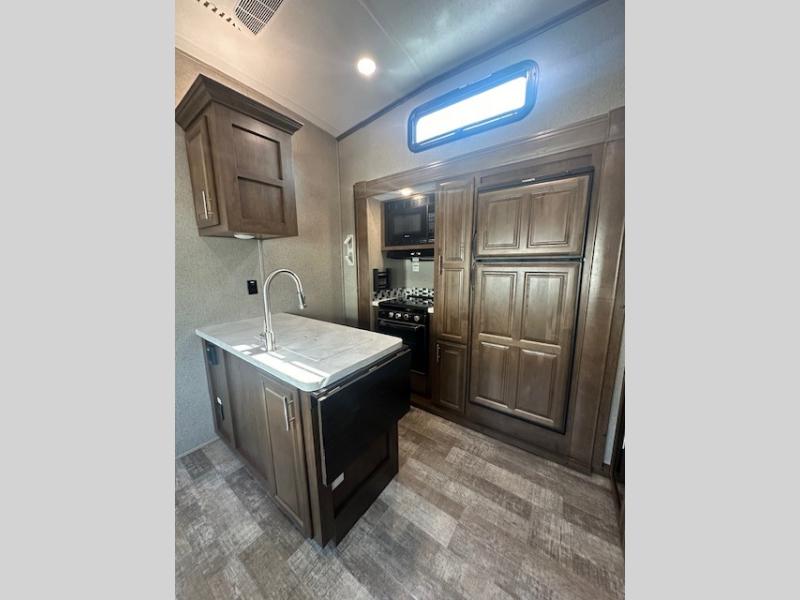 See just how easy and fun camping can be with this fifth wheel with four slide outs. Straight in from the door is the bathroom where you can easily get ready for your day. The rear bedroom is a spot where you can find comfort and rest. Here, you'll find a Serta queen bed, a large wardrobe, and you can add an optional TV. The kitchen area features dual opposing slide outs and plenty of room to move about while you fix your meals, plus a counter peninsula. In the evening plan to retreat to the front living area where you can watch your favorite movie or show at the large entertainment center, plus there is a fireplace which is nice for those chilly evenings. Within the roadside slide out there is a 60" hide-a-bed sofa where your kids or guests can sleep at night. This fifth wheel also includes a mini outside kitchen the chef of the family will love!