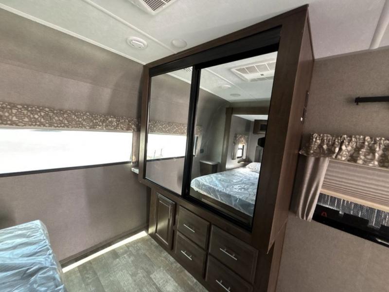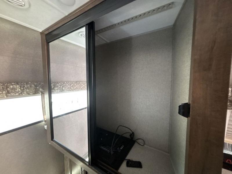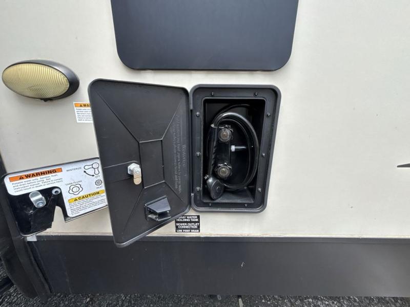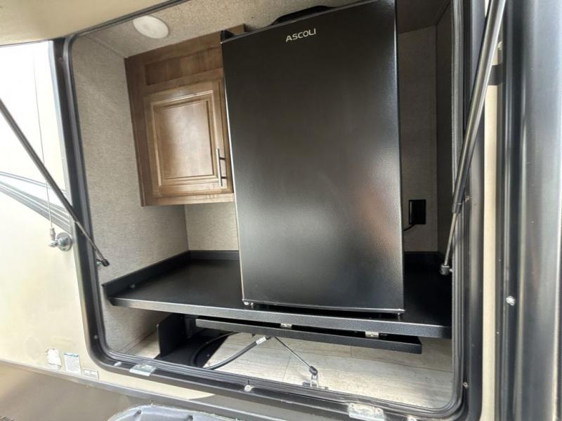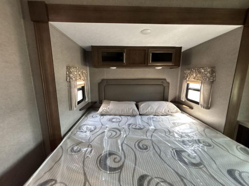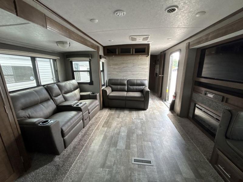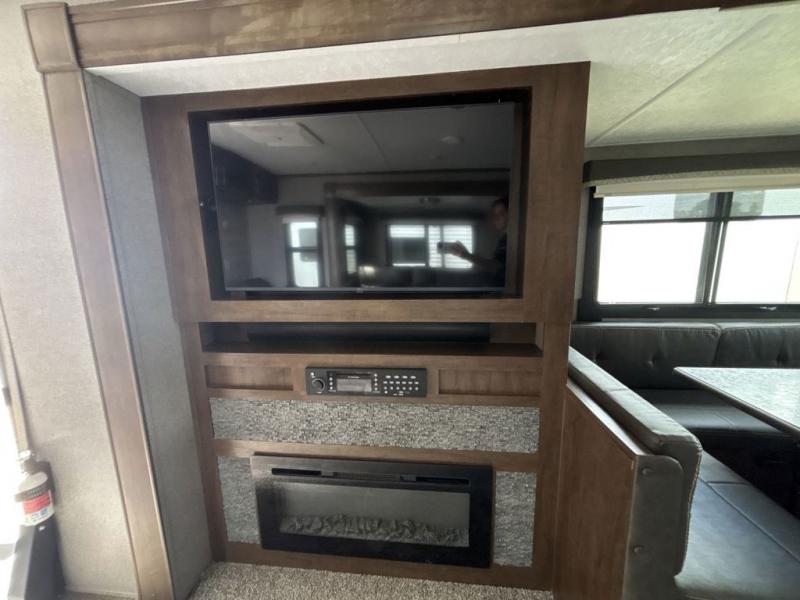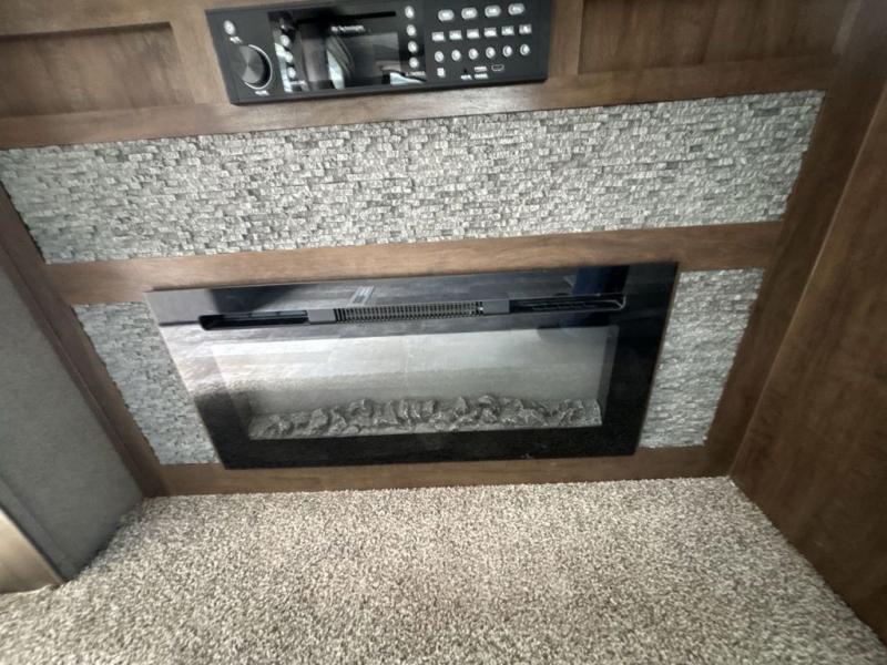 Whether you are planning a weekend camping trip or a week long trip, choose to camp with this travel trailer! With three slide outs, your family of six will enjoy all the extra interior space. In the rear you will find a kitchen area with the amenities along the rear wall. Within the curbside slide out there is a king "u" dinette where you can dine during the day, and at night easily convert this area into additional sleeping space. On those chilly evenings plan to enjoy a fire in the fireplace or watch a movie on the LCD TV. When you are ready to turn in for the night, the front bedroom includes a Serta queen bed or you can choose an optional king bed. The bedroom also features a wardrobe and you even have the option to add a TV. For the chef in the family the exterior kitchen will be a draw! Here there is a refrigerator, a two burner swing-out stove, plus an outdoor gas grill.