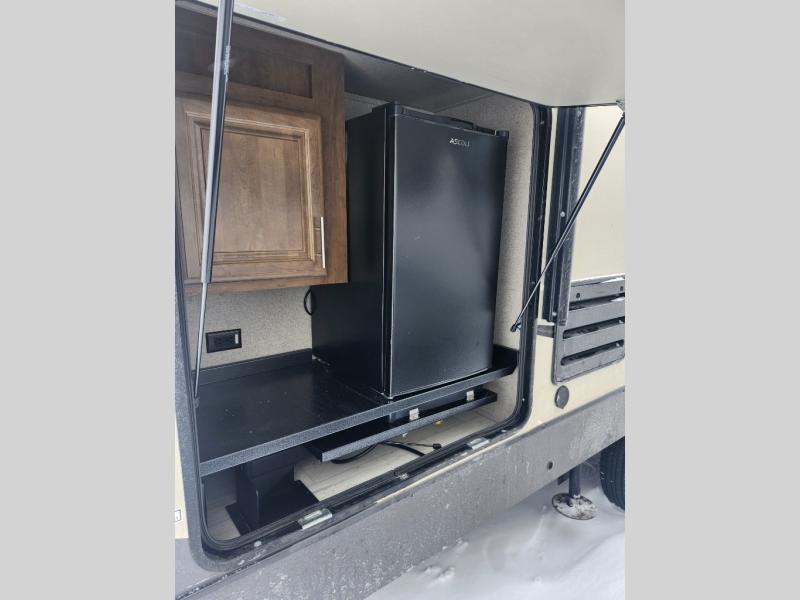 You won't want to camp any other way once you step inside this Forest River Rockwood Ultra Lite fifth wheel! With not only an outdoor kitchen, but also an outdoor gas griddle, you can create your best meals while breathing in some fresh air. The dual-entry bath makes it easy for anyone to access, and the bathroom skylight adds some natural lighting. There is plenty of storage throughout the inside between the large wardrobe in the front master suite, the overhead cabinets all throughout the unit, the kitchen pantry, and even a storage space behind the LCD TV at the entertainment center. If you need more storage for your larger items, then you can easily store and access them with the exterior pass-through storage compartment or even the front exterior storage area too!