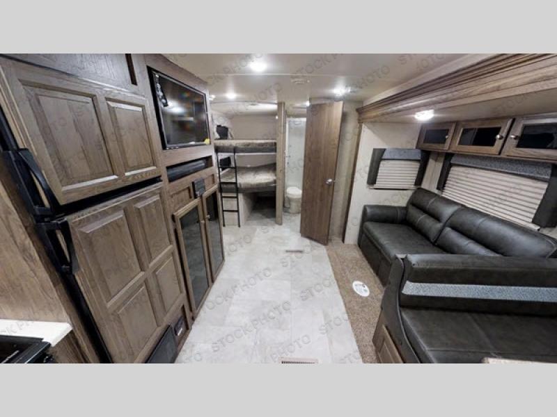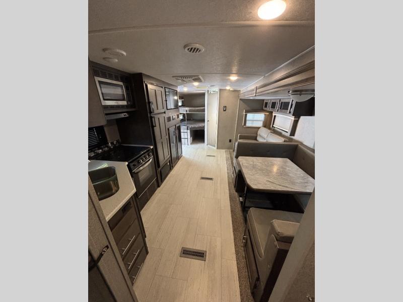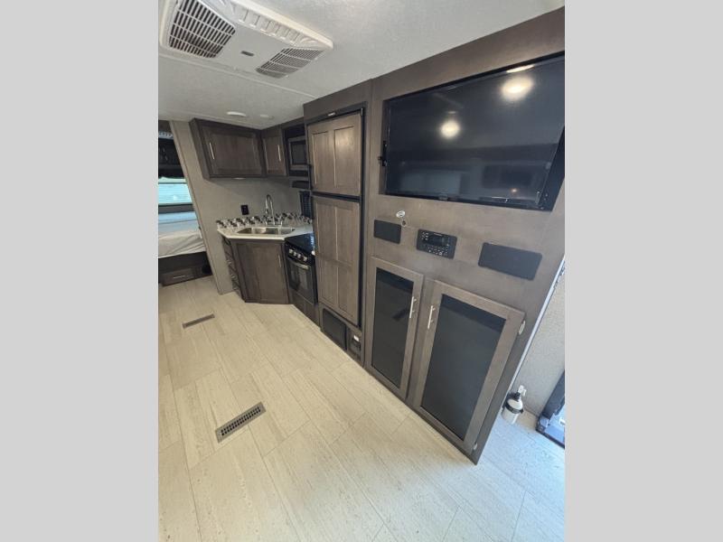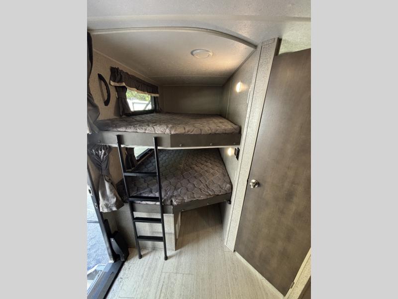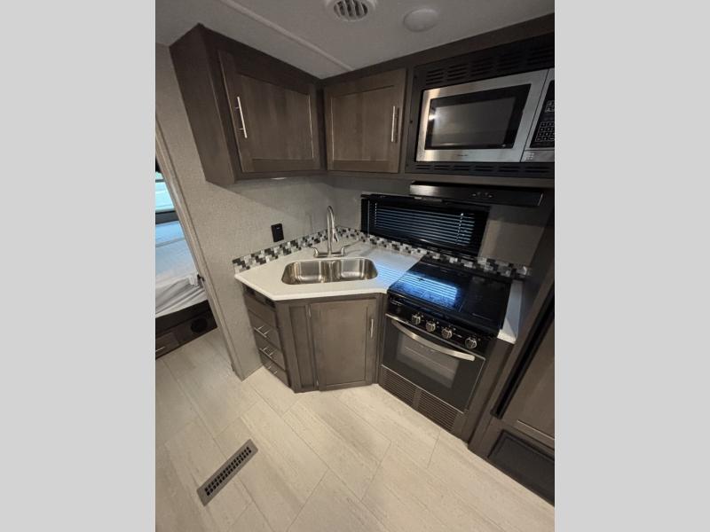 Enjoy any camping trip with this Forest River Rockwood Ultra Lite travel trailer. The kitchen area is where you can easily create meals and snacks while on the go with a pantry big enough to store your favorite goodies! Opposite of the kitchen area, you will find a slide out with a 60" hide-a-bed sofa and a U-shaped dinette. Both of these offer overhead cabinets to keep things tucked away and organized. The double-size bunks are sure to please your kids, and they will also love being right next to the rear bath, especially for those late night trips to the bathroom. There is also an outdoor kitchen so that you can enjoy the outdoors to its fullest, plus a 21' power awning with LED lights to protect you from the sun's rays!