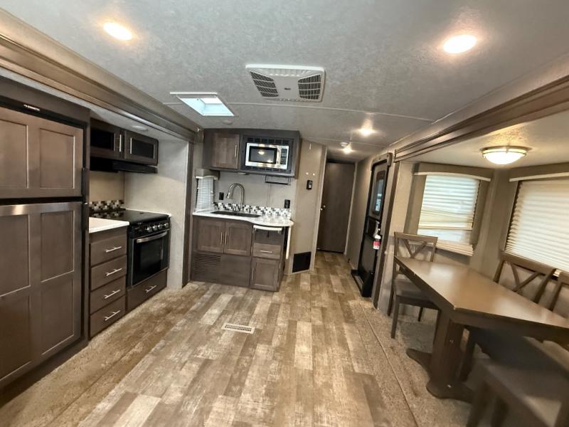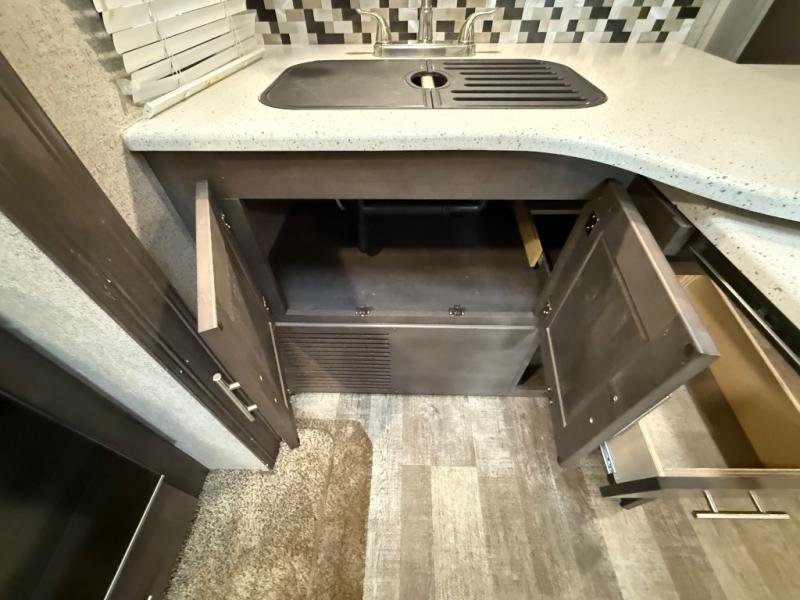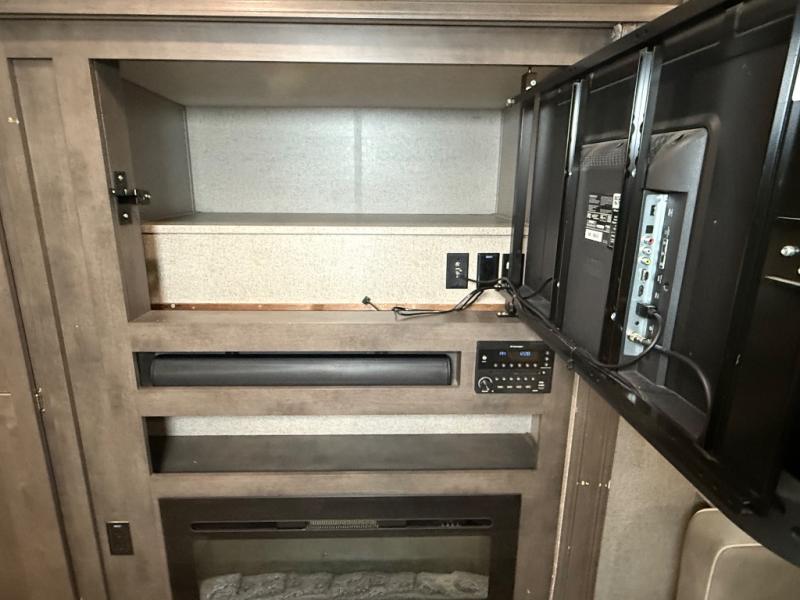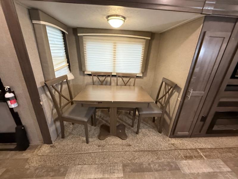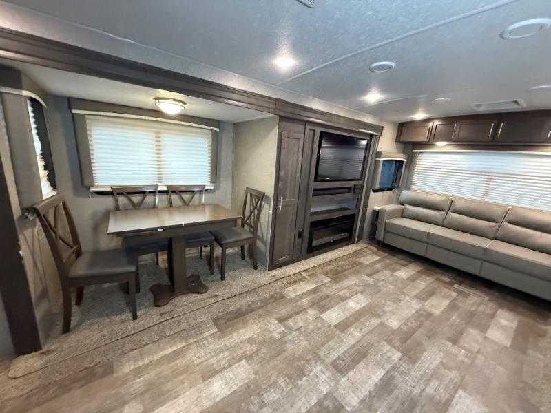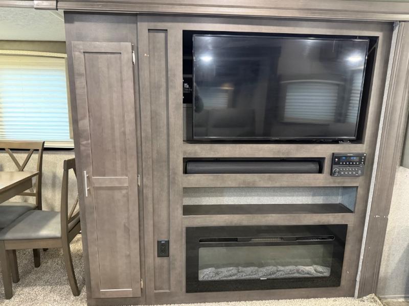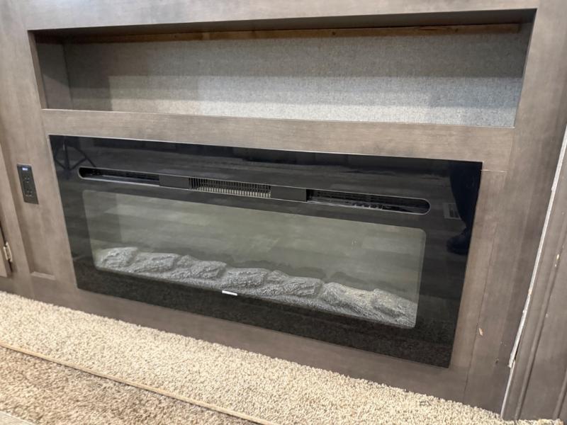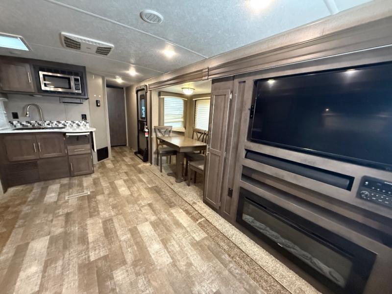 If you have been dreaming of traveling in comfort with everything you need to stay at your favorite campground for a weekend or longer, then this Forest River Rockwood Ultra Lite travel trailer might just fit your dreams and needs perfectly. You will enjoy having your own space in the front master suite with a queen Serta bed that has nightstands on either side, a wardrobe slide, and a private entrance into the dual-entry bath. You will find sleeping space for your kids or grandkids on the booth dinette and the 76" hide-a-bed sofa once prepared for the night. You might even fall asleep in the theater seating if you sit there long enough in front of the fireplace. The chef can wake up the next morning to make breakfast on the outside kitchen or inside with the full amenities including a countertop extension!