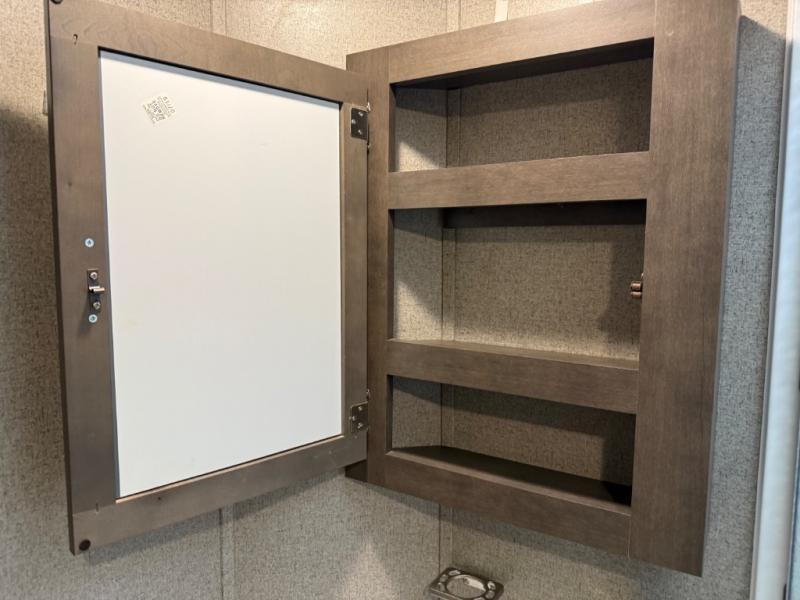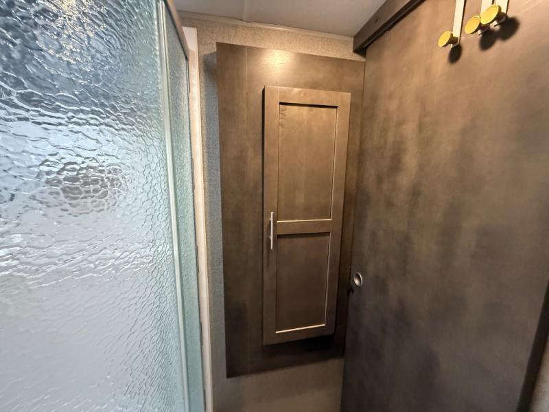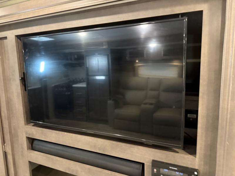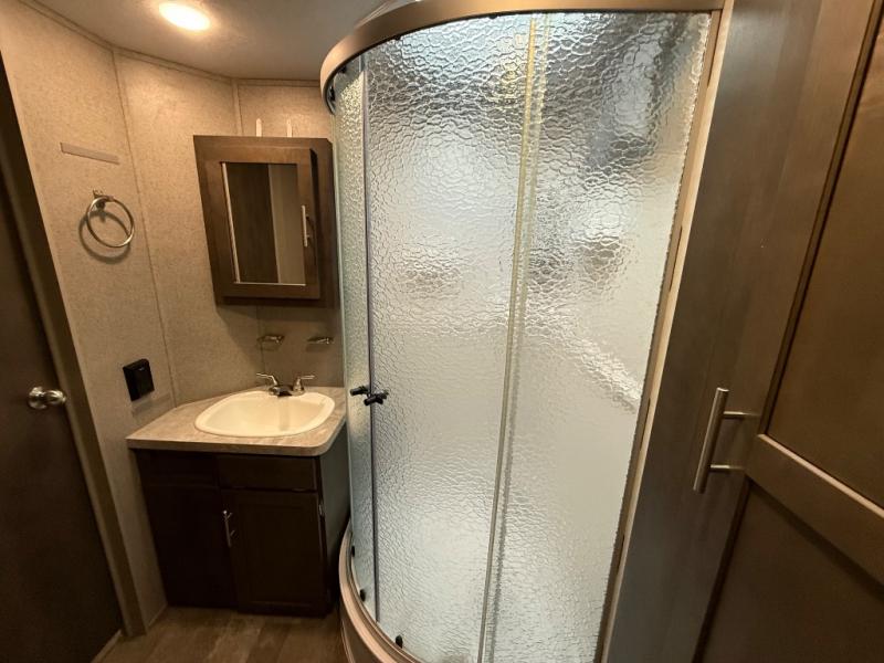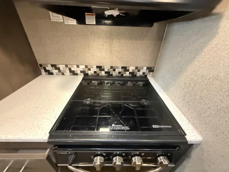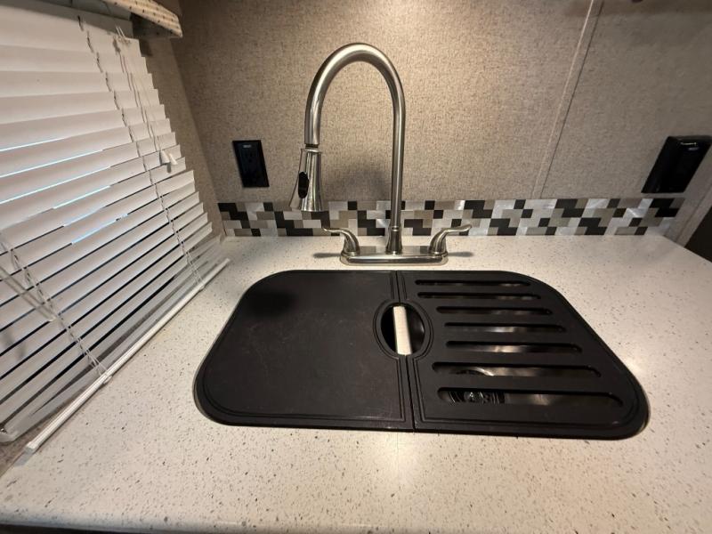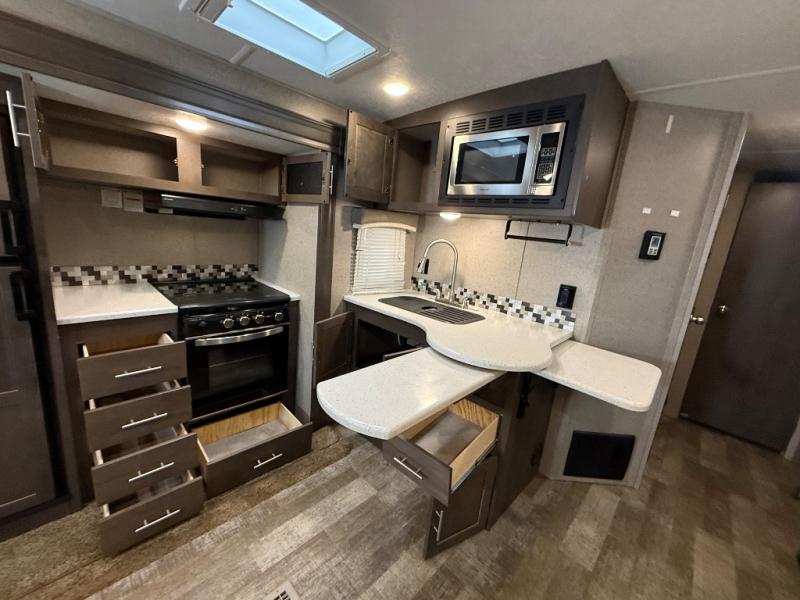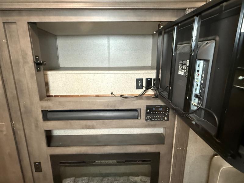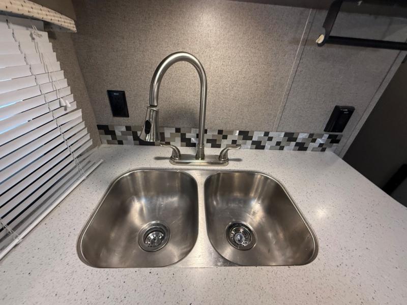 If you have been dreaming of traveling in comfort with everything you need to stay at your favorite campground for a weekend or longer, then this Forest River Rockwood Ultra Lite travel trailer might just fit your dreams and needs perfectly. You will enjoy having your own space in the front master suite with a queen Serta bed that has nightstands on either side, a wardrobe slide, and a private entrance into the dual-entry bath. You will find sleeping space for your kids or grandkids on the booth dinette and the 76" hide-a-bed sofa once prepared for the night. You might even fall asleep in the theater seating if you sit there long enough in front of the fireplace. The chef can wake up the next morning to make breakfast on the outside kitchen or inside with the full amenities including a countertop extension!