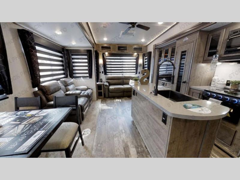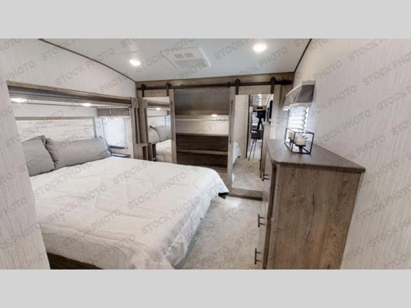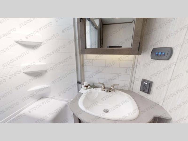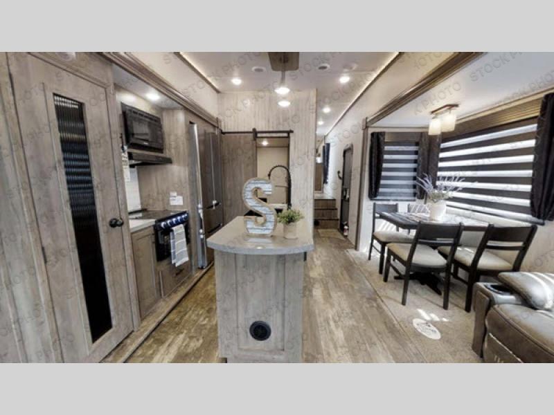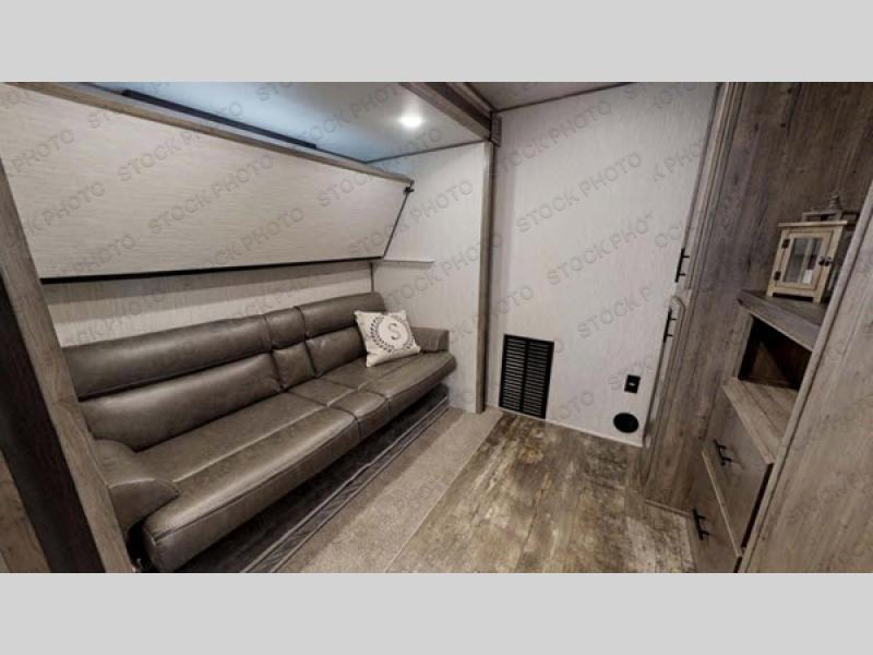 There's something for everyone in this Sabre fifth wheel! From the front private bedroom with a queen bed that can be replaced for an optional king bed and a front closet with an area prepped for the optional washer and dryer, to the second bedroom featuring a jackknife sofa, a trundle bed, a bunk bed, and a loft area above it all, this unit is super accommodating. The kitchen island not only provides extra counter and storage space, but is also makes cleaning up even easier with the farm-style sink and deluxe pull-down faucet. After you have spent a fun day in the sun, head to the rear living area and relax on either the tri-fold sofa which can be transformed into an extra sleeping space or on the home theatre seating with heat and massage. As you sit back and relax, you'll find a fireplace directly across with a large residential TV above it for you to watch your favorite movie!