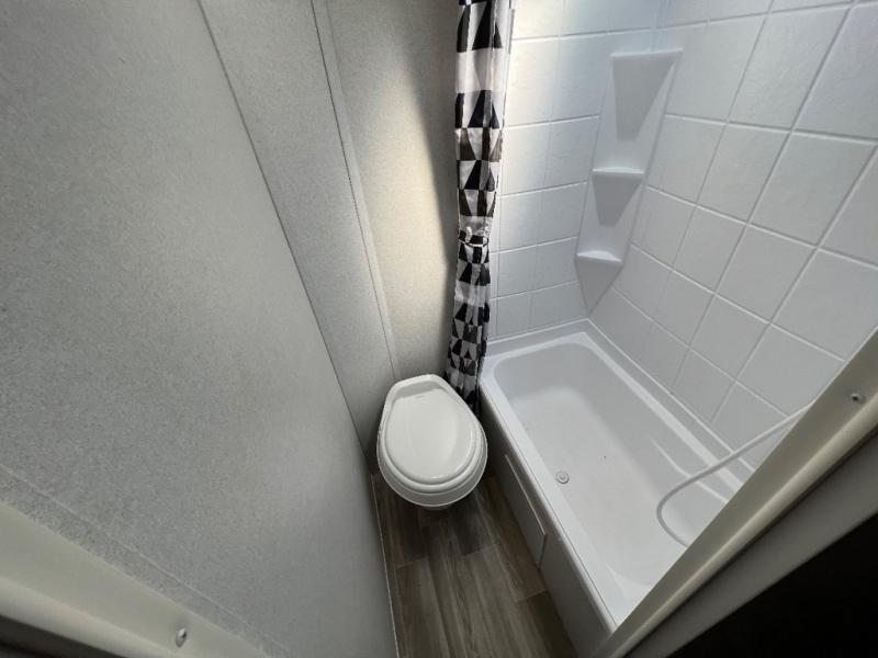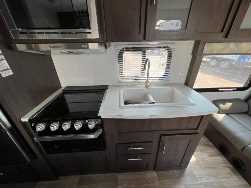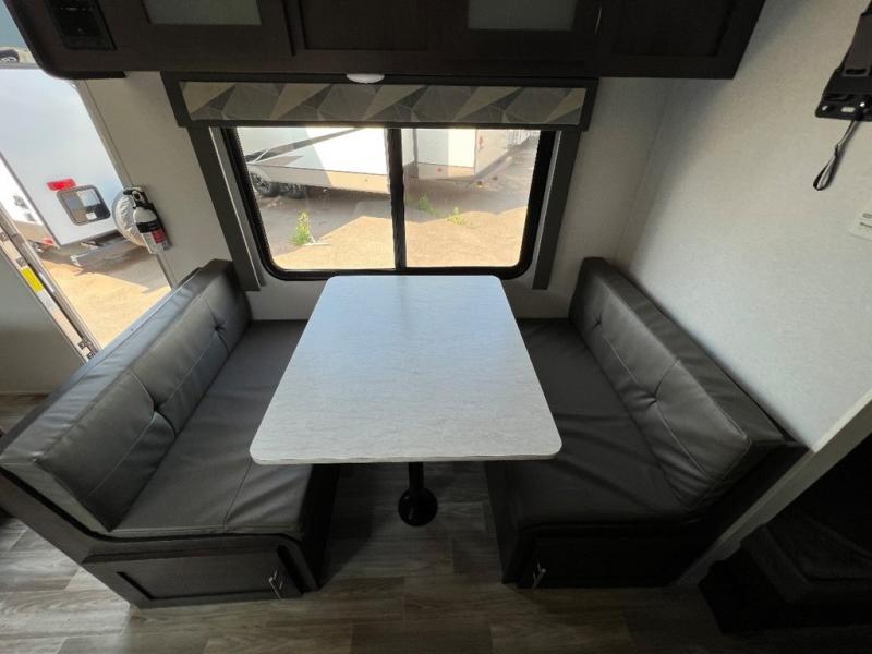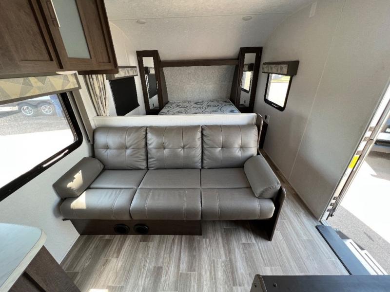 Double size bunk beds make this a fun travel trailer for the kids, so invite some friends to join them for a weekend getaway! You will have your own walk-around queen bed up front while your kids and their friends can sleep on the bunk beds, the sofa and the booth dinette after the furniture is easily set up for nighttime. Everyone will surely appreciate having access to the private toilet and shower/tub room with the bath sink just outside the door. This setup will allow someone to shower while another person is washing their face. The kitchen provides everything you will need to keep everyone fed, plus you can add the optional outside kitchen if you like.