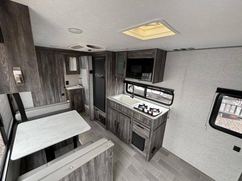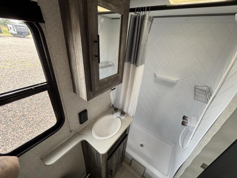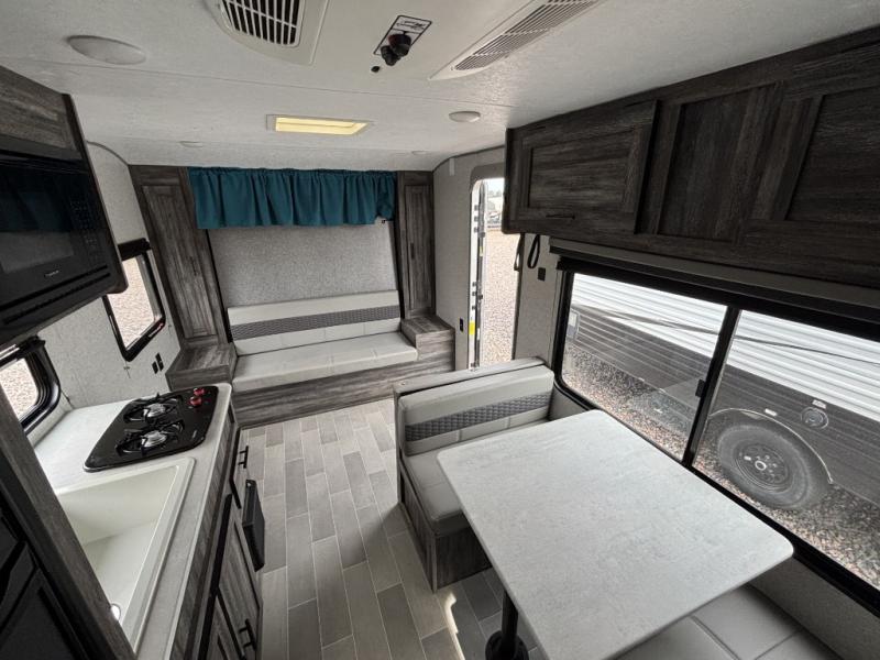 You can decide to leave for the weekend, easily hitch up and load up, and take off! Then enjoy the great outdoors with a 12' full-length power awning with adjustable legs, and the pass-through storage is where you will get your camping chairs, charcoal, and such. The USB charging outlets will keep your electronics running, and the queen Murphy bed will give you a good night's rest after a fun day hiking, biking, or relaxing at your campsite. You will find a rear full bathroom offering a linen closet on top of all the basics needed to get cleaned up before bedtime. And the booth dinette will provide extra sleeping space when you aren't playing games or eating your meal inside.