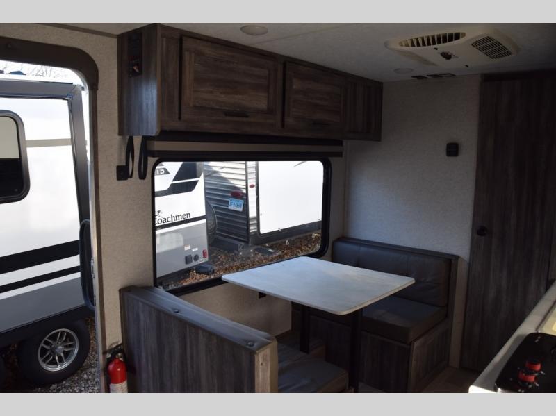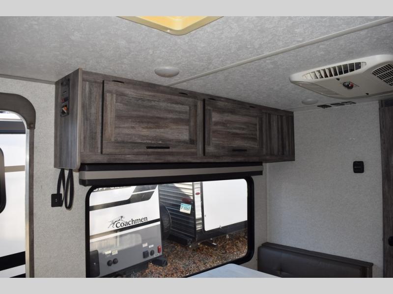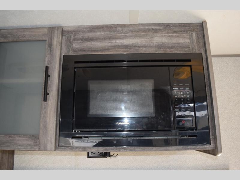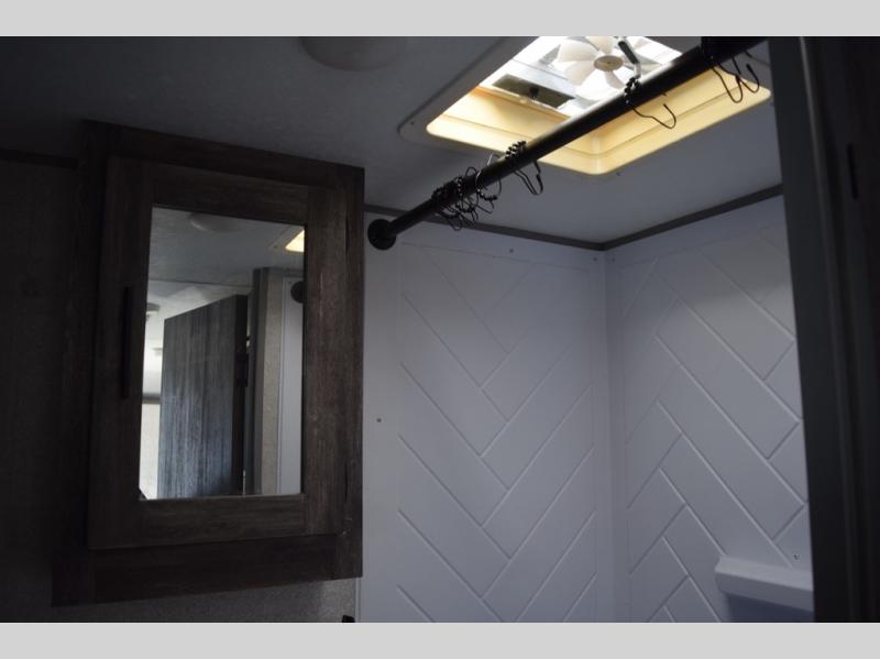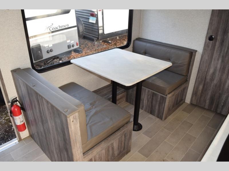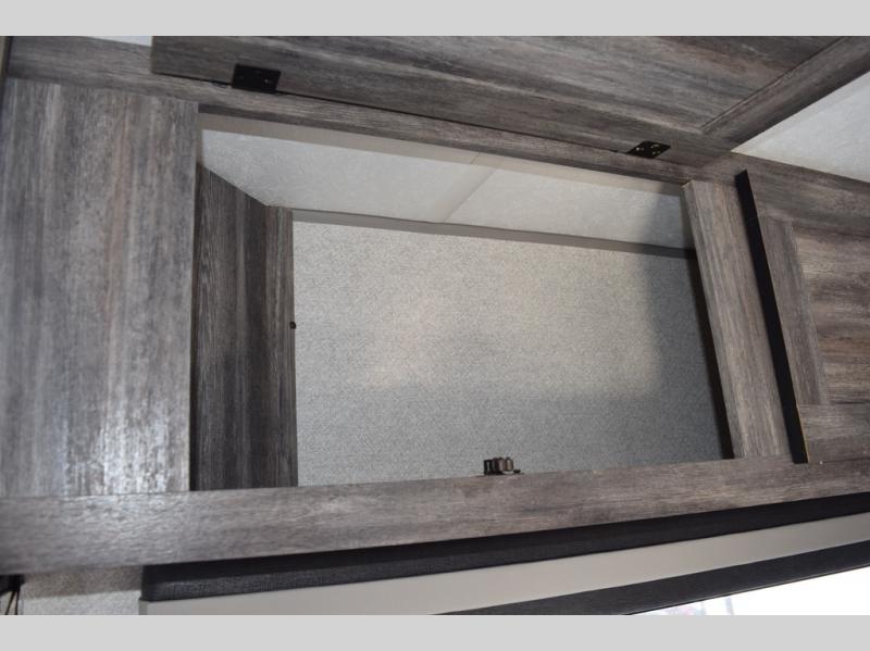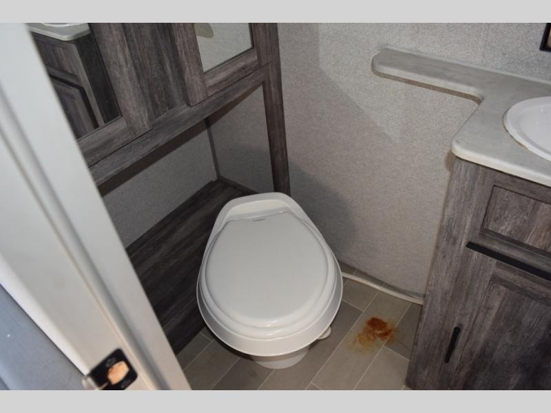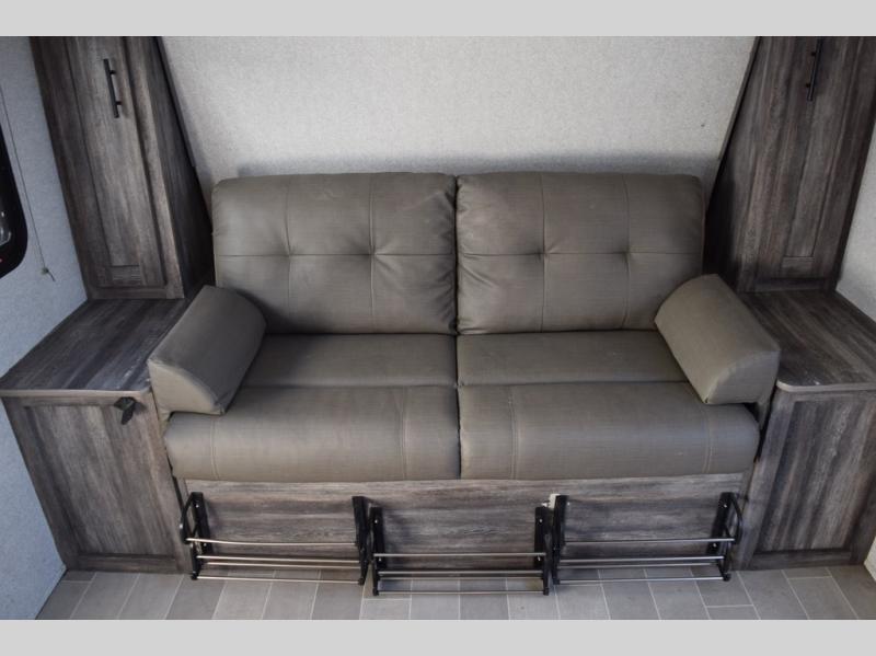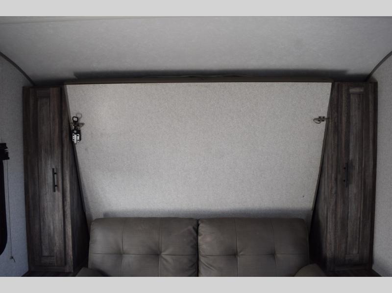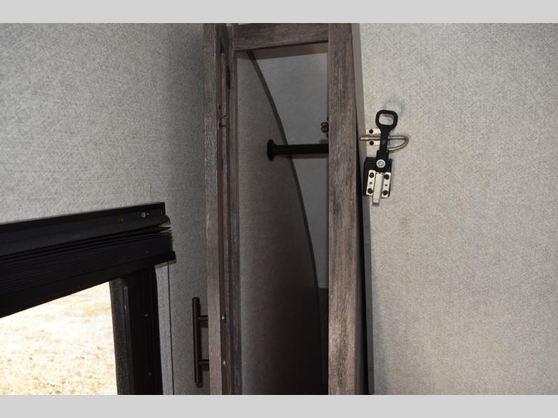 You can decide to leave for the weekend, easily hitch up and load up, and take off! Then enjoy the great outdoors with a 12' full-length power awning with adjustable legs, and the pass-through storage is where you will get your camping chairs, charcoal, and such. The USB charging outlets will keep your electronics running, and the queen Murphy bed will give you a good night's rest after a fun day hiking, biking, or relaxing at your campsite. You will find a rear full bathroom offering a linen closet on top of all the basics needed to get cleaned up before bedtime. And the booth dinette will provide extra sleeping space when you aren't playing games or eating your meal inside.