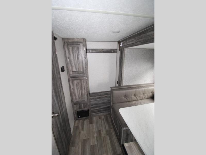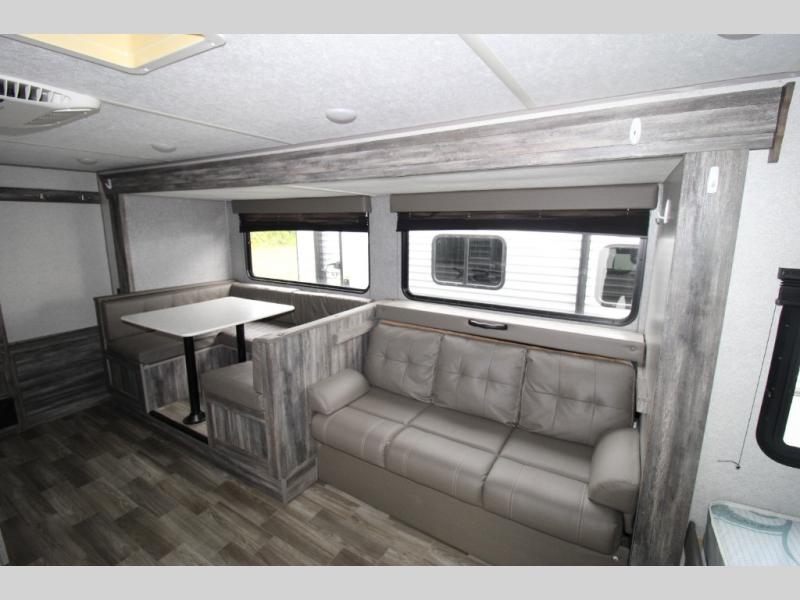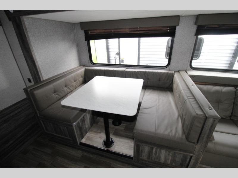 Whether you love to be inside or outside, this trailer has you covered! From the wall to wall panoramic windows giving you lots of natural lighting and great views to having a pantry to carry all your dry goods, you will have lots of space throughout thanks to the large slide out. The cook will have all the appliances needed to make meals, and the U-shaped dinette provides plenty of space to eat meals, play games, and even sleep at night. There is storage for all your things including above the queen bed up front to in the outside compartment. You will even find a bonus bunk stored behind the jiffy sofa, Furrion solar prep and LED mushroom lights, USB charging outlets, and an upgraded appliance package.