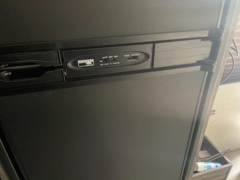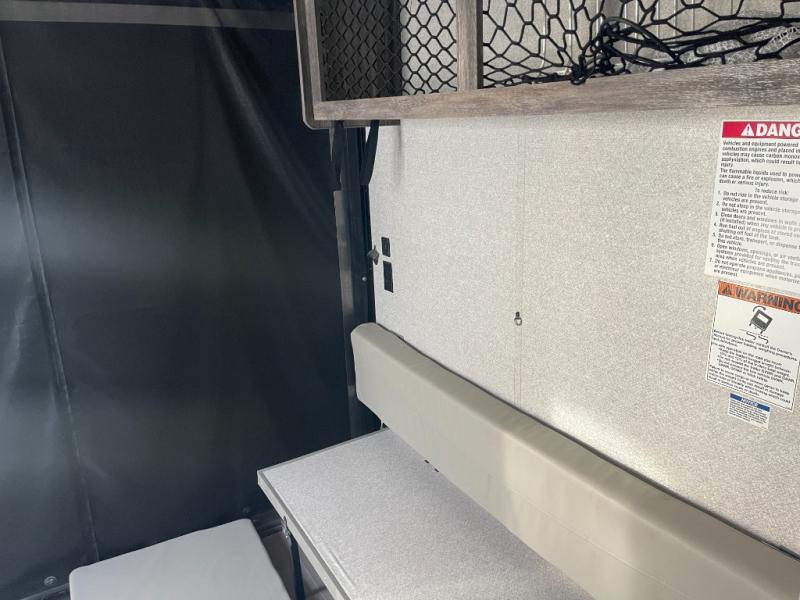 You don't have to leave your favorite off-road toys home with this toy hauler! They can easily be loaded with the 82" x 75" 3,000 lb. ramp door, and stored in the 13' 5" total garage length when you utilize the space to the front bed. Once you have arrived, you can set up the flip down sofa with removable table, unpack the pass-through storage, and grab a snack from the walk-in pantry. The private bathroom has a shower to freshen up in each morning. Prepare your best meals with the two burner cooktop and store any leftovers in the refrigerator. Get a good night's rest on the front queen bed, and store your belongings in the overhead cabinet.